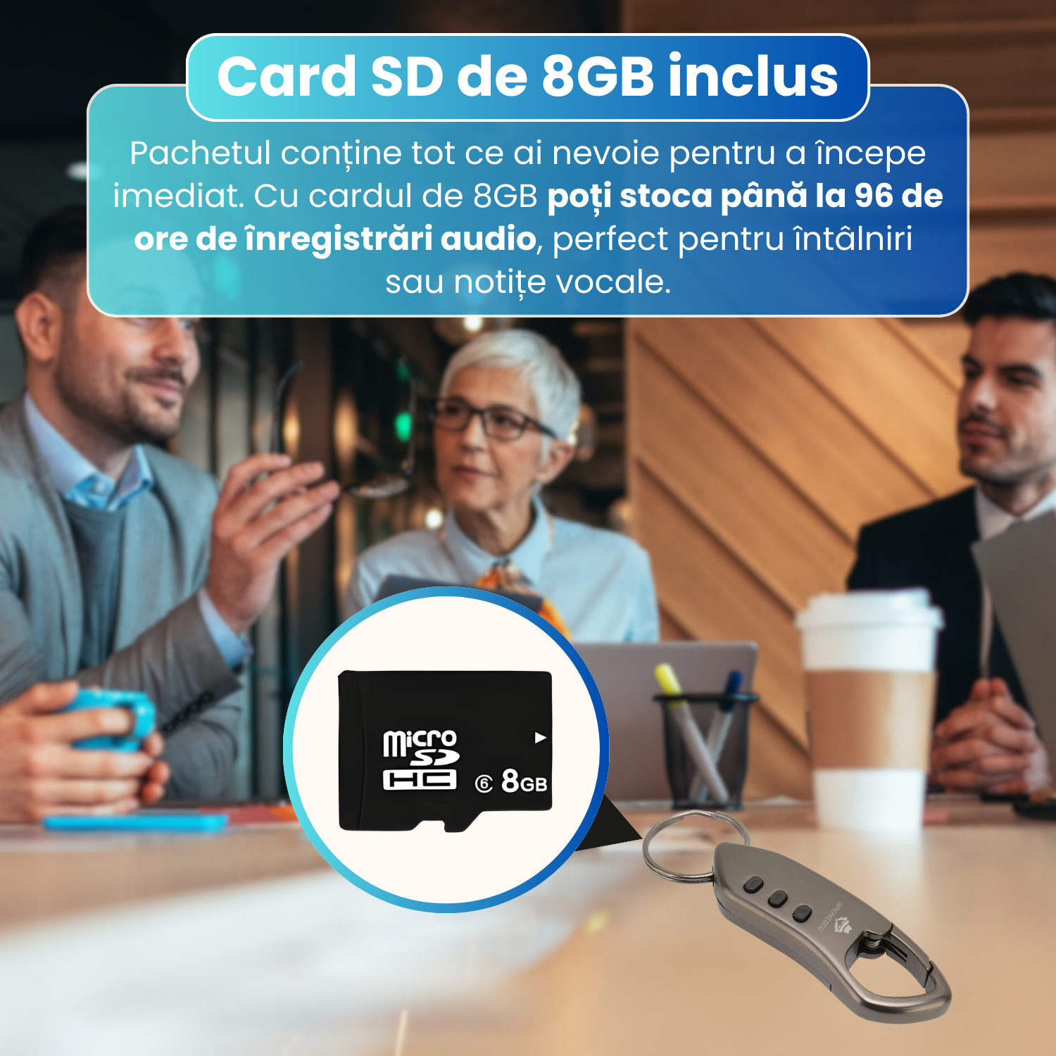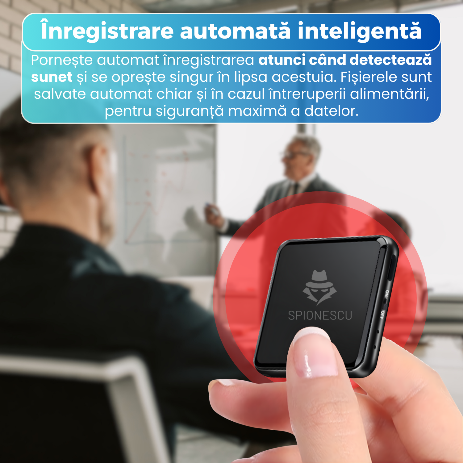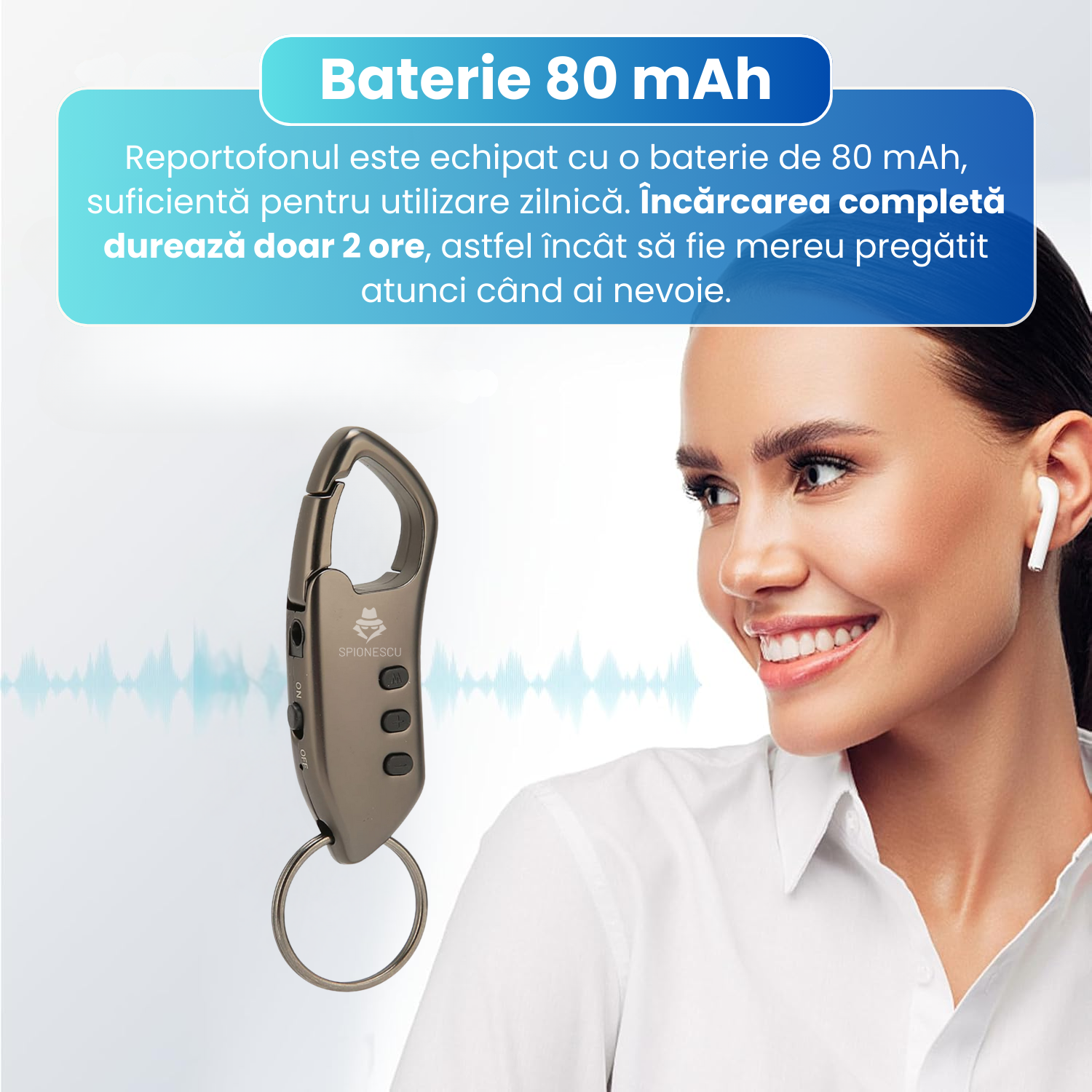Produsul este foarte bun, compact și elegant. Eu îl țin ca breloc și îl utilizez în special pentru înregistrarea cursurilor de la școală. Se activează când detectează un sunet, claritatea sunetului este buna, autonomia bateriei este ok. Recomand!