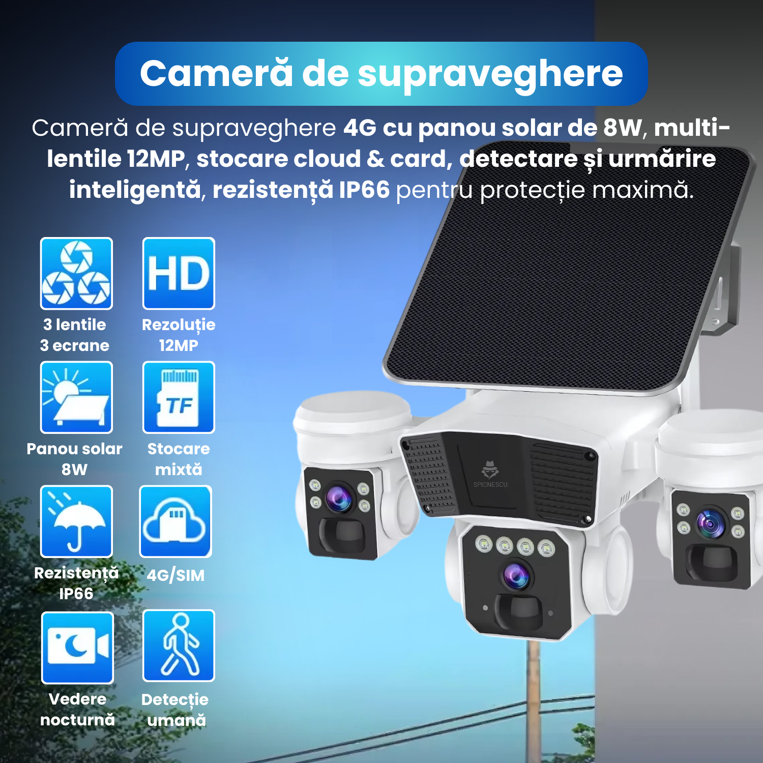Camera de supraveghere, Q6, 12MP, panou solar integrat, conexiune 4G, slot SIM, viziune nocturna, detectie miscarare, audio bidirectional, rezistenta la apa IP66