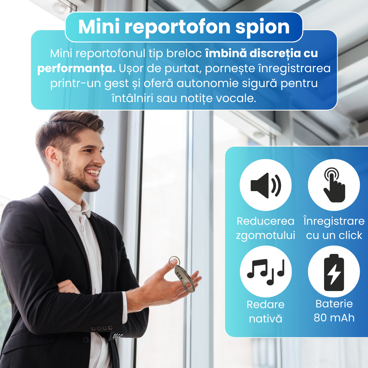 Reportofonul tip breloc este ambalat corepunzator si a ajuns rapid la easybox. Vine cu casti si cu cablu de incarcare. Inregistrarile sunt de inalta calitate chiar si tinut in buzunar. Poate fi folosit si ca mp3 player. Conectat la laptop il vede ca memorystick. Se poate seta data pentru evidenta inregistrarilor. Se poate seta lungimea segmentelor de inregistrare. Inregistreaza aproximativ 10 ore. Il recomand pentru cursuri, interviuri, etc. Este mic si discret.