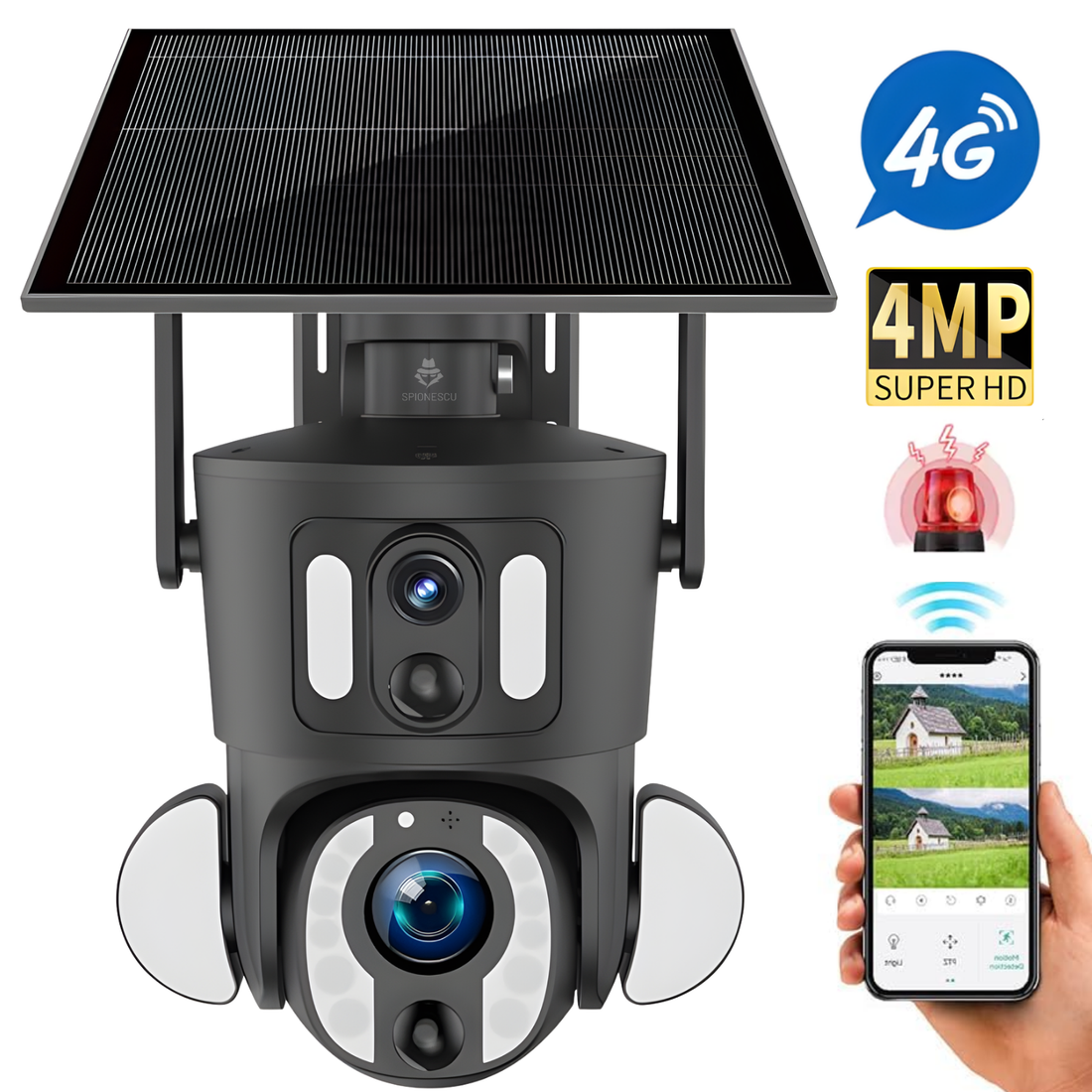 Camera de supraveghere dubla, Q32, 4G, 4MP, PTZ, CCTV, IP 66, panou solar 9W, vedere panoramica 360º, detectare AI, night vision color, infrarosu, comunicare bidirectionala