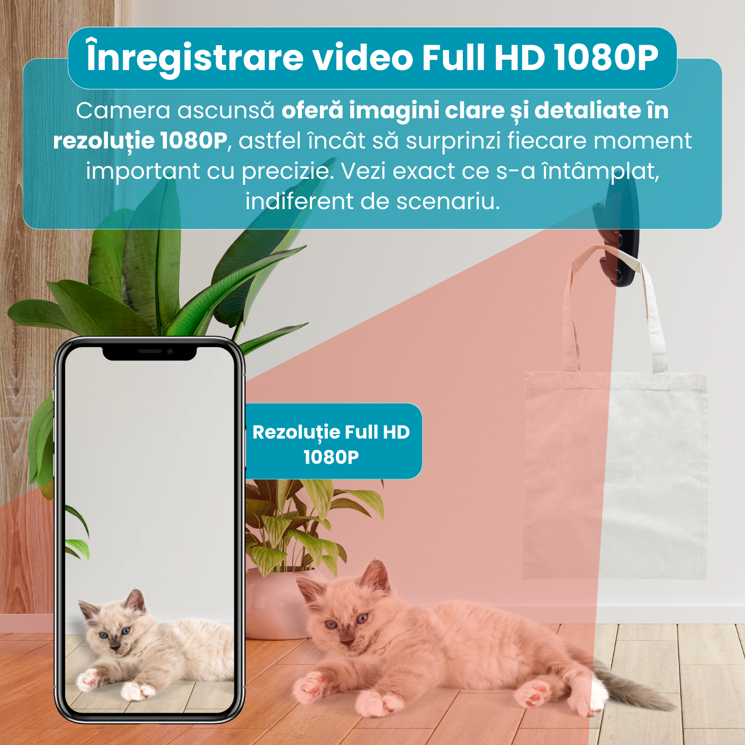 Micro camera ascunsa, VD06, WIFI, detectarea miscarii, vedere nocturna, 1080P, Android/iOS, baterie 1000 mAh, autonomie 5 ore