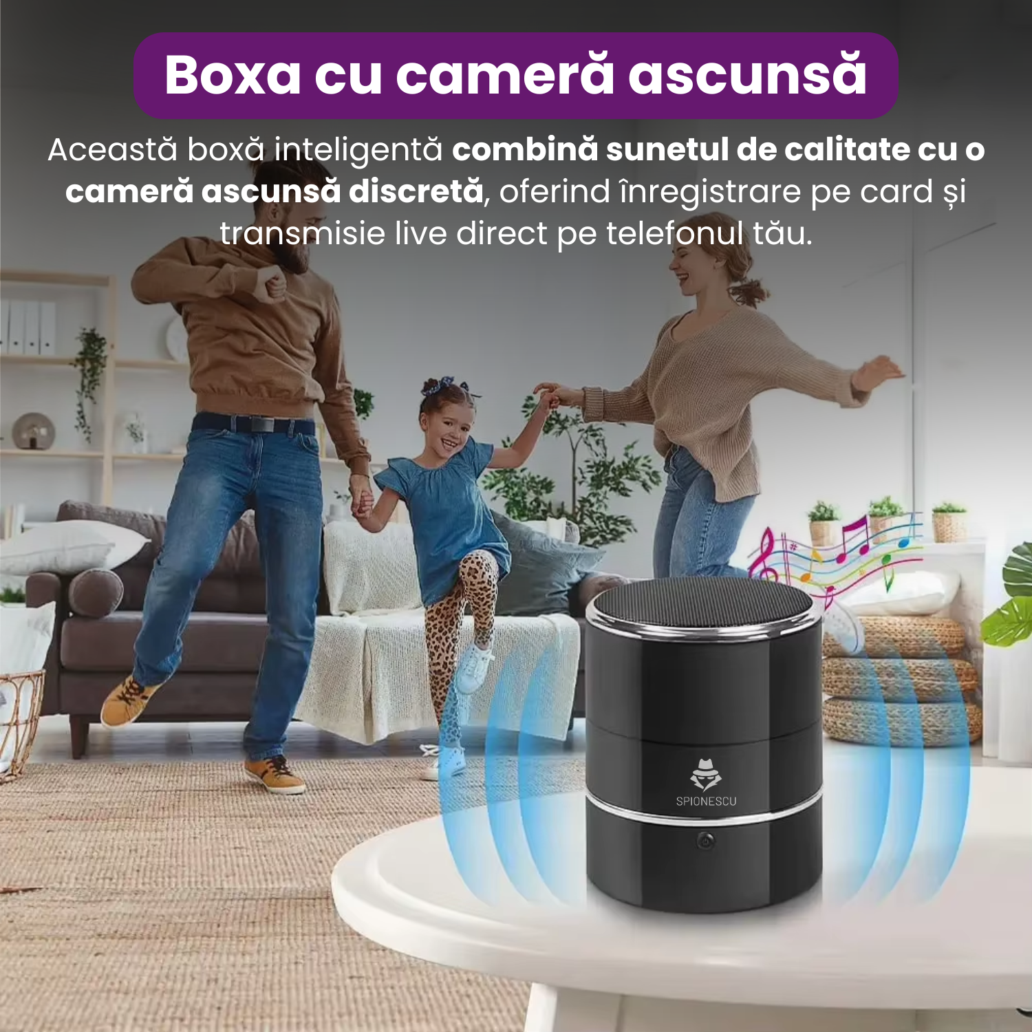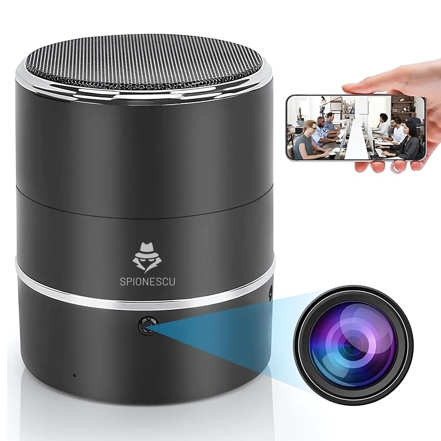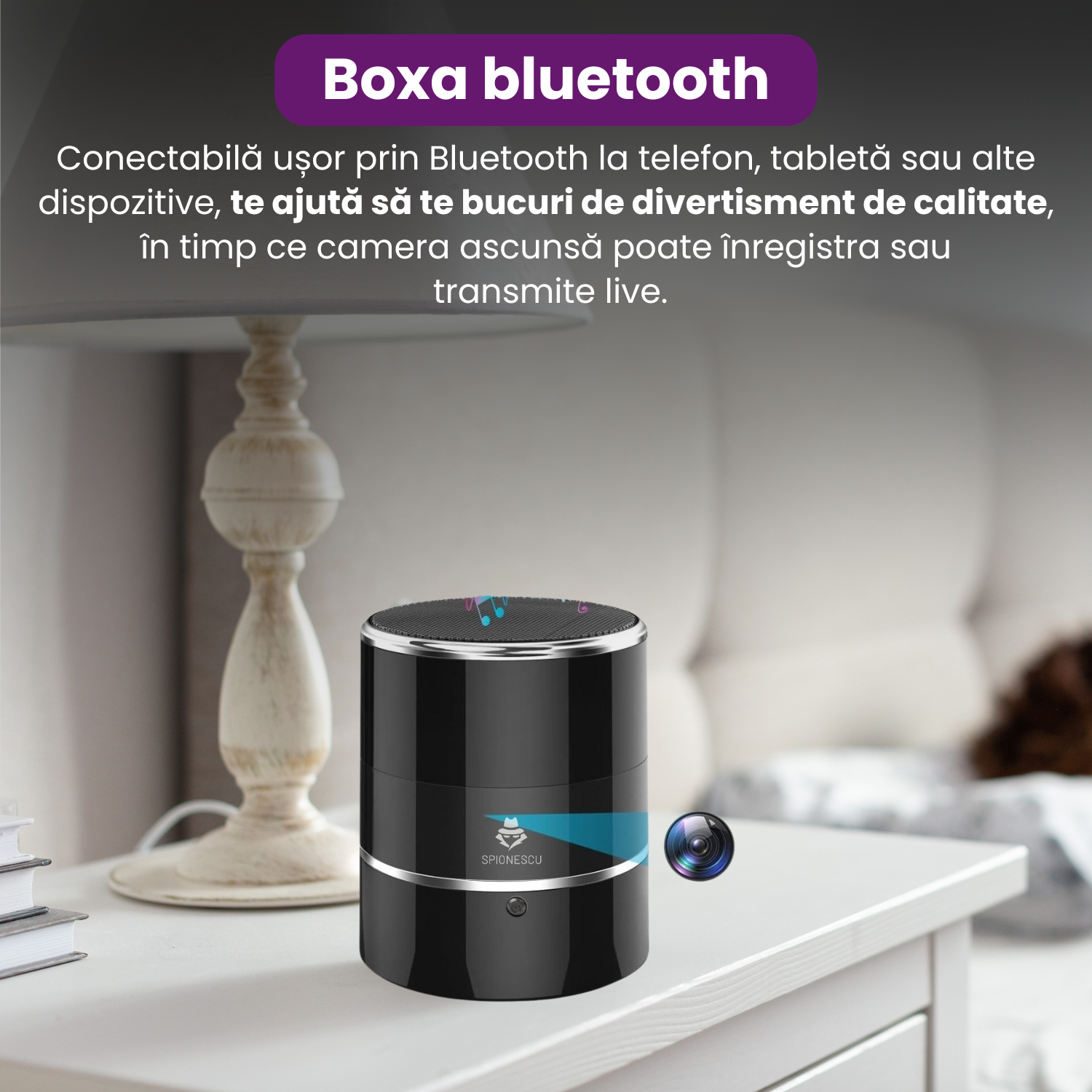 Boxa bluetooth cu camera ascunsa, Wifi, rotatie senzor 240°, detectia miscarii, Android/iOS, stocare card/cloud, 1080P, baterie 3000 mAh