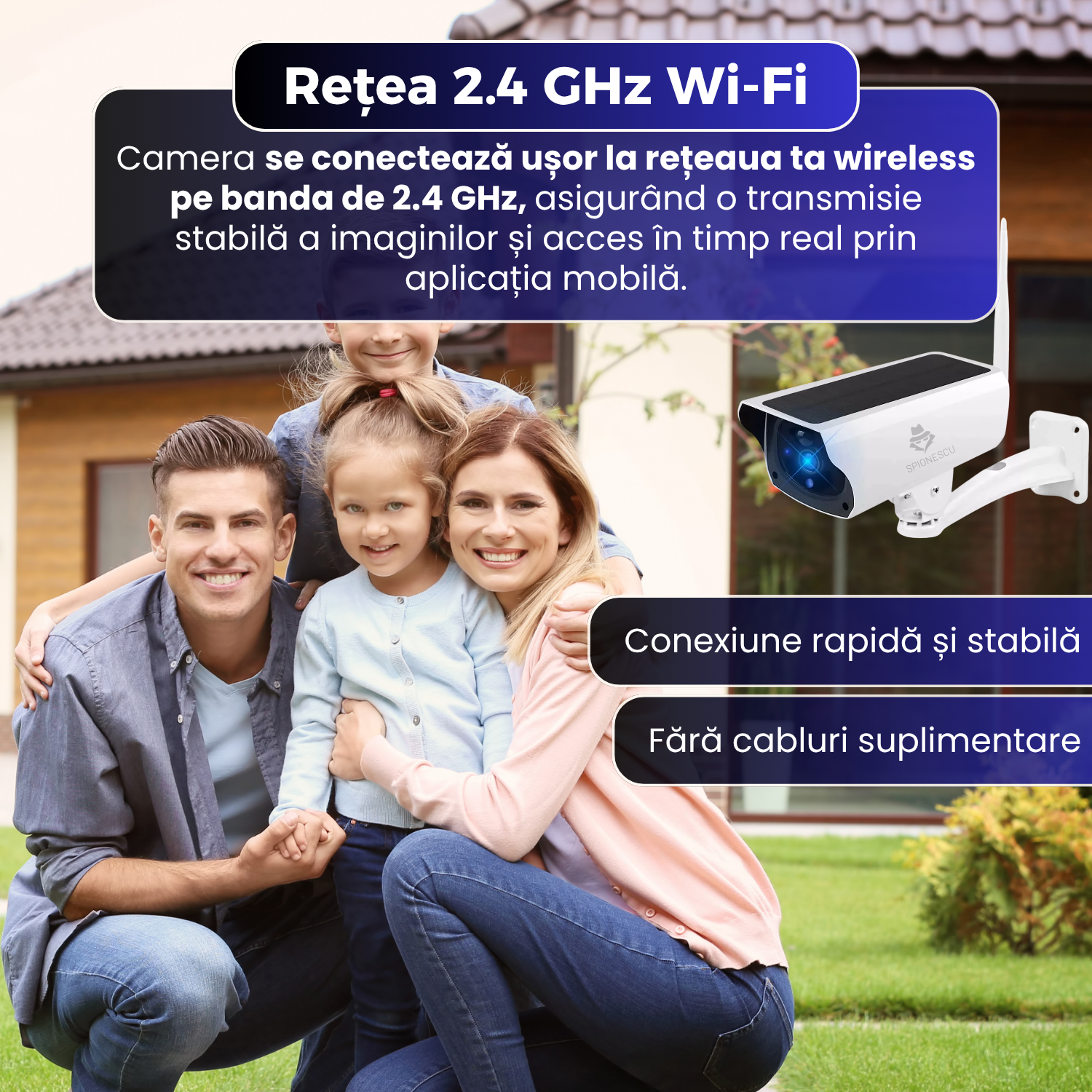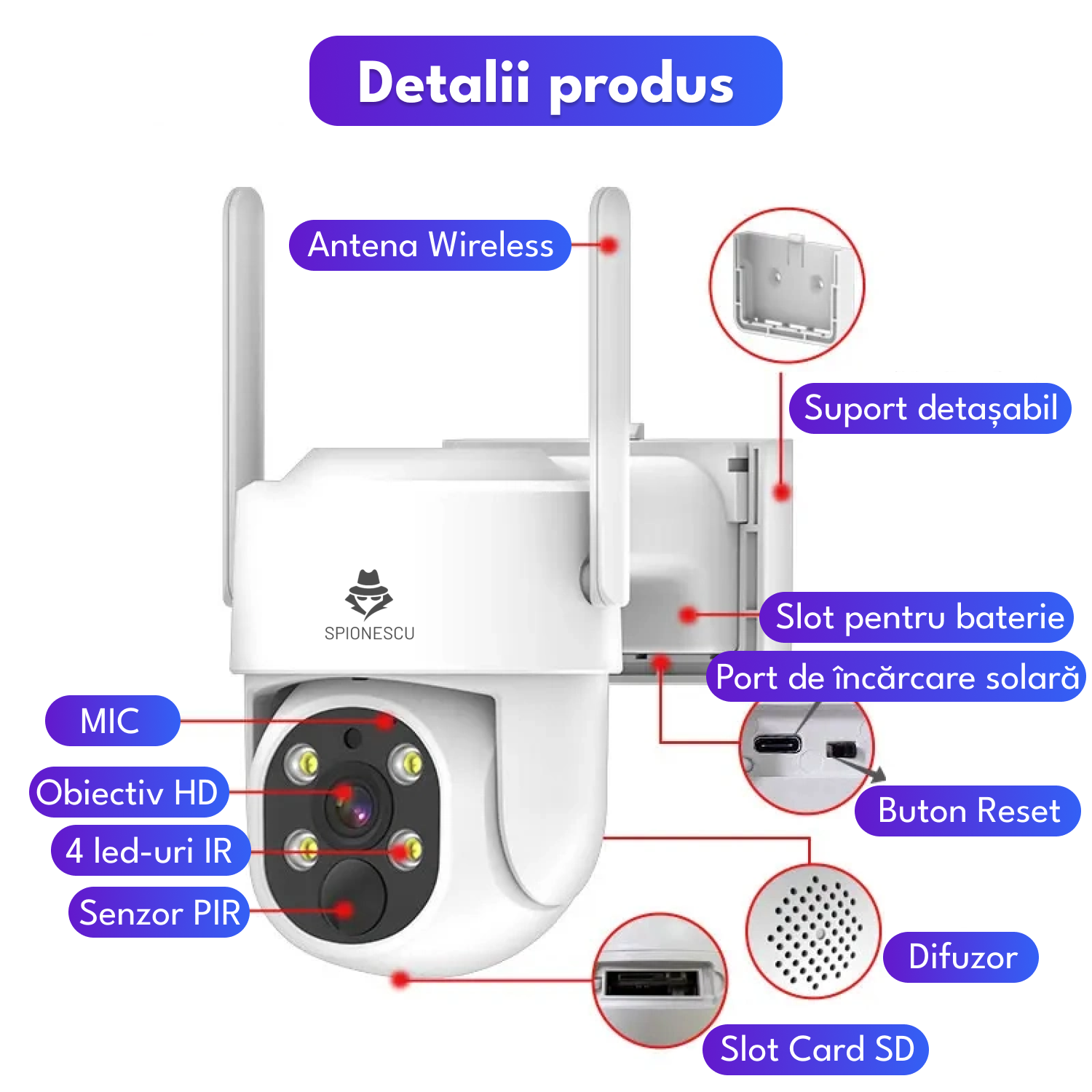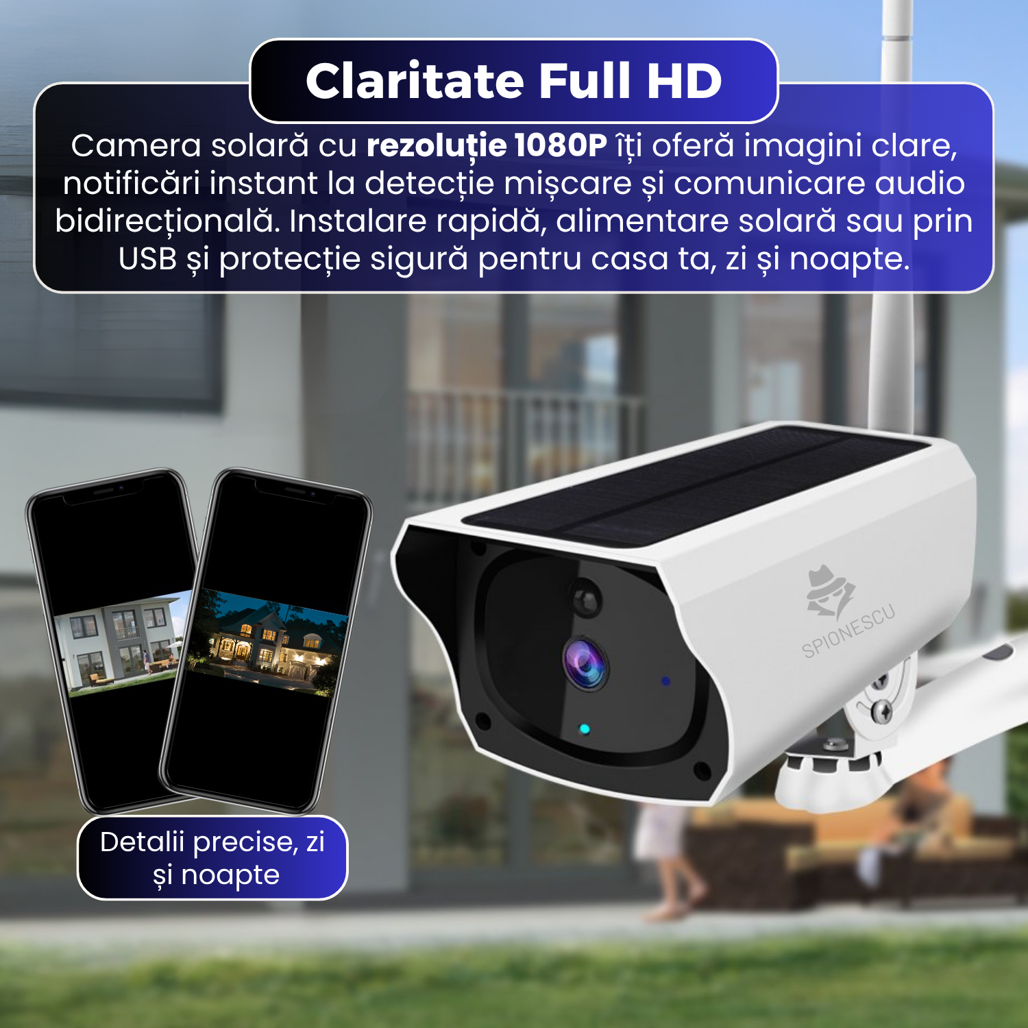 Camera de supraveghere WiFi cu panou solar, rezolutie 1080P Full HD, detectie PIR cu alerte push, audio bidirectional,vedere nocruna, rezistenta la intemperii, alimentare USB