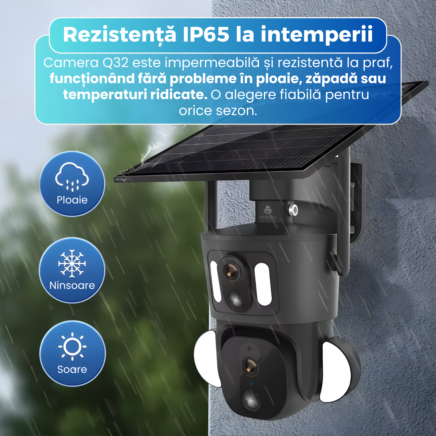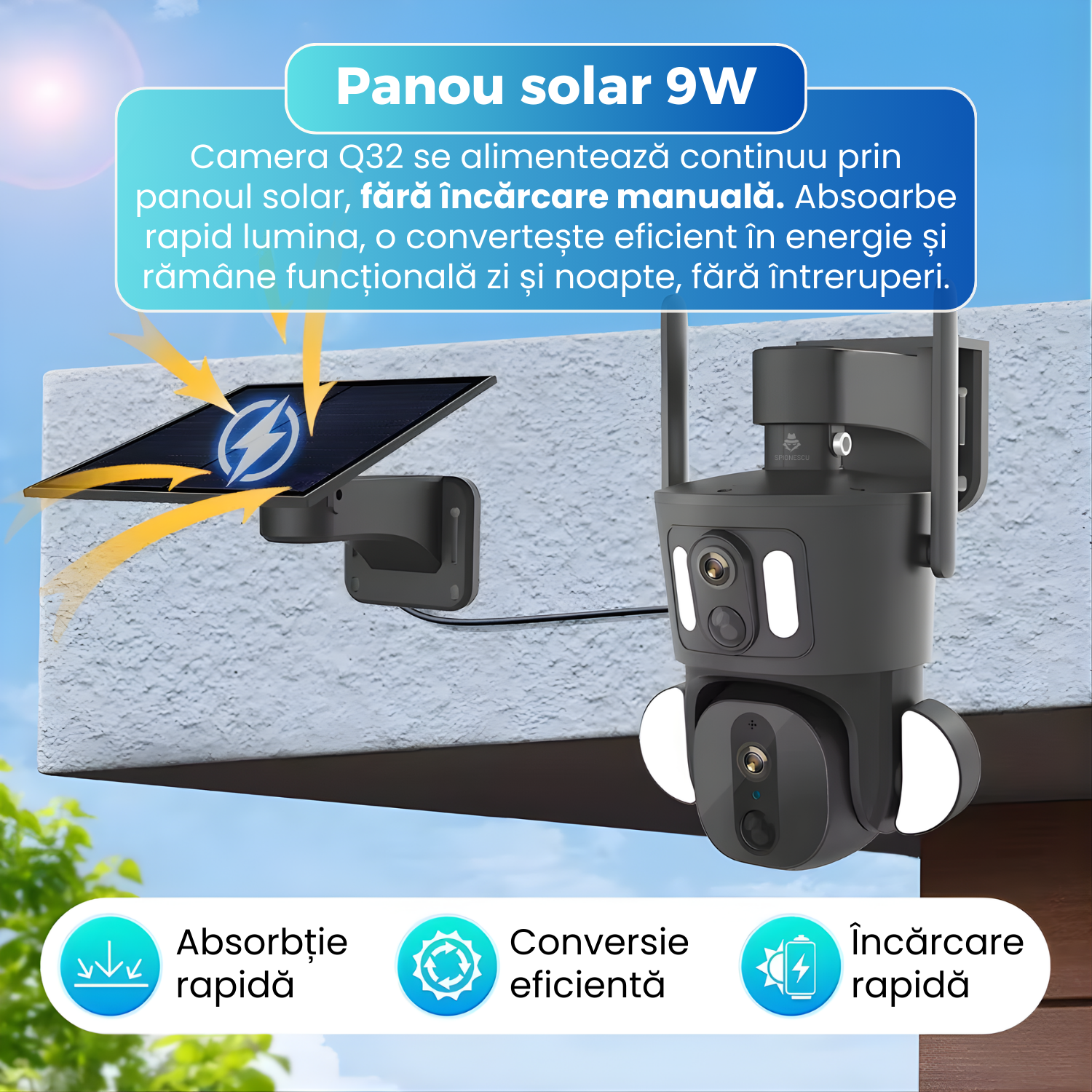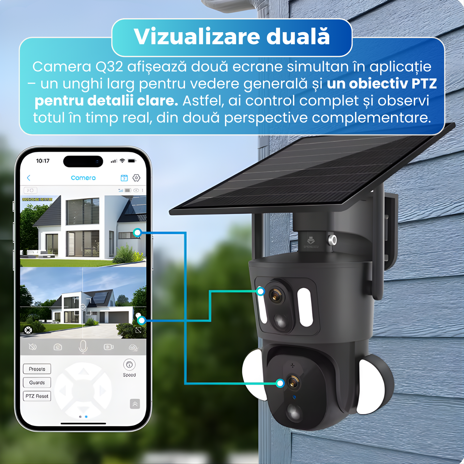 Camera de supraveghere dubla, Q32, 4G, 4MP, PTZ, CCTV, IP 66, panou solar 9W, vedere panoramica 360º, detectare AI, night vision color, infrarosu, comunicare bidirectionala