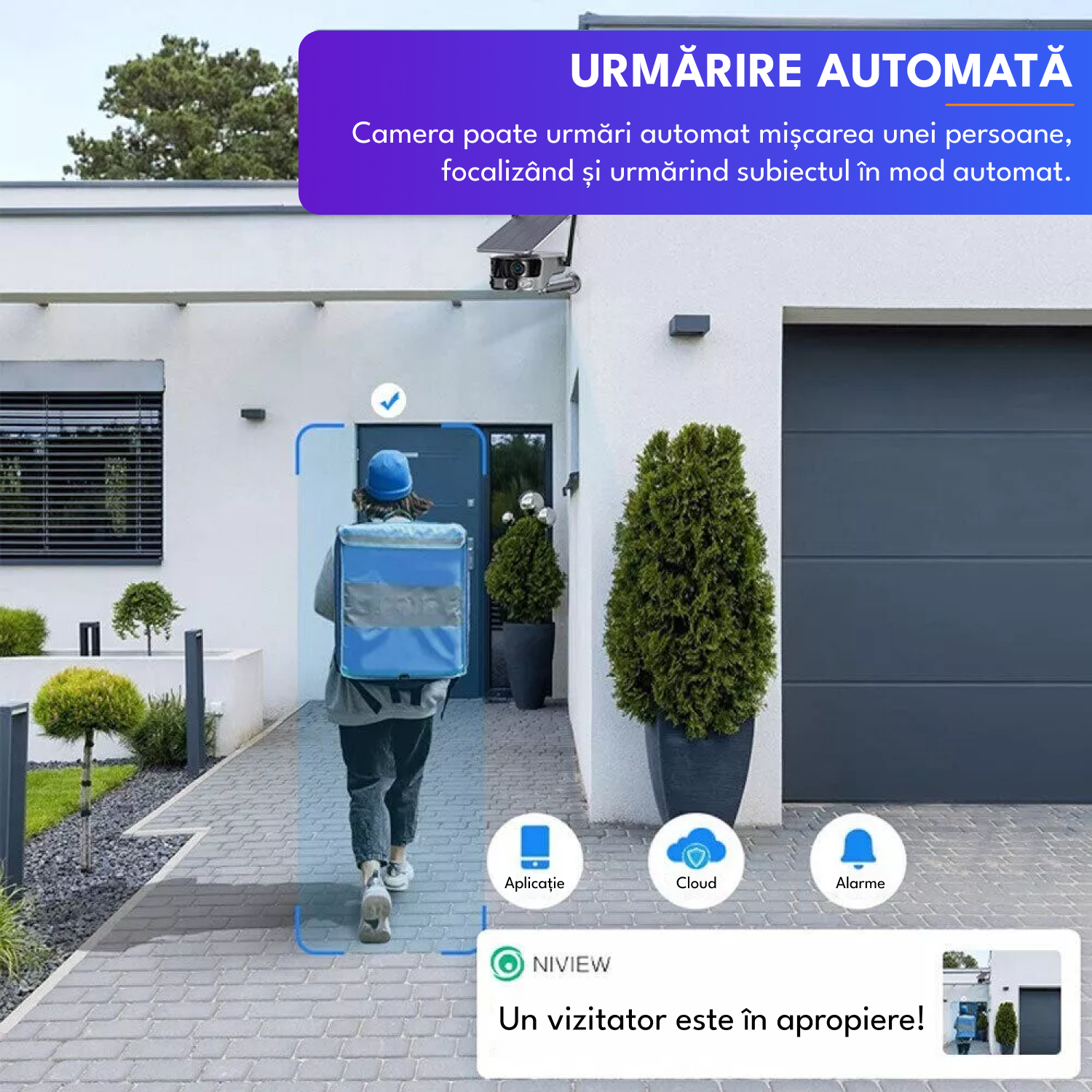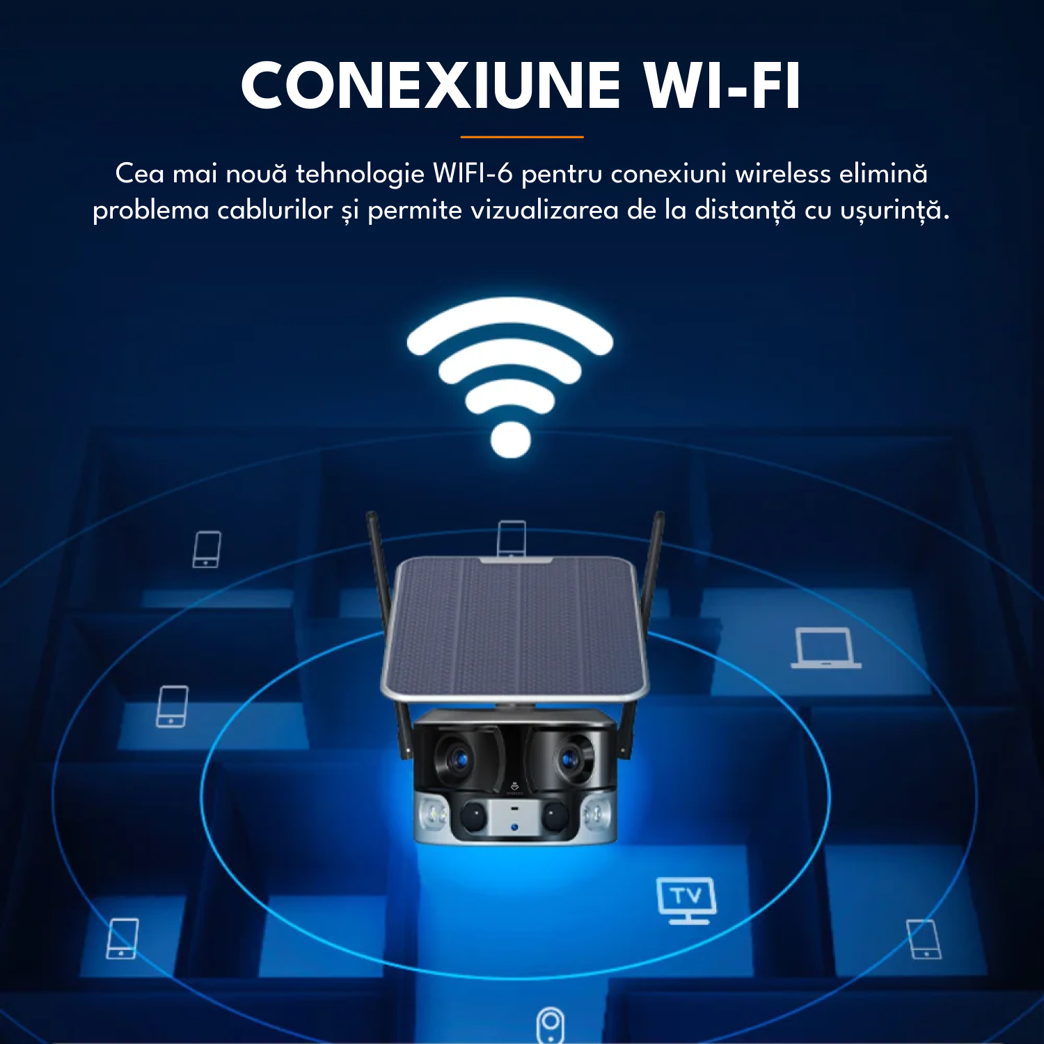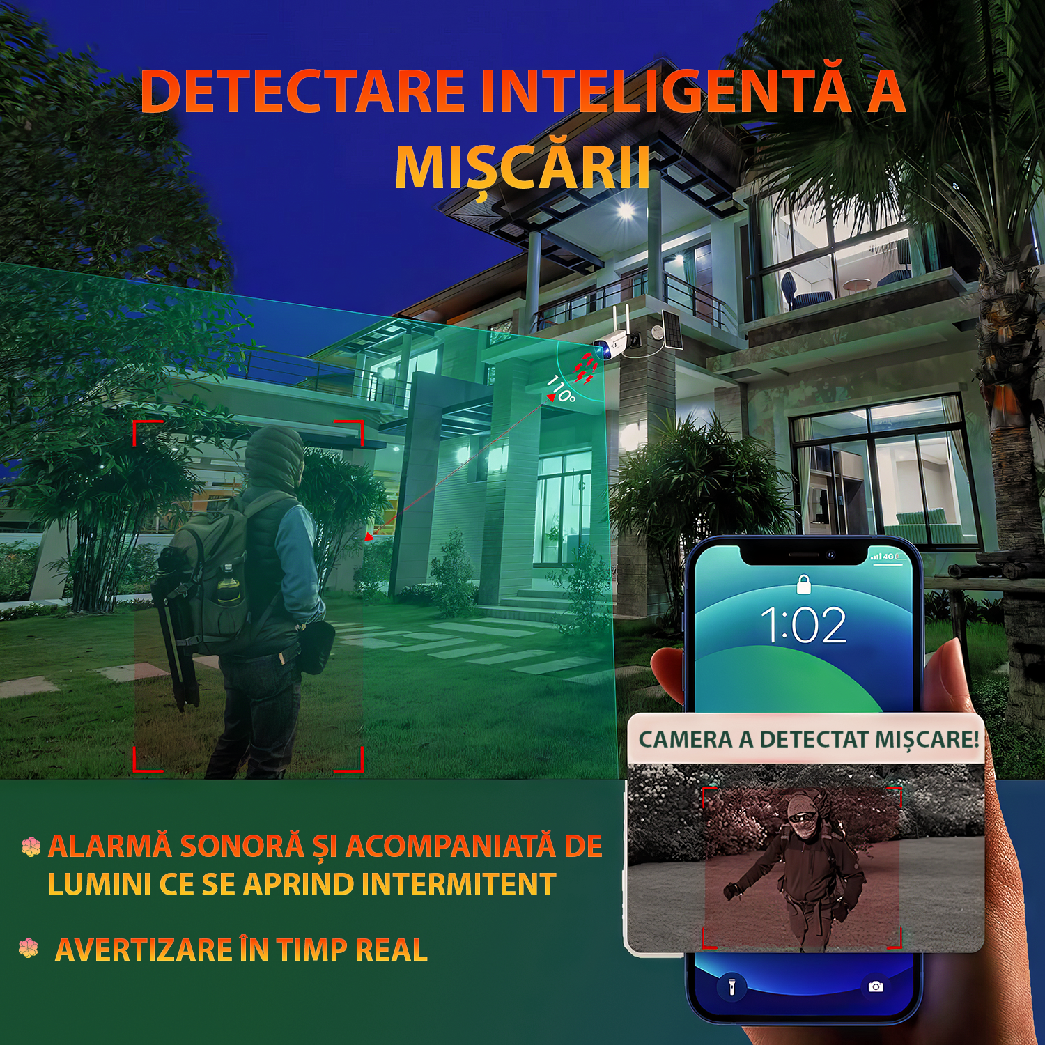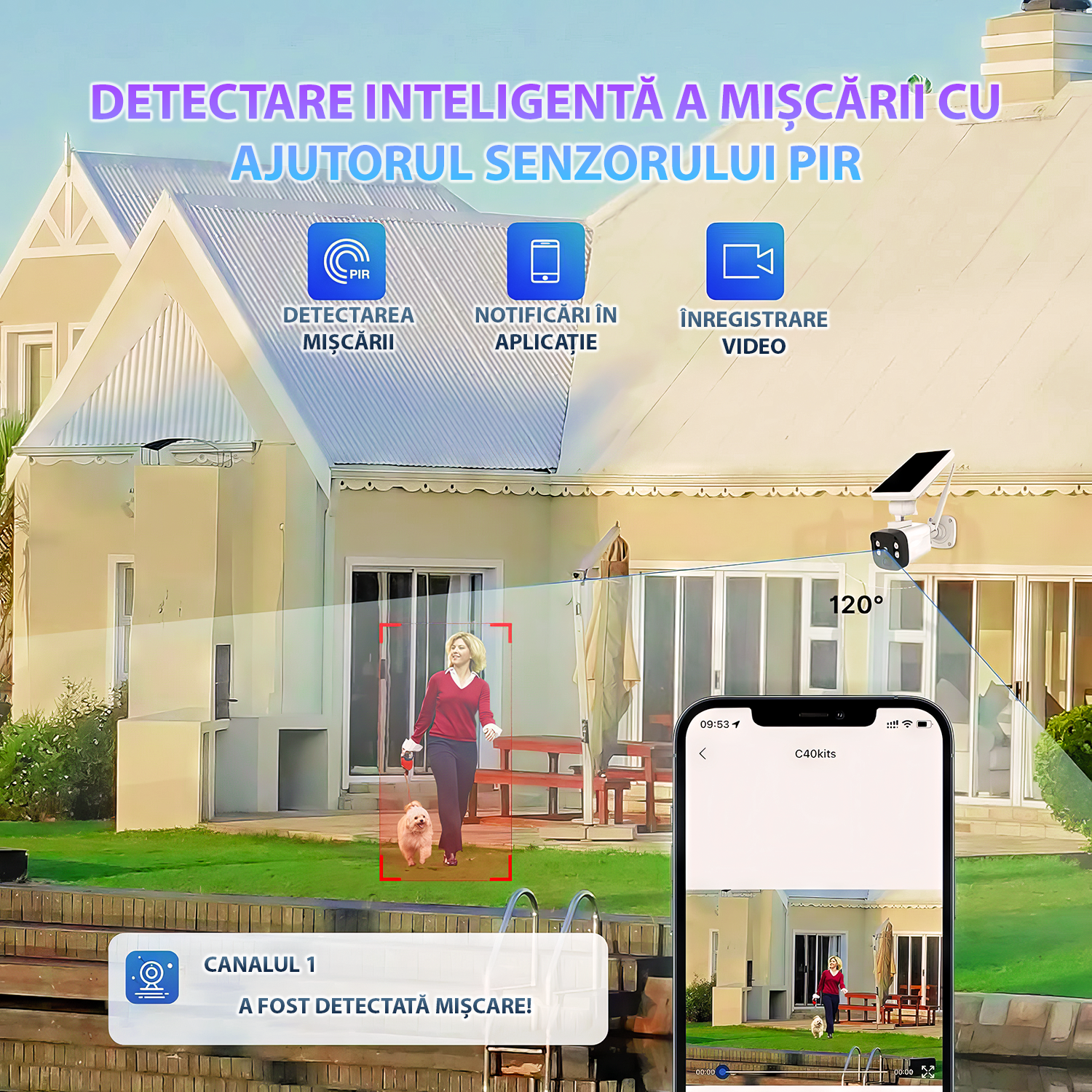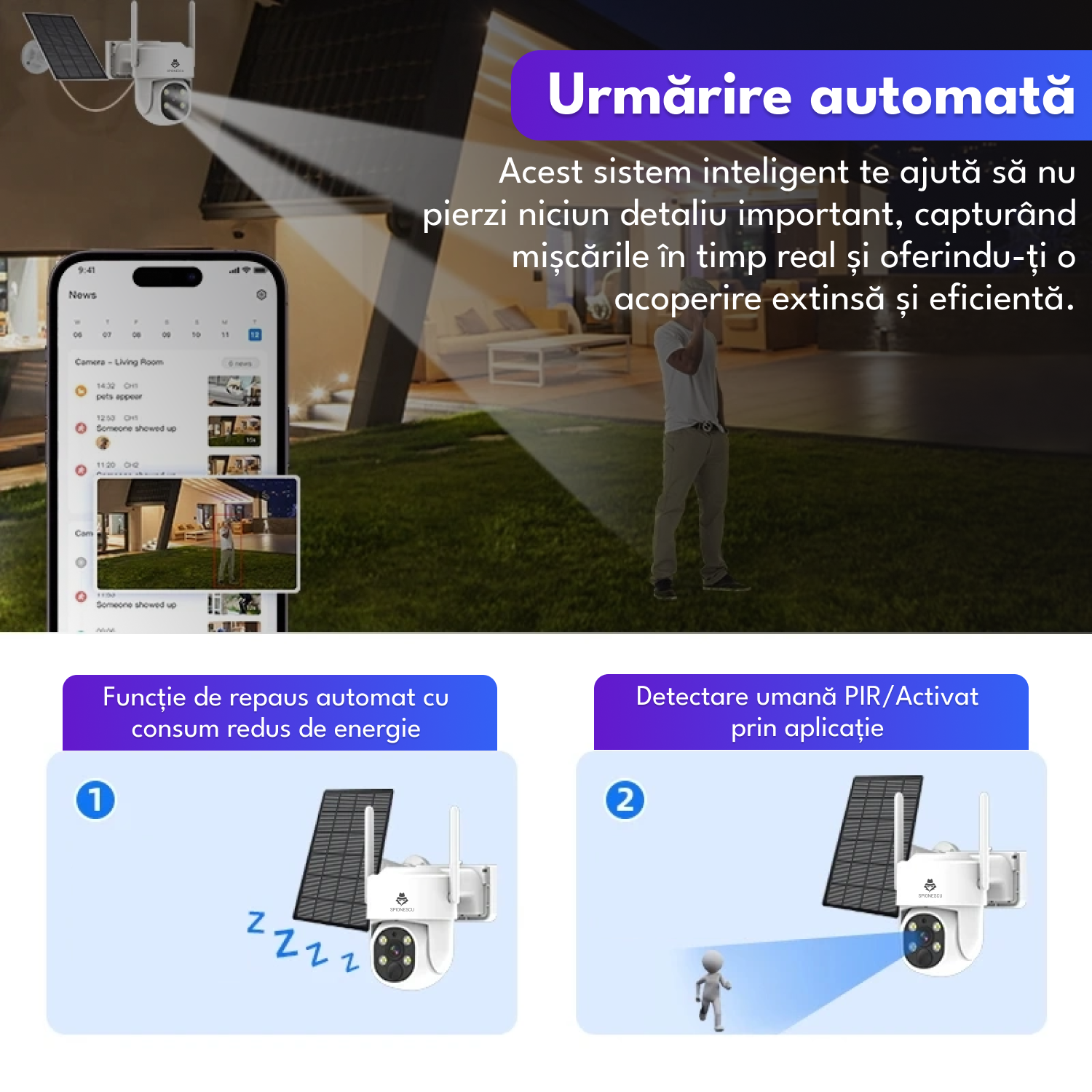 Camera de supraveghere cu incarcare solara, WIFI, 4K, 8MP, detectie umana AI, vizualizare panoramica 180°, senzor miscare, alerta telefon, CCTV, viziune nocturna, microfon