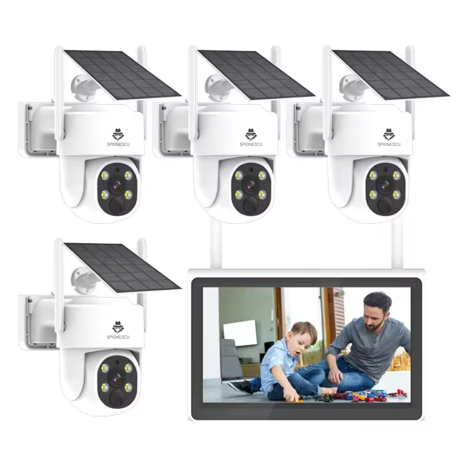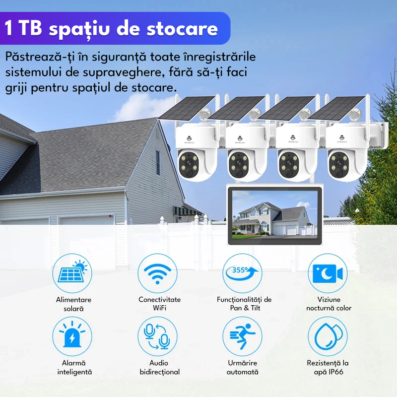 Kit complet de supraveghere video cu 4 camere si incarcare solara, ASIH20, WIFI, 4MP, HDD 1 TB, NVR 4 canale, audio bidirectional, senzor miscare, viziune nocturna, control PTZ, alb