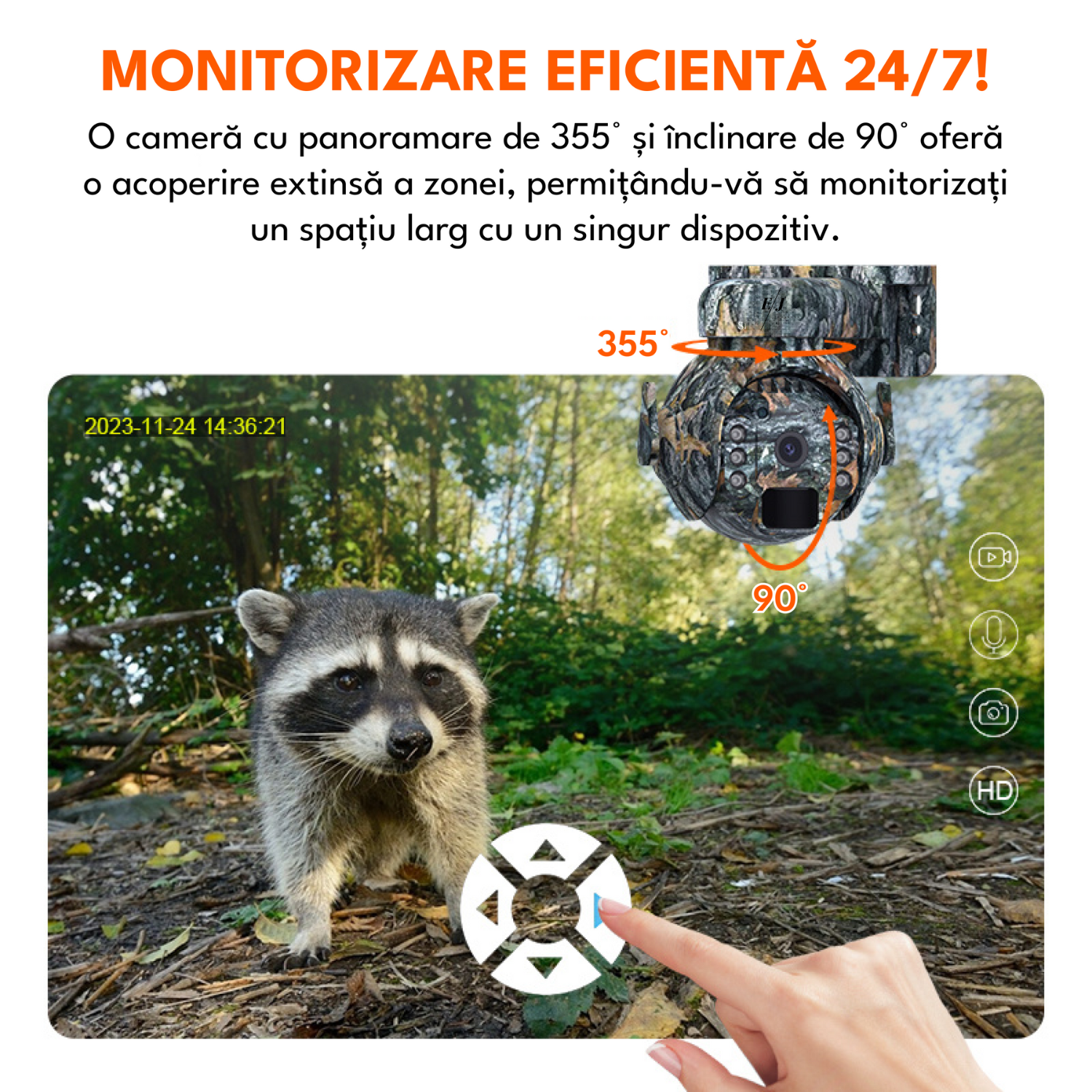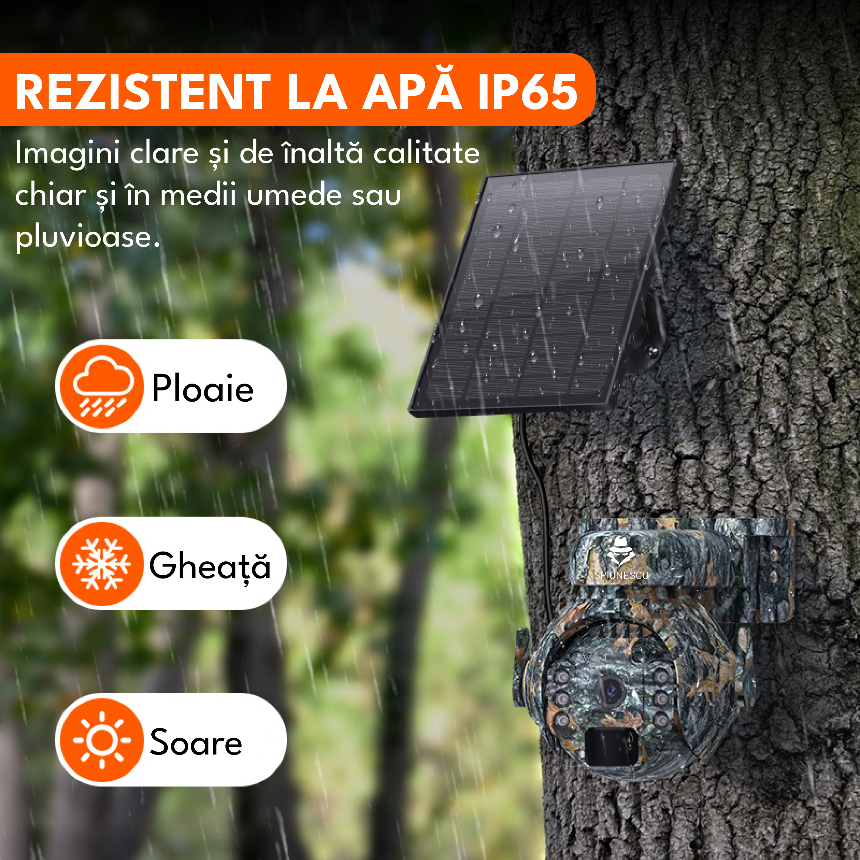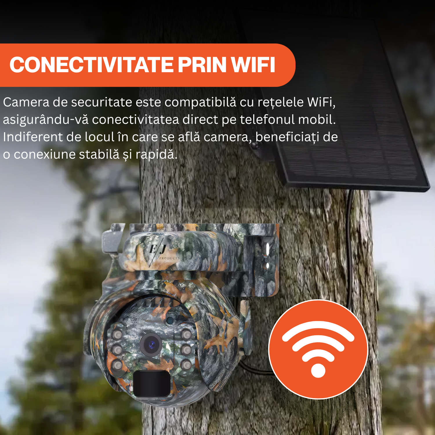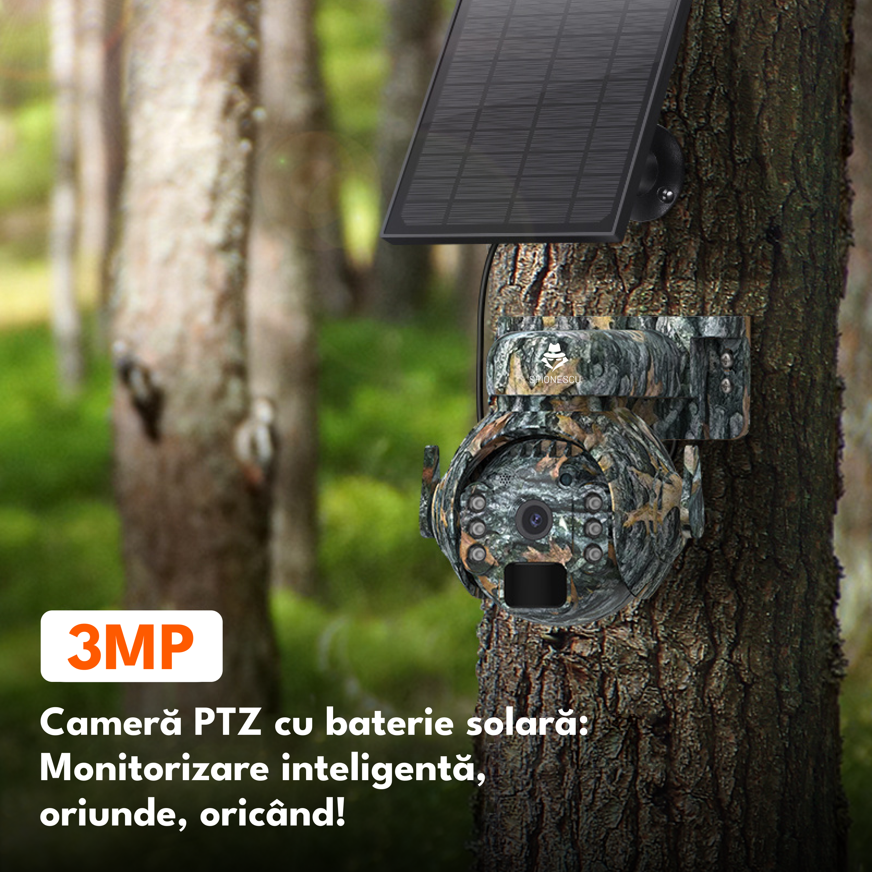 Camera de supraveghere, WiFi, 3MP, rotire 355°, inclinare 90°, alimentare solara, video, audio bidirectional, vizionare nocturna, detectarea miscarii, camuflaj