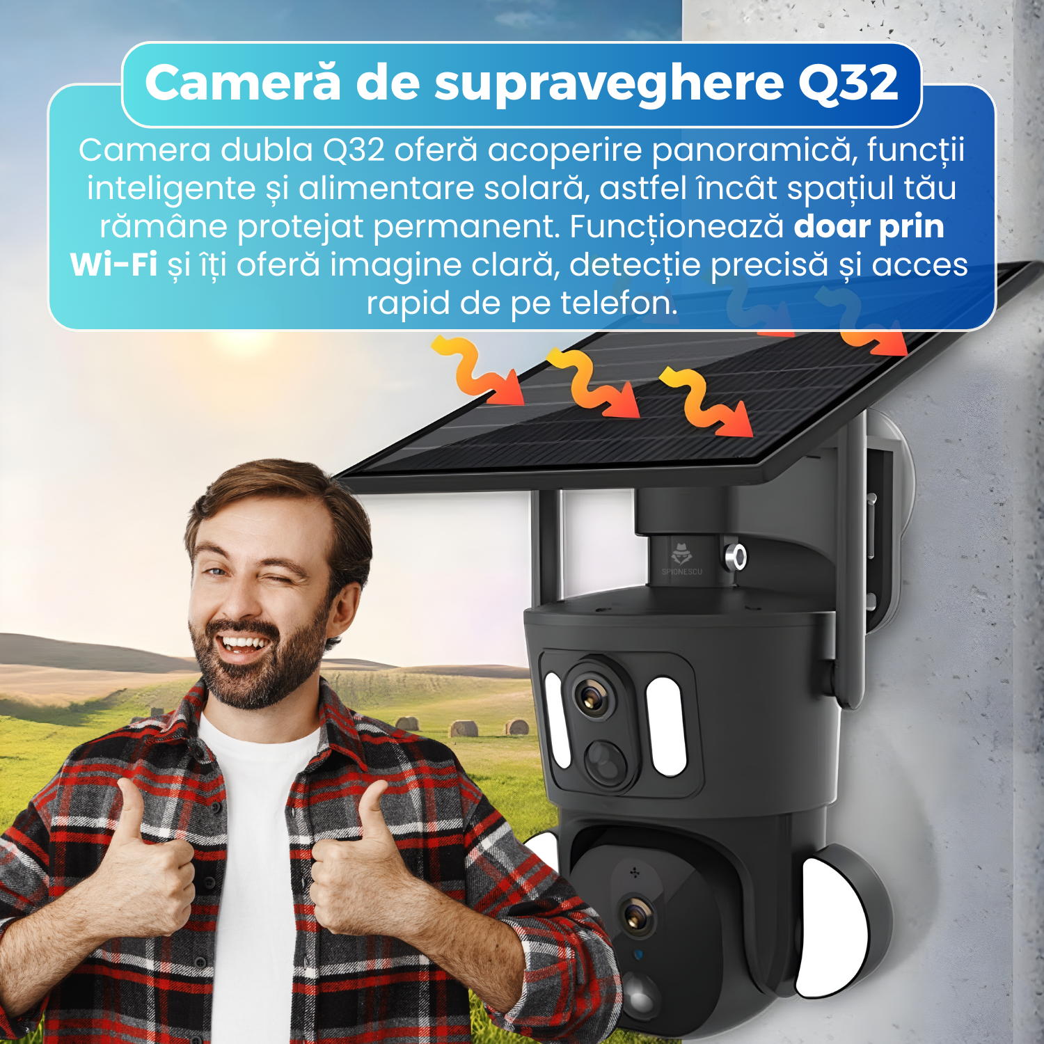 Camera de supraveghere dubla, Q32, WIFI, 4MP, PTZ, CCTV, IP 66, panou solar 9W, vedere panoramica 360º, detectare AI, night vision color, infrarosu, comunicare bidirectionala, negru