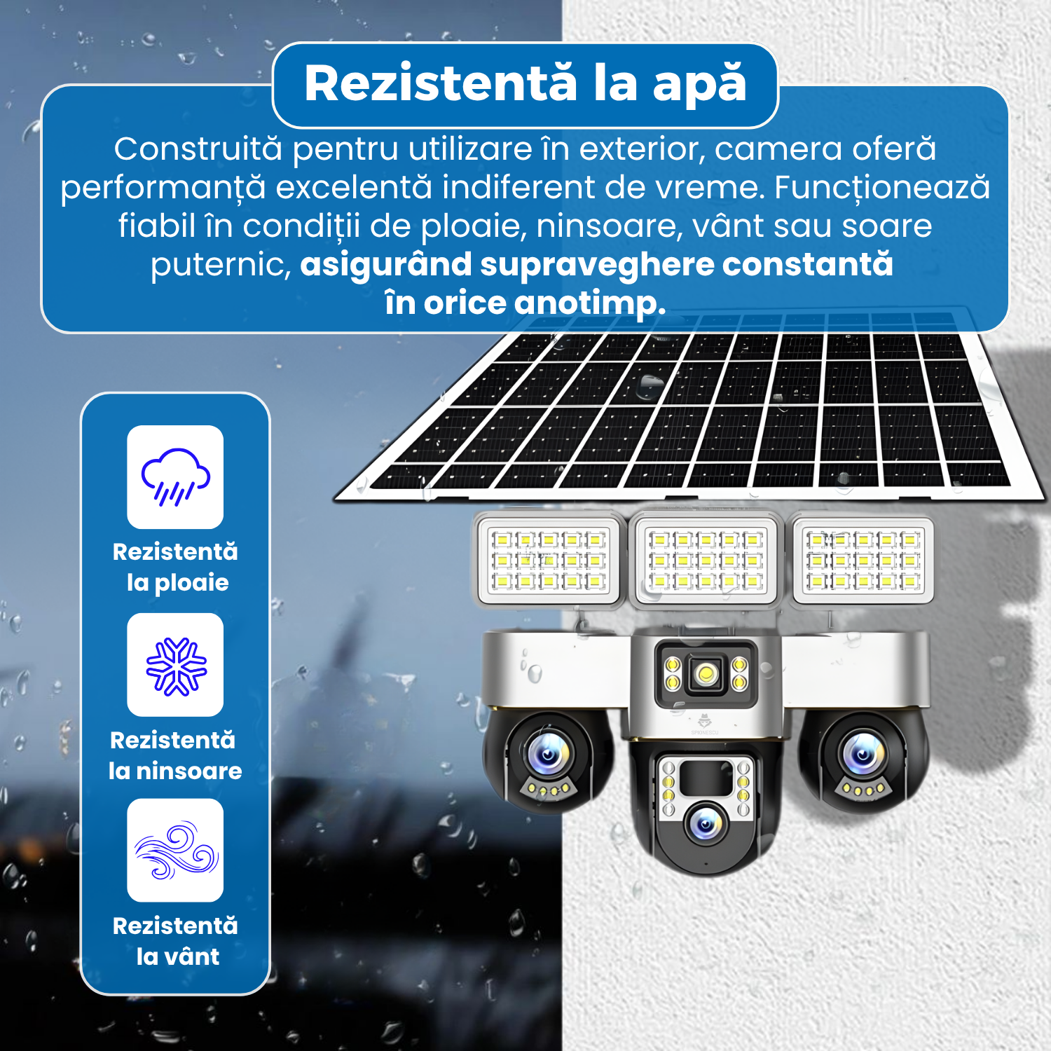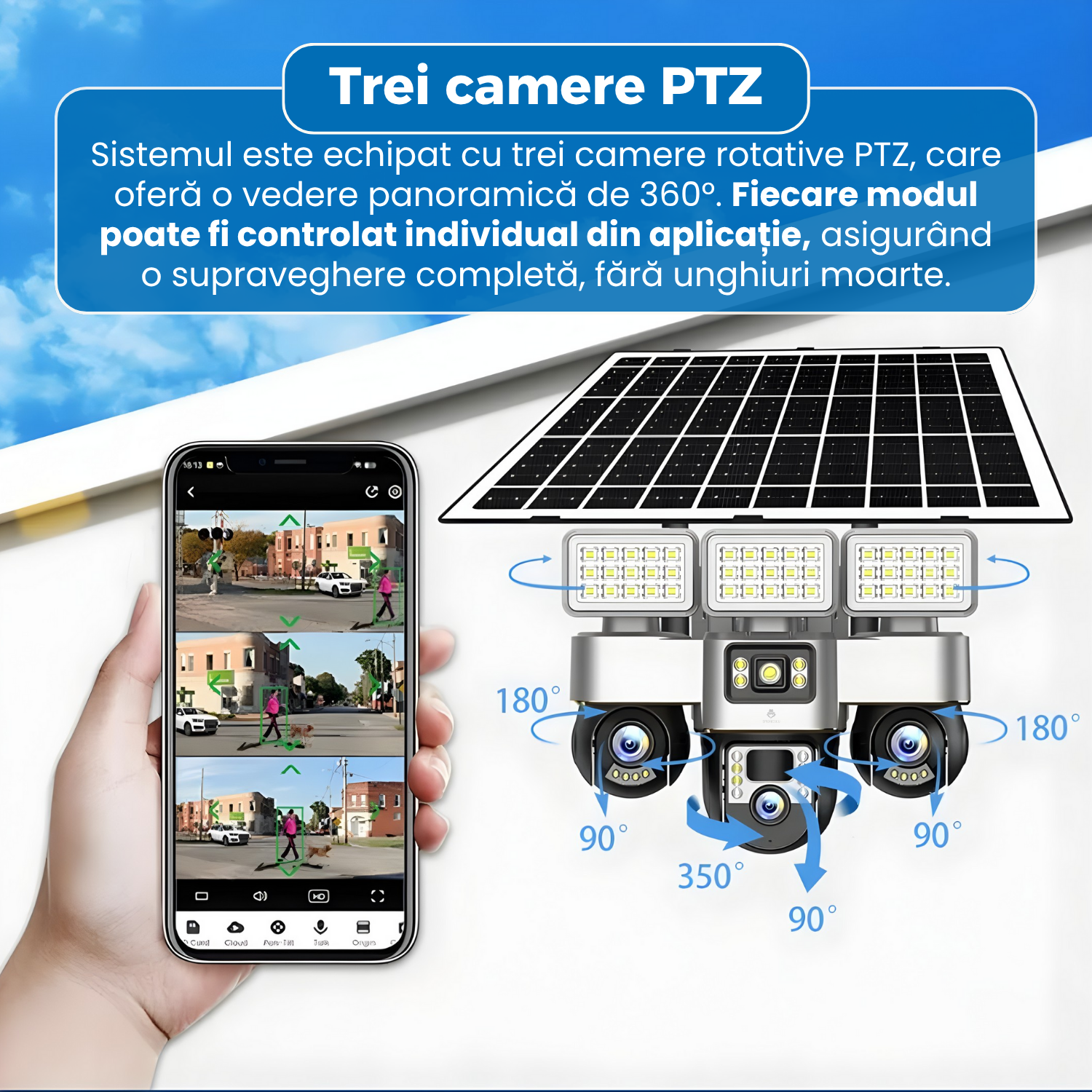 Camera de supraveghere cu panou solar, VC8, 4G, 3 lentile PTZ, 12 MP, detectie miscare, alarma sonora si luminoasa, viziune nocturna color, audio bidirectional, protectie IP66, stocare pe card TF si cloud