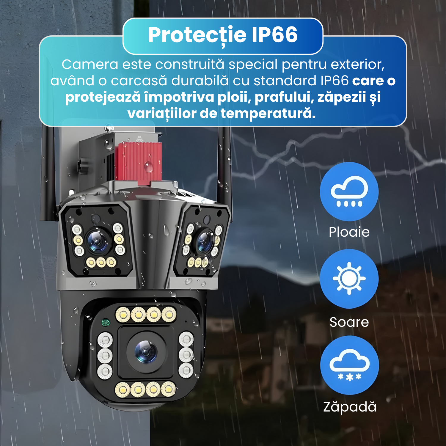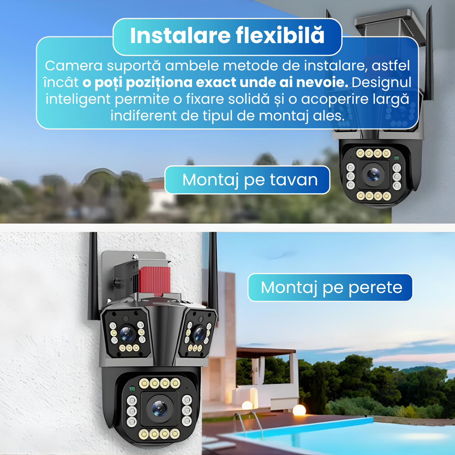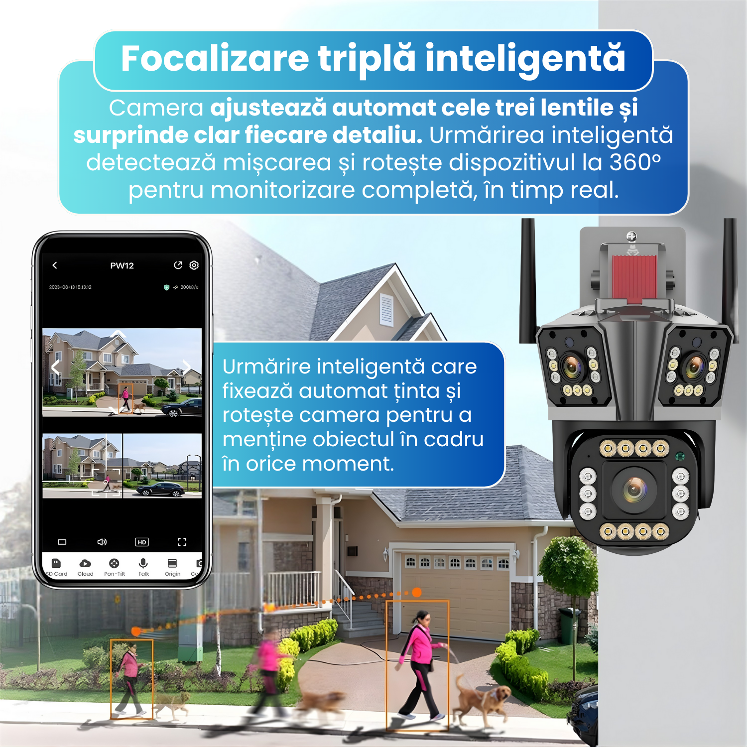 Camera de supraveghere tripla 4K, WIFI, 9MP, PTZ, CCTV, zoom 10x