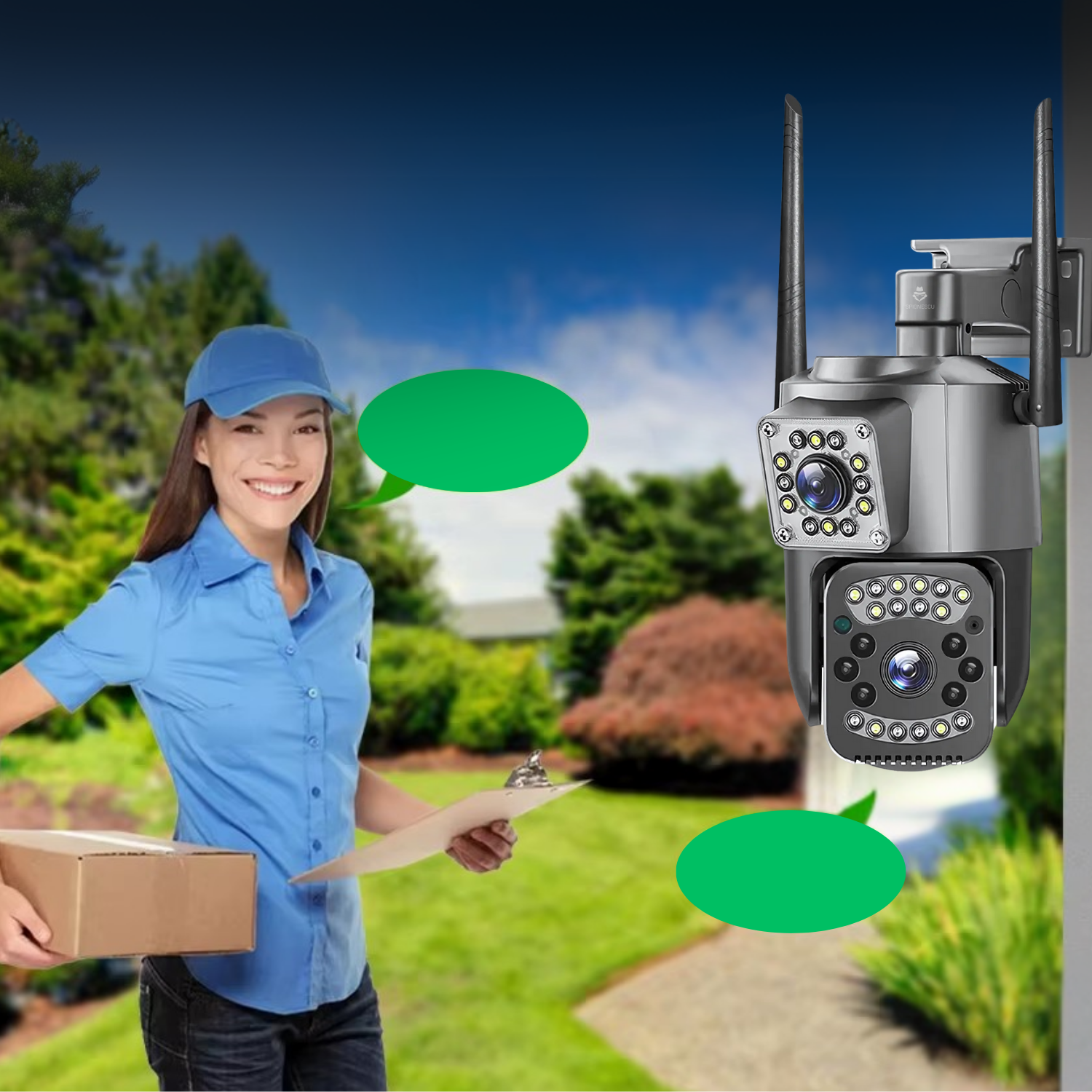 Camera de supraveghere dubla, Q32, 4G, 4MP, PTZ, CCTV, IP 66, panou solar 9W, vedere panoramica 360º, detectare AI, night vision color, infrarosu, comunicare bidirectionala