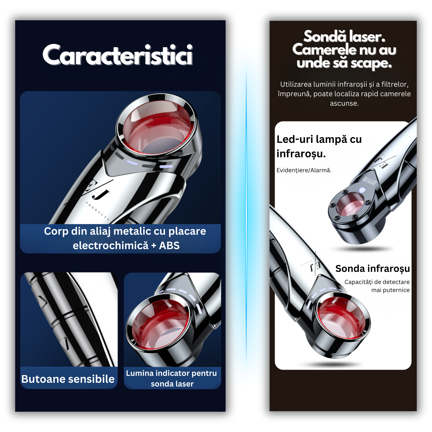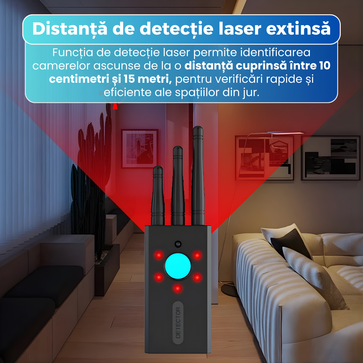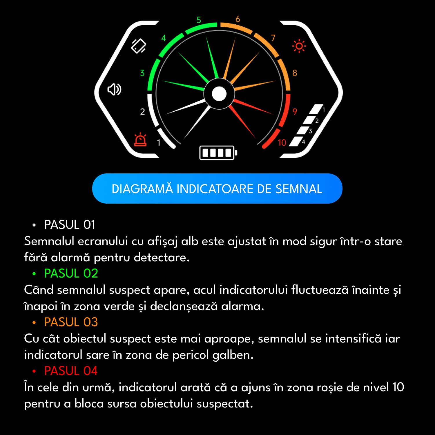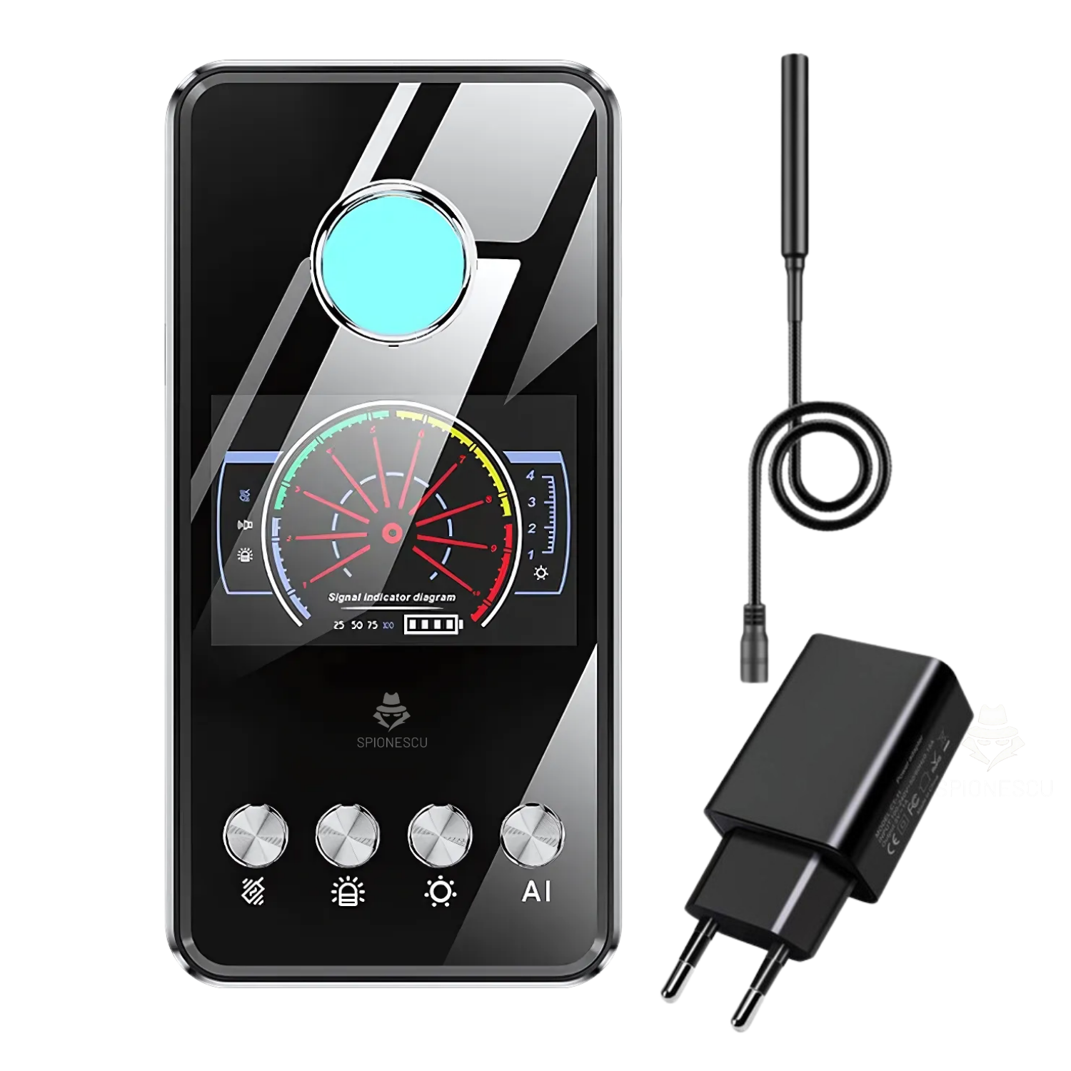 Detector Profesional Camere Ascunse, Microfoane si GPS AL-T2 — Tehnologie AI, 4 in 1, Scanare RF 1MHz–8GHz, Laser, Camp Magnetic, Alerta Automata, Portabil, Baterie 2000mAh