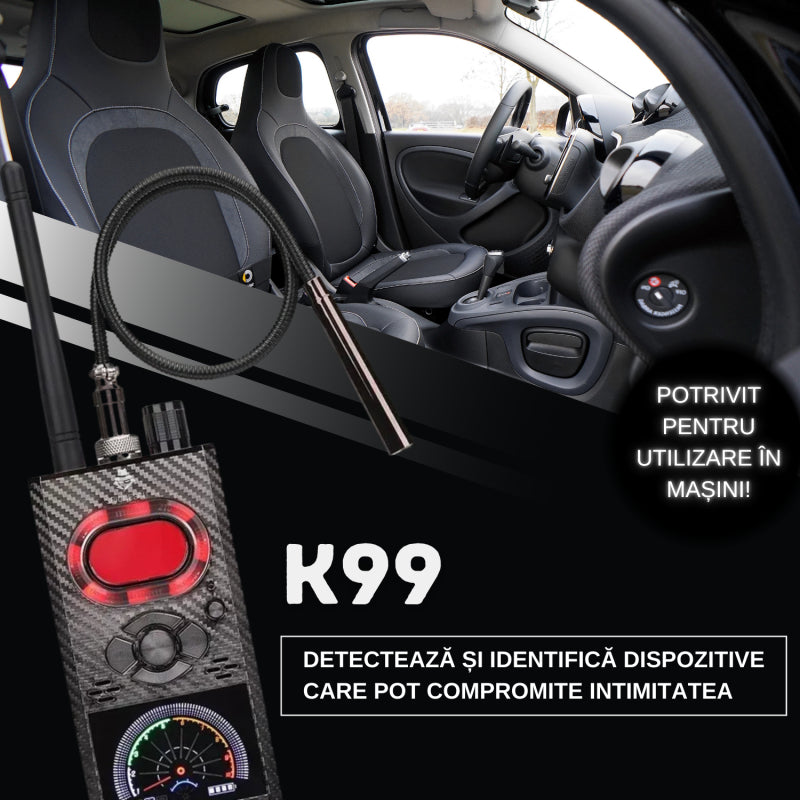 Detector profesional aparate spionaj, K99, camere, microfoane, localizatoare GPS sau GSM, autonomie 10h, LCD, functie AI, distanta detectare 10m, portabil