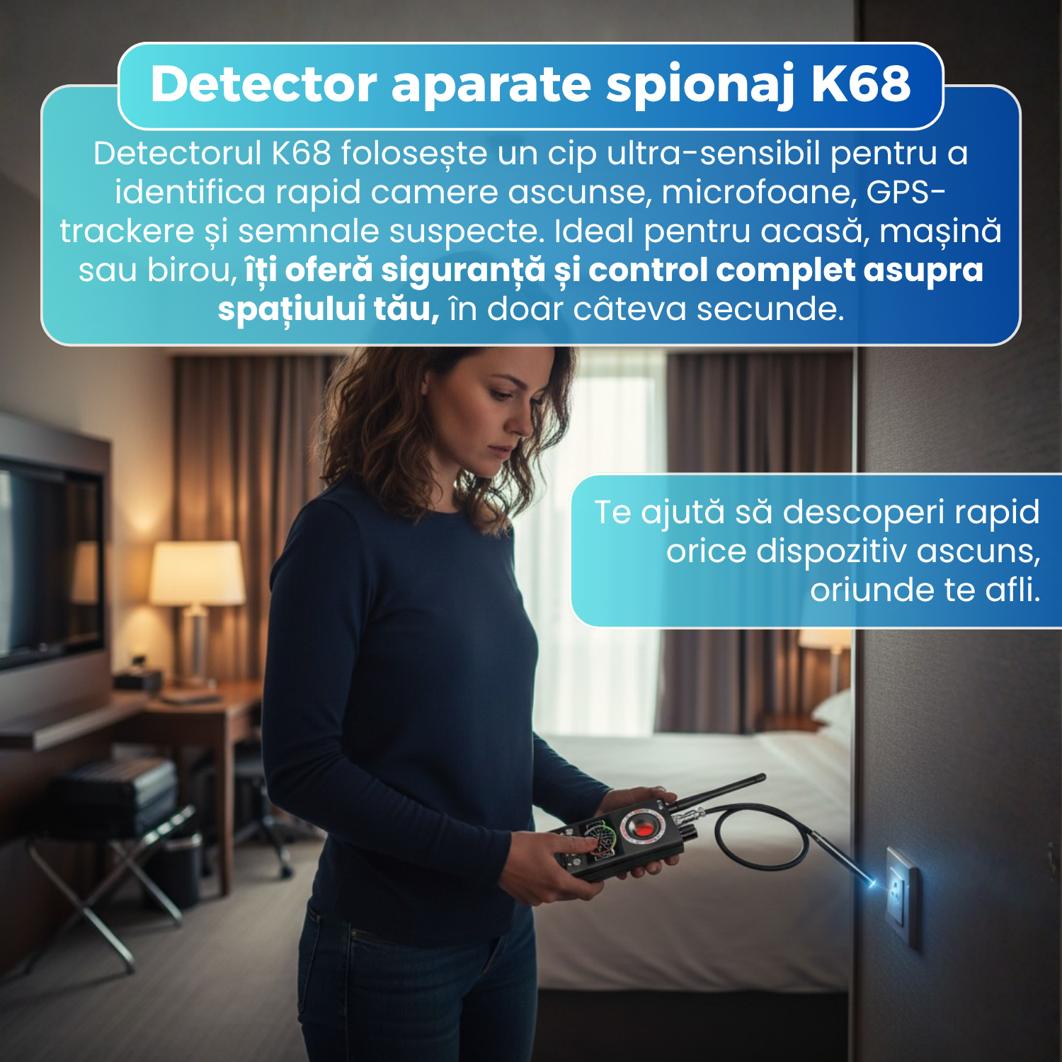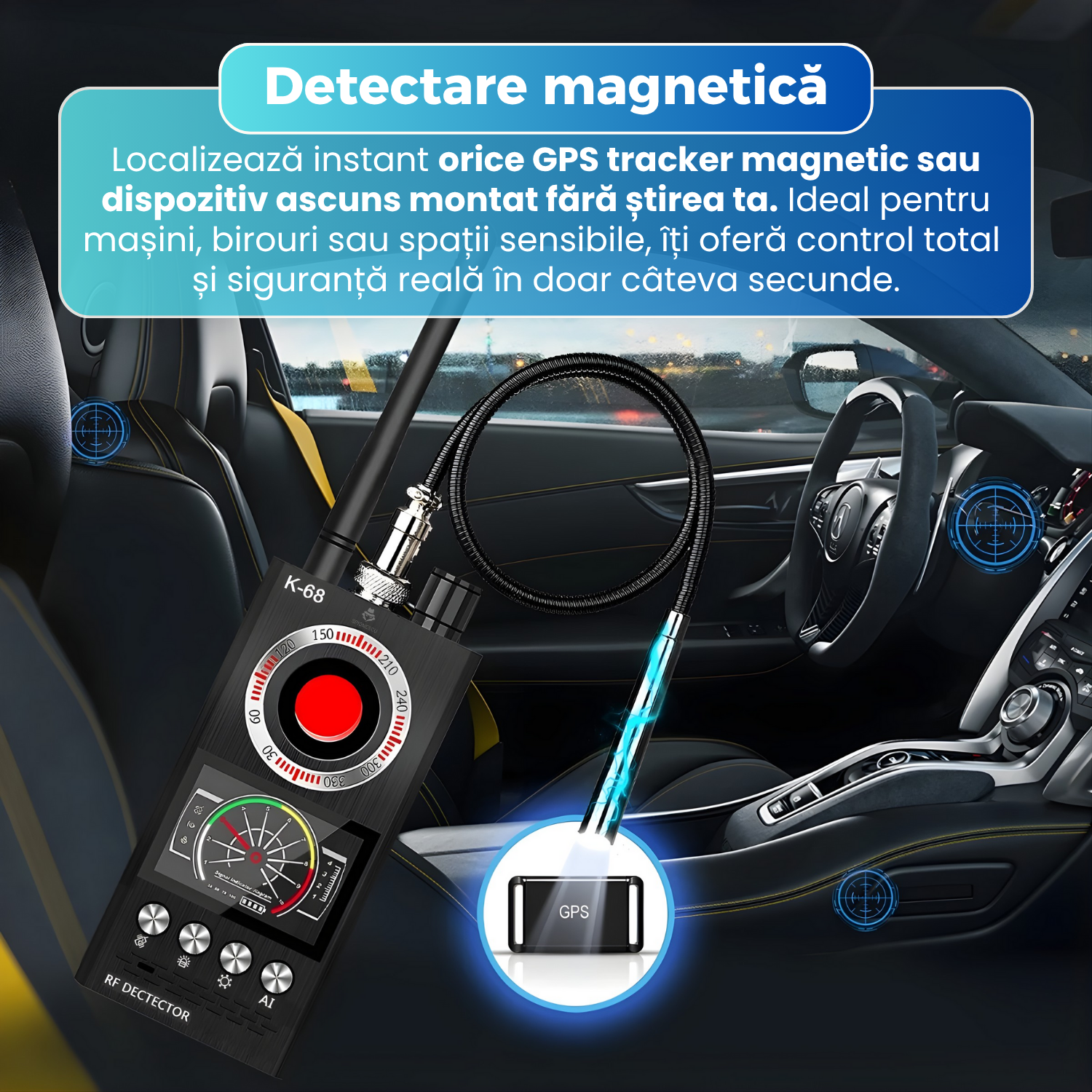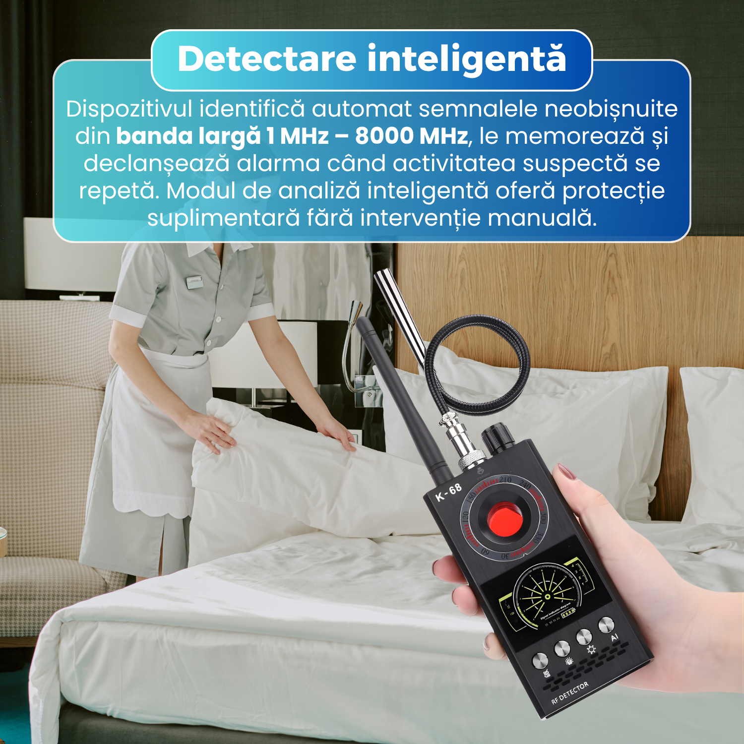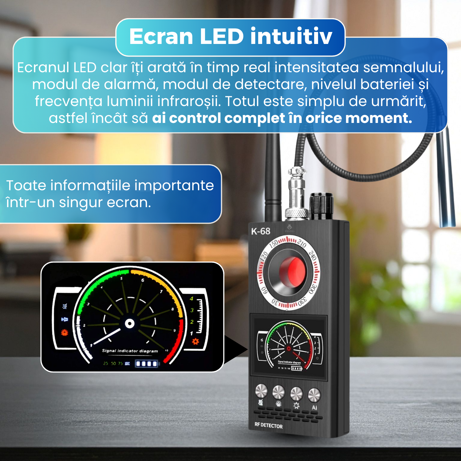 Detector inteligent aparate spionaj, K68, detectare camere ascunse, GPS, RF si IR, scanare laser, afisaj LED, baterie 1200 mAh, autonomie 8-10 ore, frecventa 1 MHz – 8000 MHz