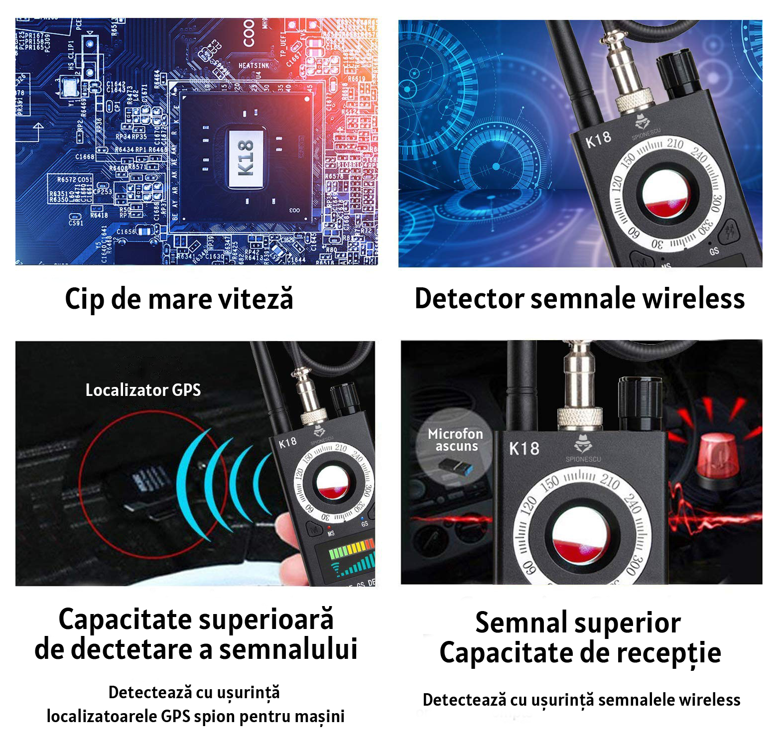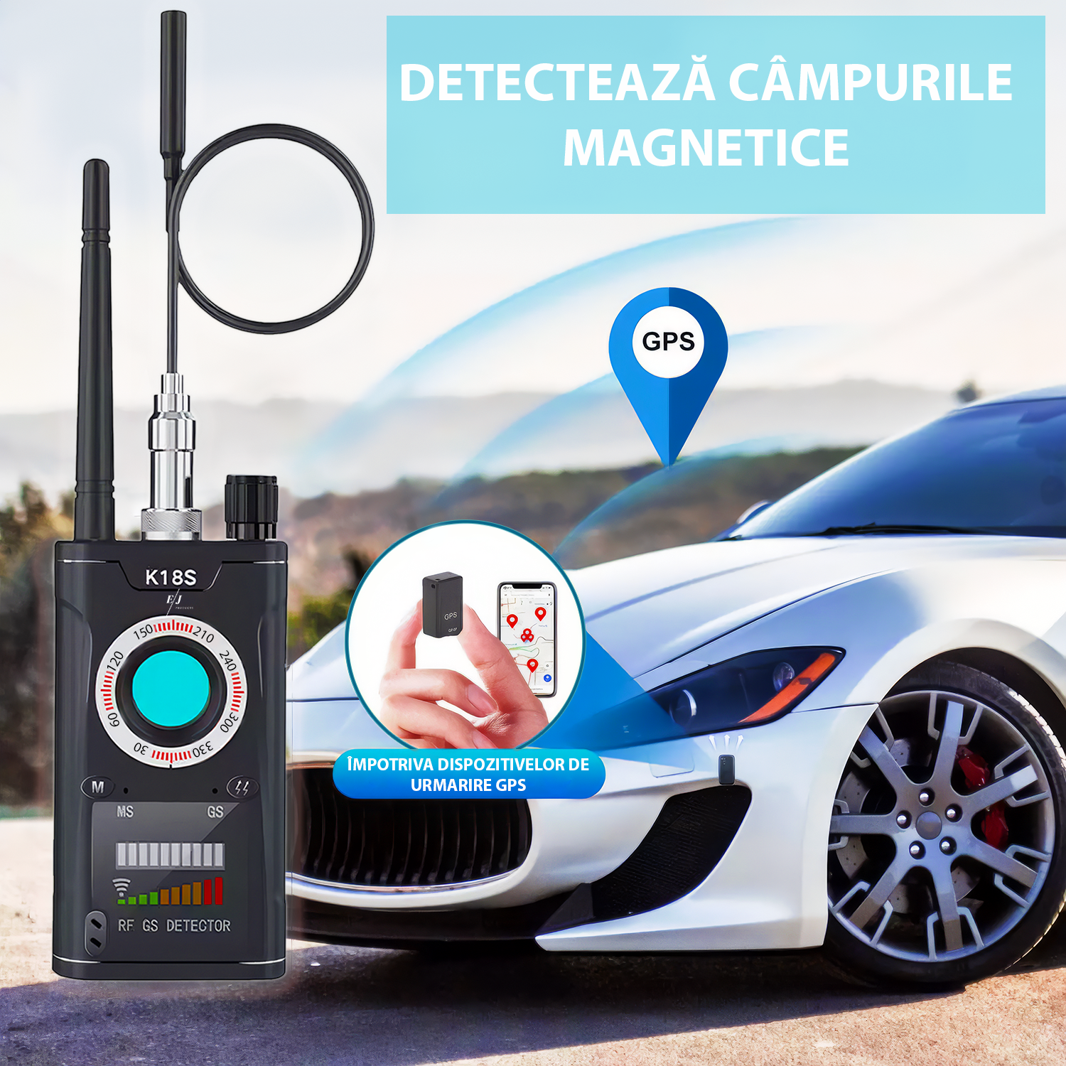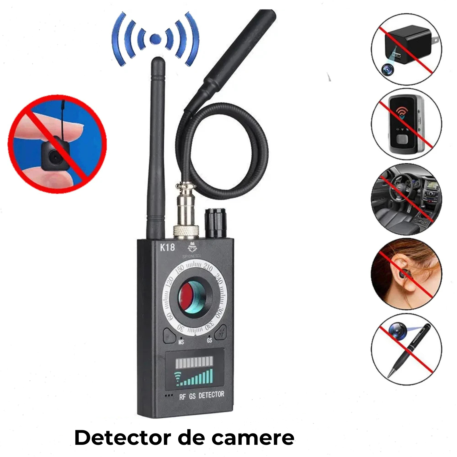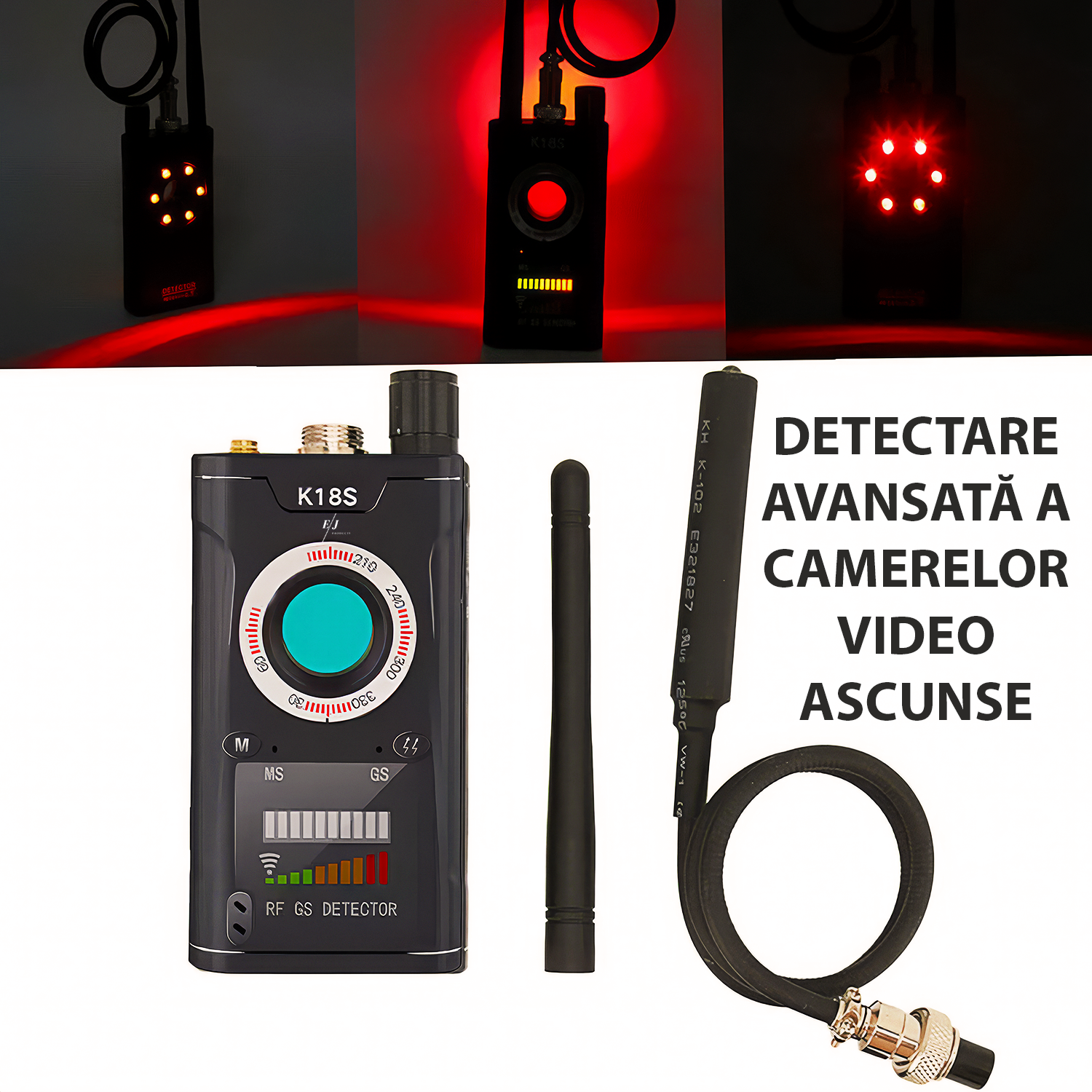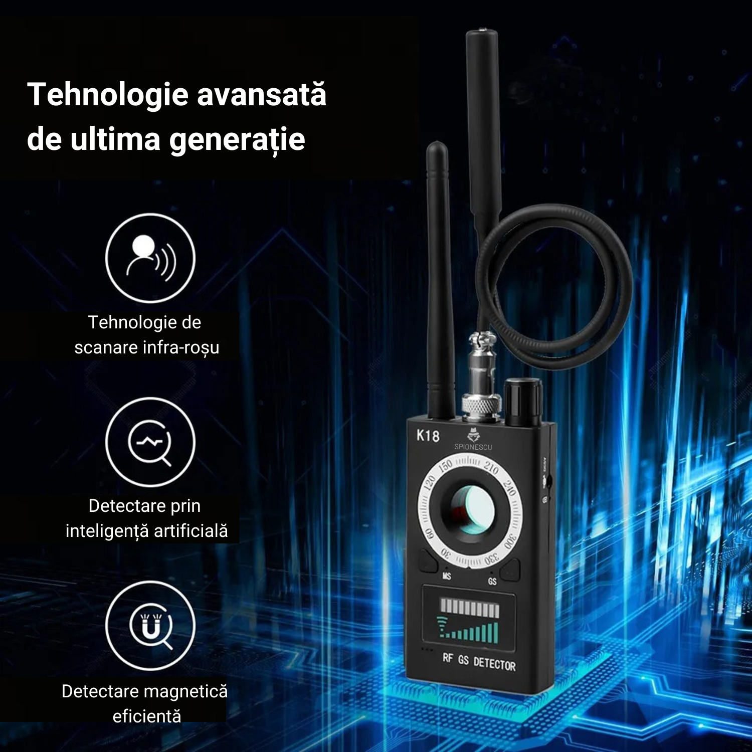 Detector dispozitive spionaj K18, camere ascunse, microfoane, localizatoare GPS, detectie RF 1MHz–6.5GHz, autonomie mare, sensibilitate reglabila, LED rosu, protectie intimitate