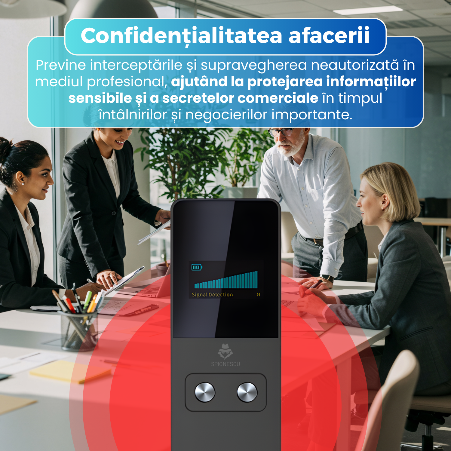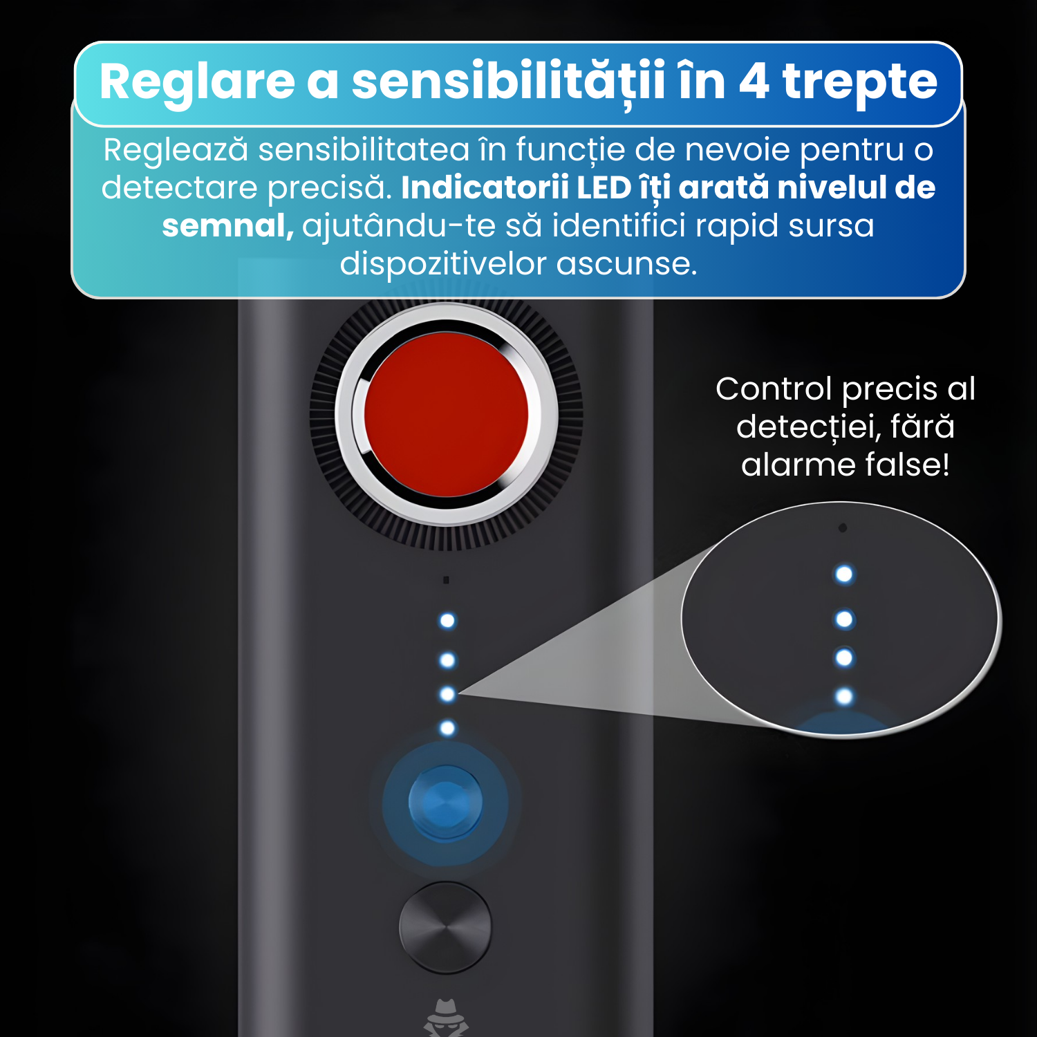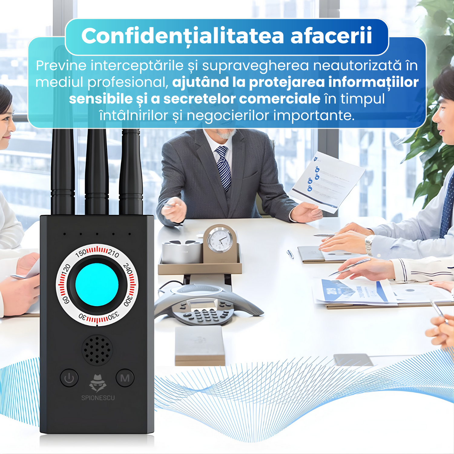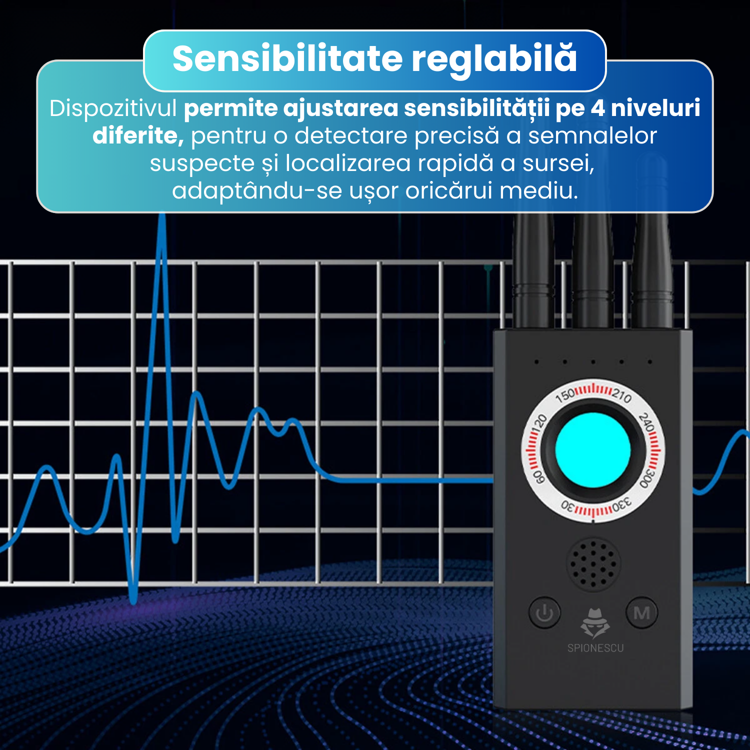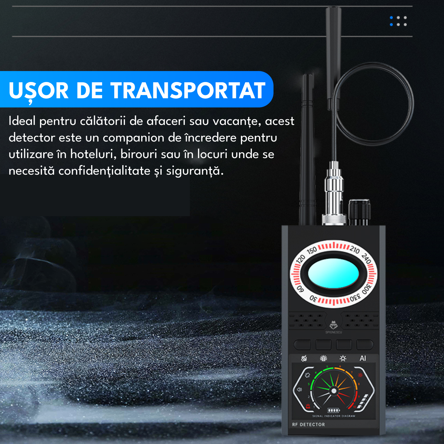 Detector dispozitive spionaj K18, camere ascunse, microfoane, localizatoare GPS, detectie RF 1MHz–6.5GHz, autonomie mare, sensibilitate reglabila, LED rosu, protectie intimitate