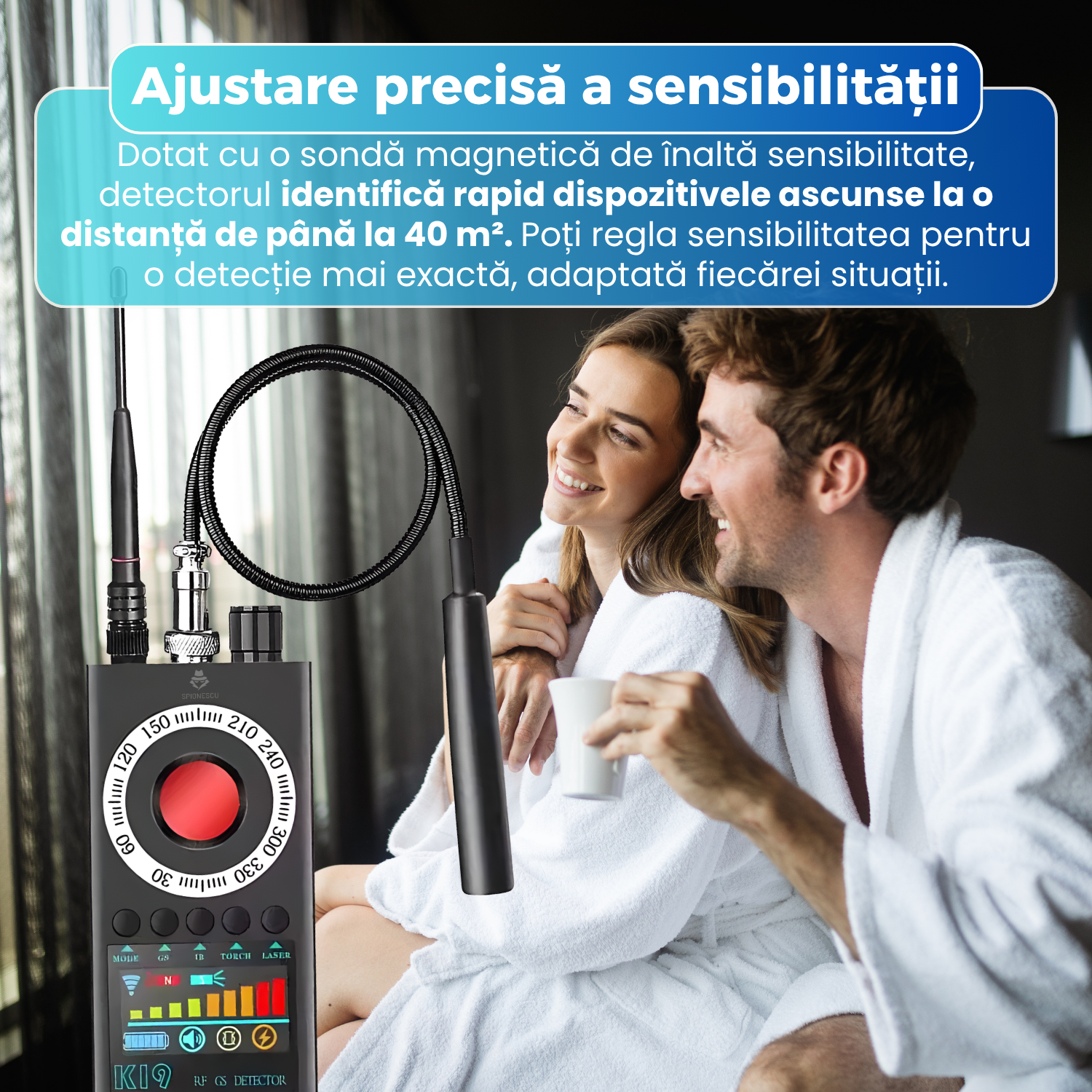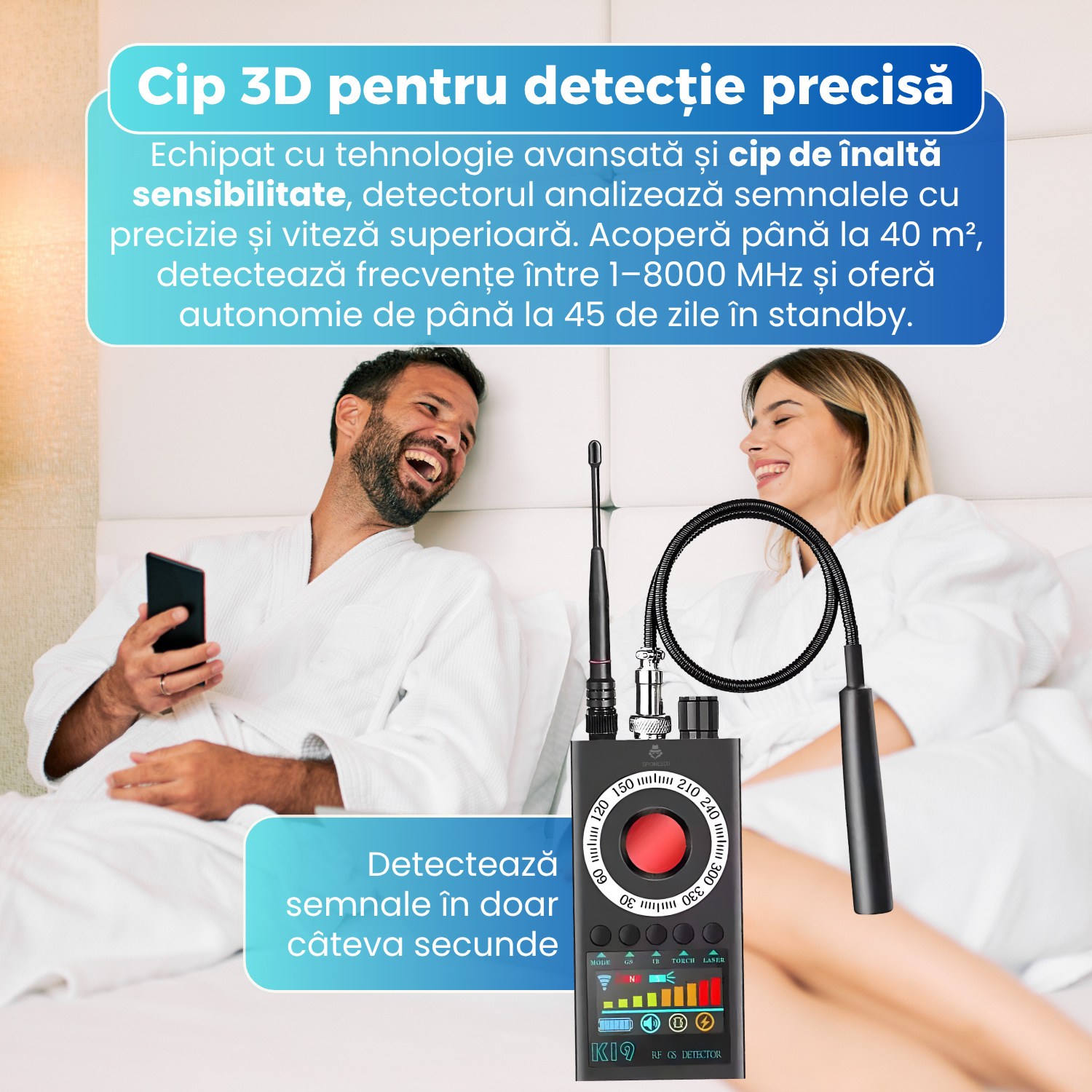 Detector aparate spionaj, K19, cip 3D inteligent, RF GPS, detectie 360°, ecran LED, ajustare sensibilitate, raza 40 m², autonomie 5 ore, baterie 350 mAh