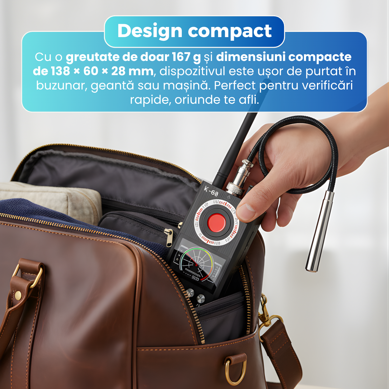 Detector profesional anti spionaj, K68S, camere, microfoane, localizatoare GPS/GSM, autonomie 35 ore, standby 25 zile, anti-spy, distanta detectare 10m, portabil