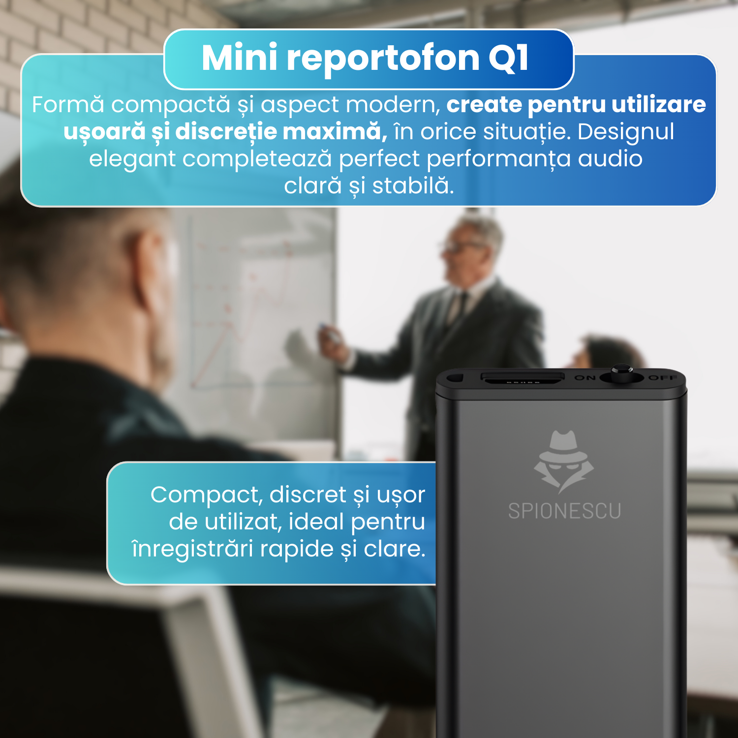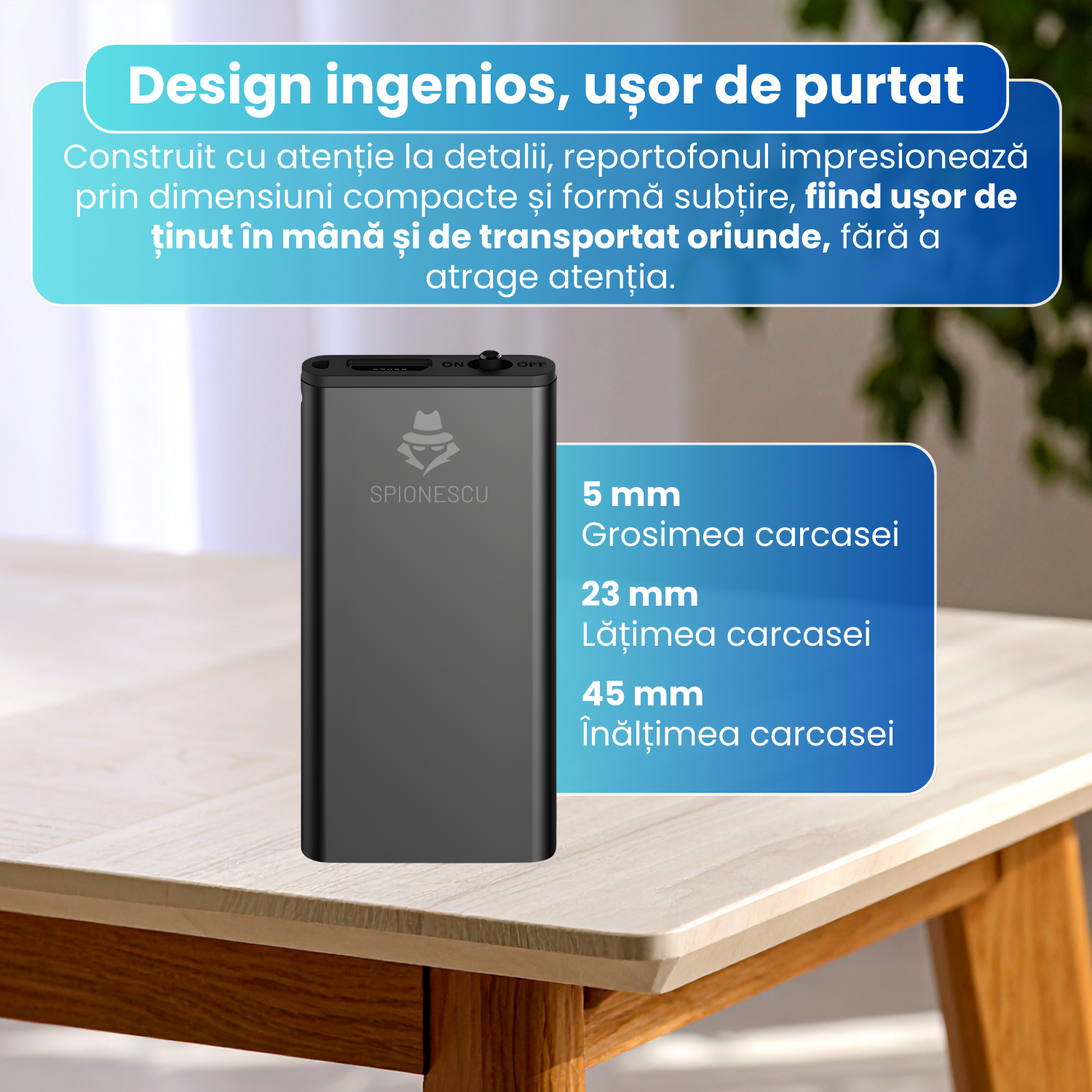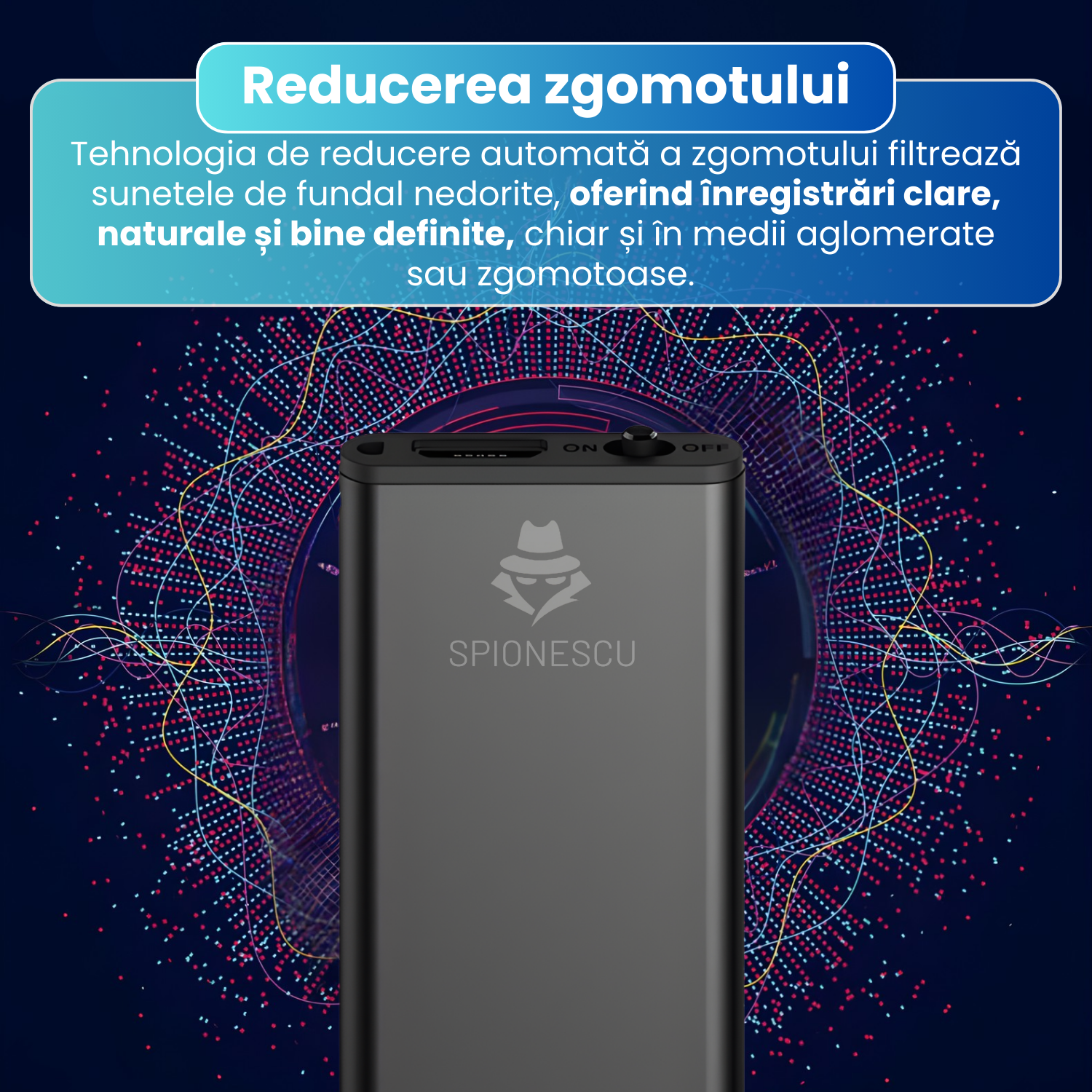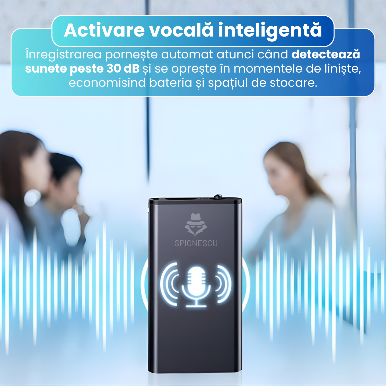Mini reportofon spion 16 GB, raza actiune 60m, stocare 384 ore, activare vocala, functie MP3, reducere zgomot de fundal, autonomie 24h, design compact si portabil