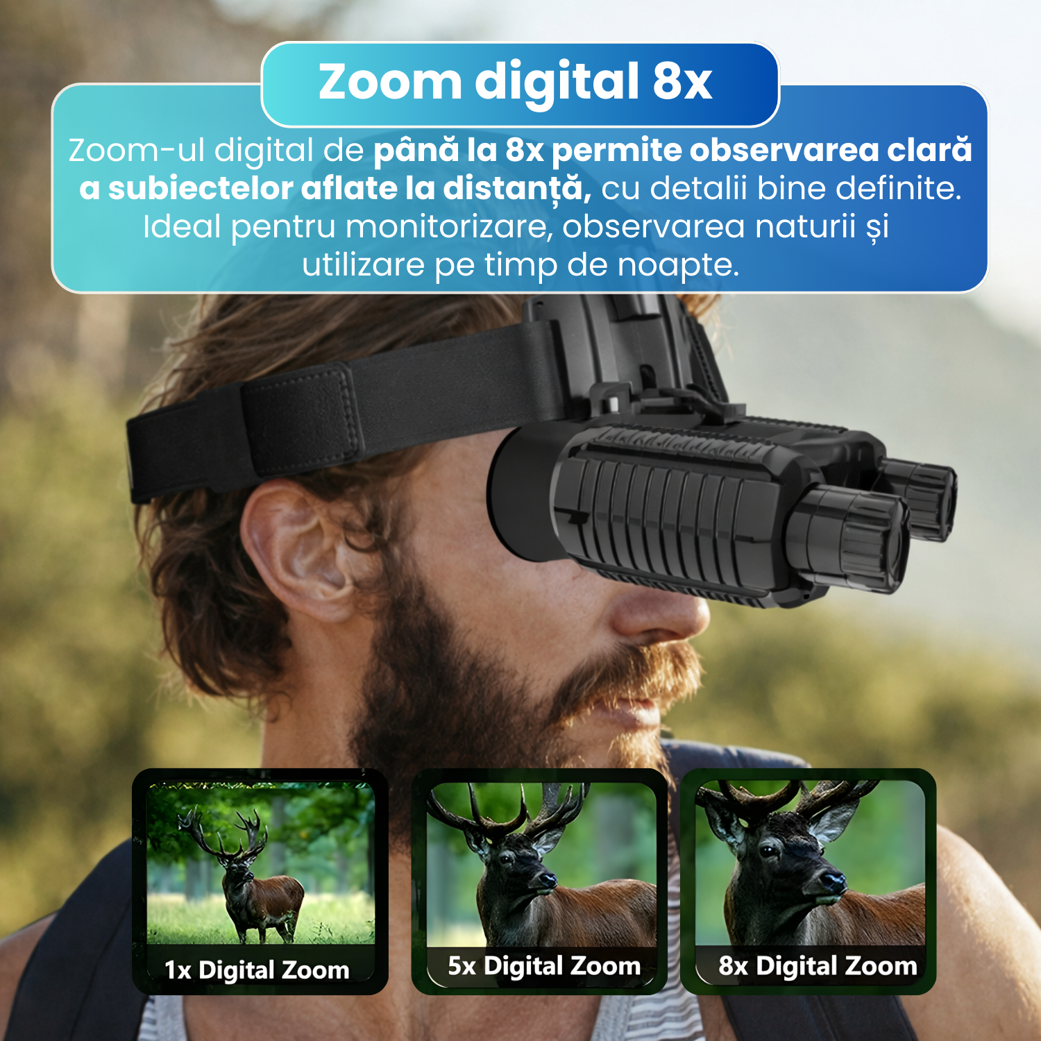 Zoom-ul digital de pana la 8x permite marirea imaginii pentru observarea detaliilor fine aflate la distanta. Utilizatorul poate identifica clar subiectele fara a se apropia, pastrand siguranta si discretia.