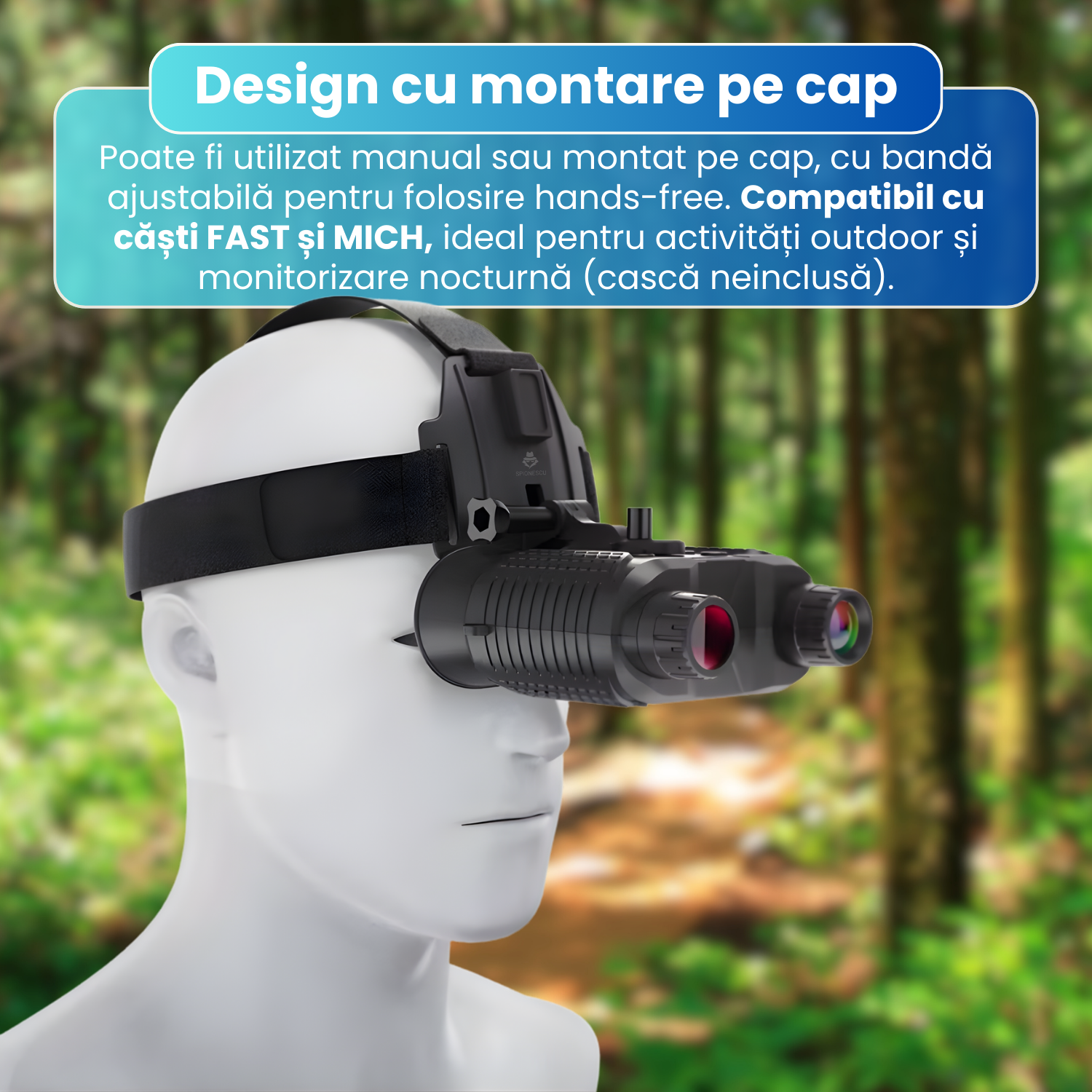Binoclul poate fi utilizat atat manual, cat si montat pe cap, datorita benzii ajustabile pentru folosire hands-free. Este compatibil cu casti FAST si MICH, fiind ideal pentru activitati tactice, outdoor sau monitorizare indelungata (caska nu este inclusa).