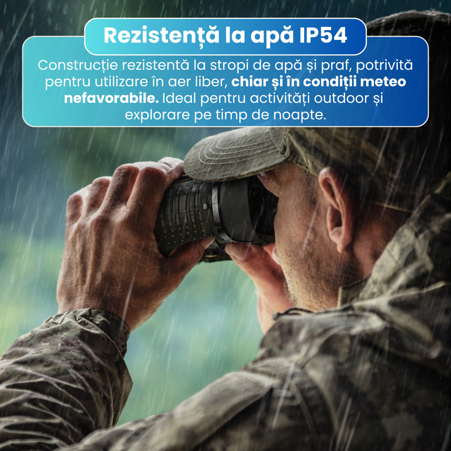 Constructia rezistenta la apa IP54 protejeaza dispozitivul impotriva stropilor si prafului. Binoclul poate fi utilizat in siguranta in conditii meteo dificile, precum ploaie usoara sau umiditate ridicata.