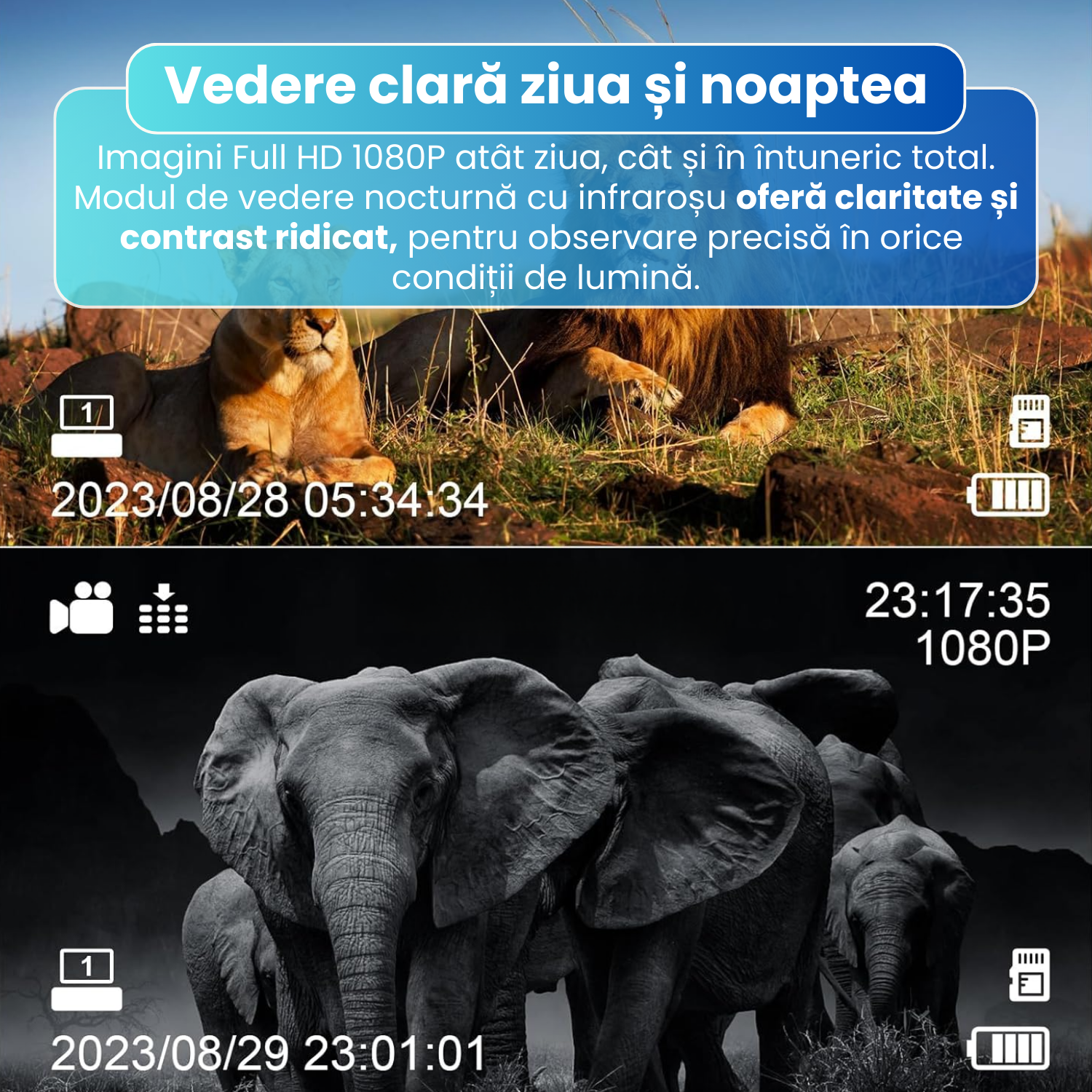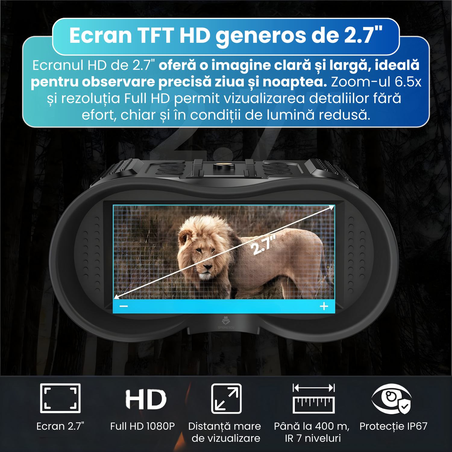 Binoclul ofera imagini Full HD 1080P atat pe timp de zi, cat si in conditii de intuneric complet. Modul de vedere nocturna cu infrarosu asigura contrast ridicat si detalii clare, permitand observarea precisa a obiectelor si animalelor indiferent de nivelul de lumina.