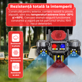 Sistemul este echipat cu trei lentile independente care acopera intregul camp vizual. Doua lentile fixe ofera imagini laterale, iar cea centrala PTZ se roteste automat pe orizontala si verticala pentru a urmari orice miscare. Astfel, obtii o acoperire completa fara unghiuri moarte, echivalenta cu instalarea a trei camere intr-un singur dispozitiv.