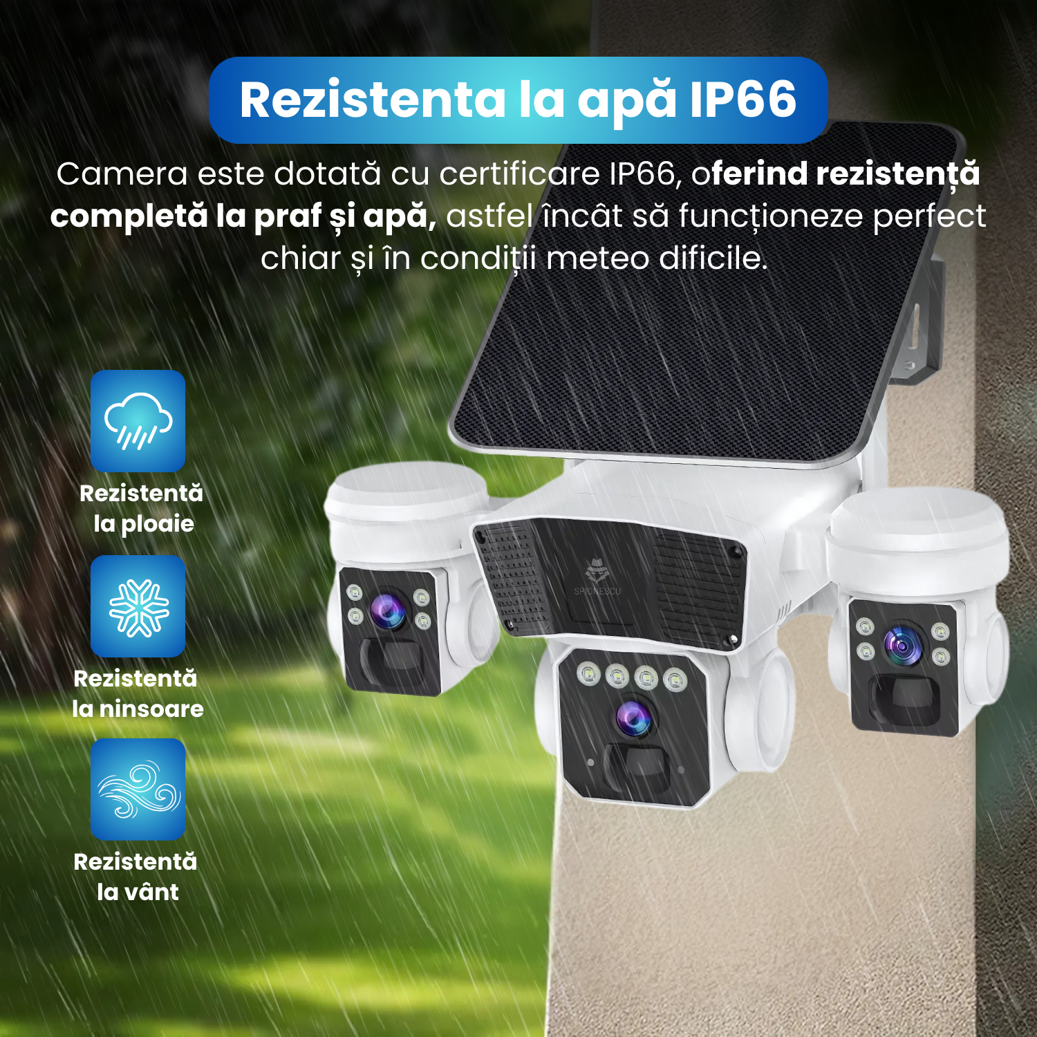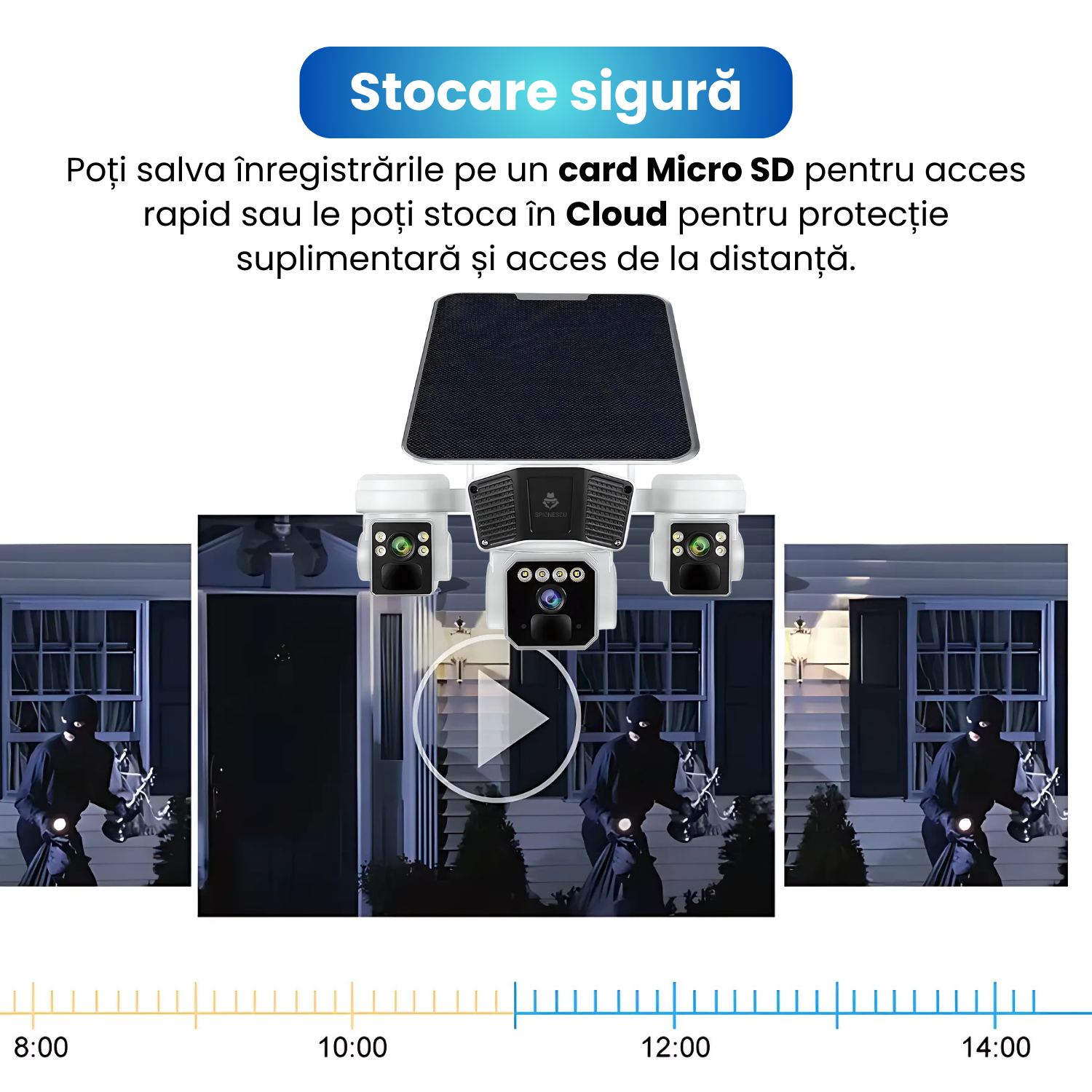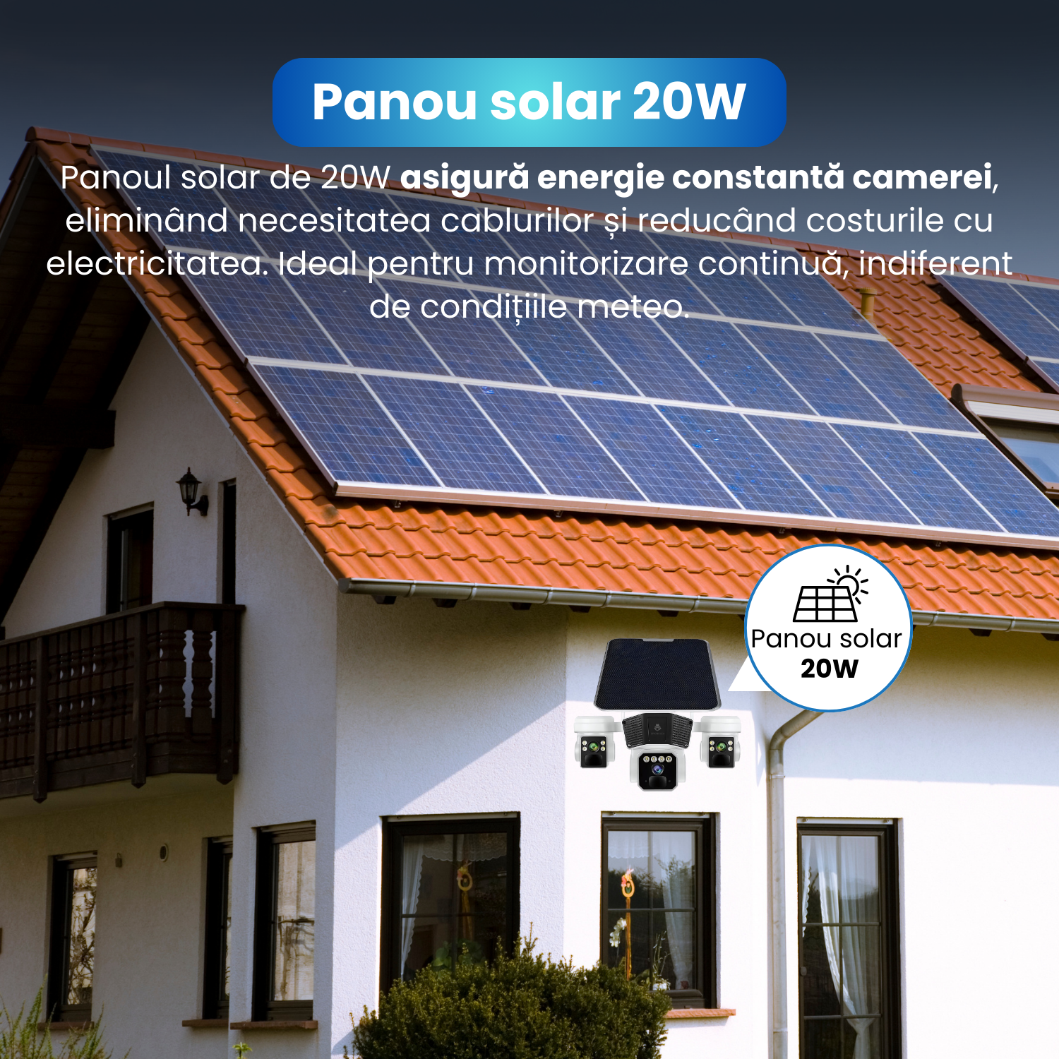 Panoul solar incorporat asigura alimentarea continua a camerei, eliminand nevoia de cabluri sau baterii externe. Economisesti energie si ai siguranta ca dispozitivul ramane activ 24/7.