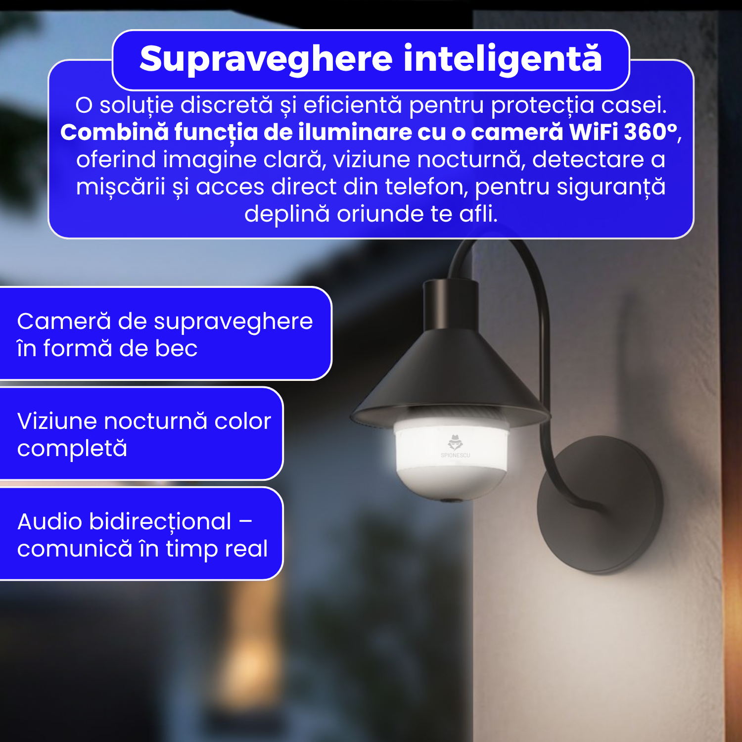 - Protectie inteligenta completa – combina iluminarea, detectia miscarii si comunicarea audio pentru siguranta 24/7.