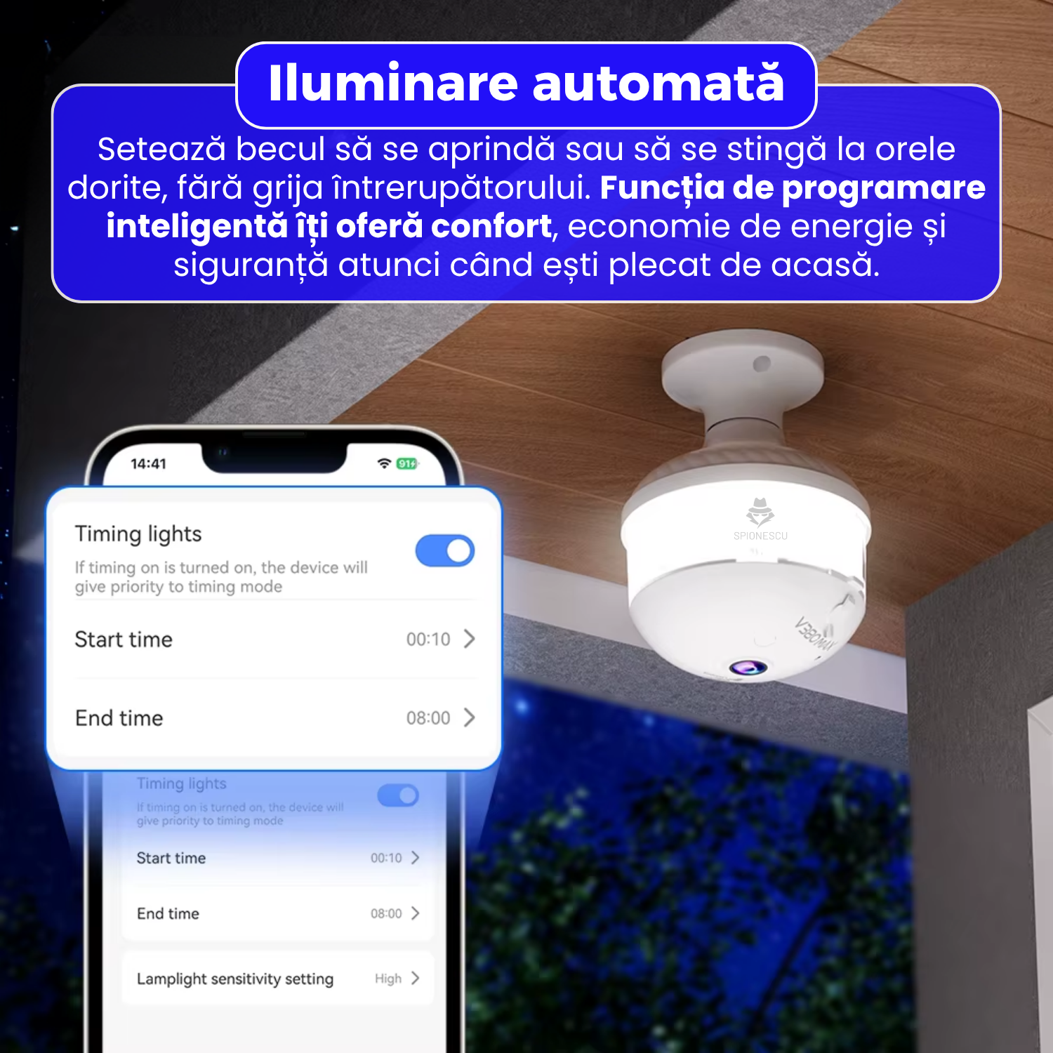 Camera poate fi programata sa aprinda sau sa stinga automat lumina la orele dorite. Aceasta functie ofera confort si eficienta energetica, reducand consumul inutil. Este ideala pentru momentele in care esti plecat, creand impresia ca locuinta este ocupata si adaugand un strat suplimentar de siguranta.