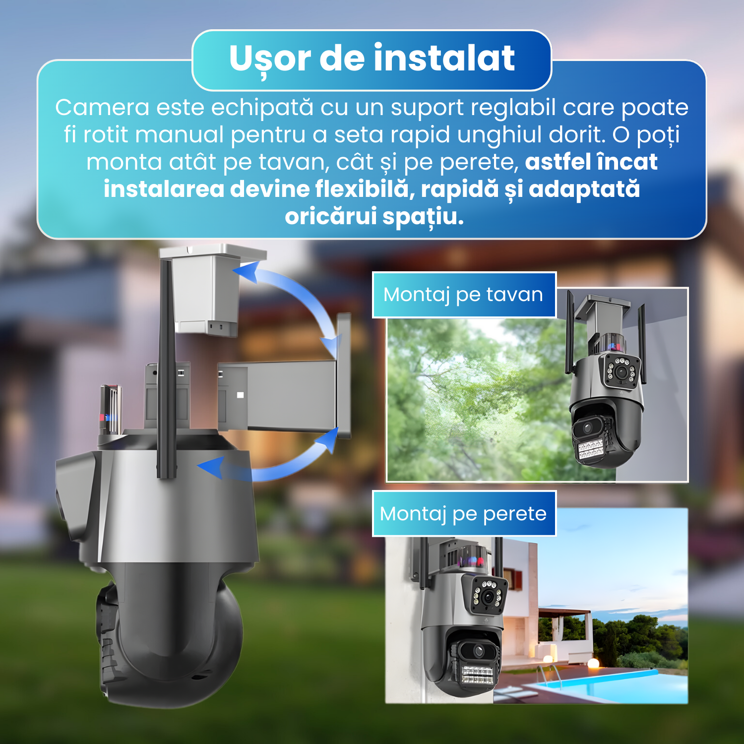 Montajul este rapid, intuitiv si nu necesita cunostinte tehnice avansate. Poti pozitiona camera exact acolo unde ai nevoie de vizibilitate ampla, iar datorita designului flexibil, o poti ajusta oricand ulterior.