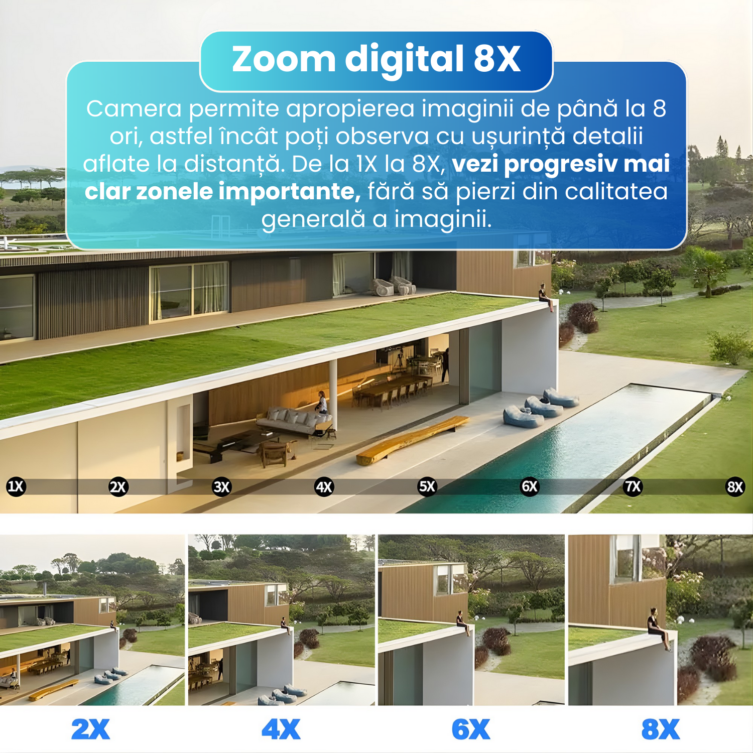 Cu ajutorul zoom-ului digital de pana la 8X, camera permite apropierea imaginii fara pierderi majore de calitate, oferind vizibilitate excelenta asupra detaliilor aflate la distanta. Fie ca vrei sa vezi mai clar o masina parcata, o persoana care se apropie sau activitatea dintr-un colt indepartat al curtii, zoom-ul digital ofera flexibilitatea de care ai nevoie.