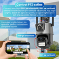 Camera este echipata cu un sistem avansat format din trei lentile independente, proiectate sa ofere un nivel de supraveghere imposibil de obtinut cu o camera clasica. Lentila fixa surprinde permanent o vedere panoramica larga, ideala pentru monitorizarea zonelor statice, precum intrari, garduri sau curti. In acelasi timp, cele doua lentile PTZ pot fi rotite si ajustate dupa nevoie, permitand observarea detaliilor aflate in miscare sau la distanta.