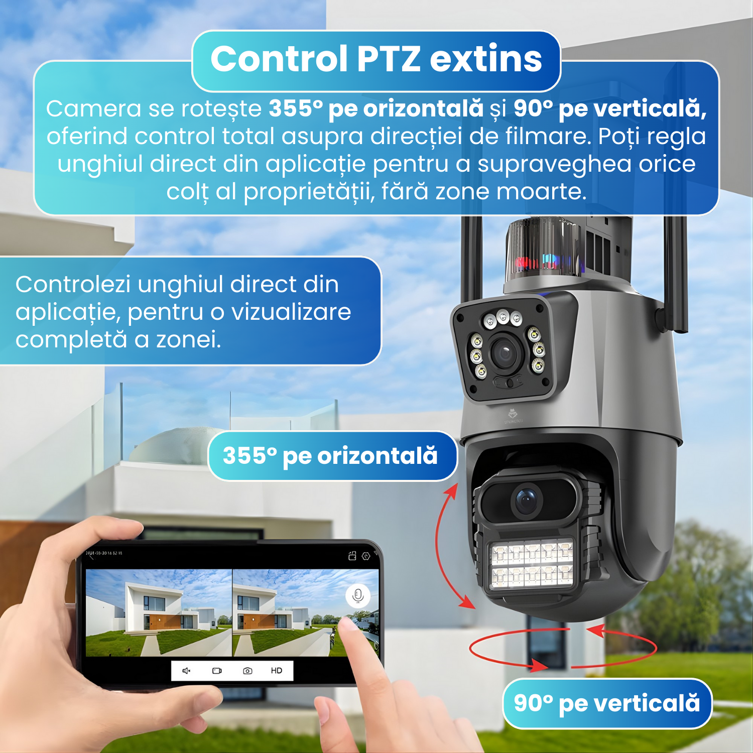 Are PTZ 355° + Tilt 90°, eliminand complet unghiurile moarte