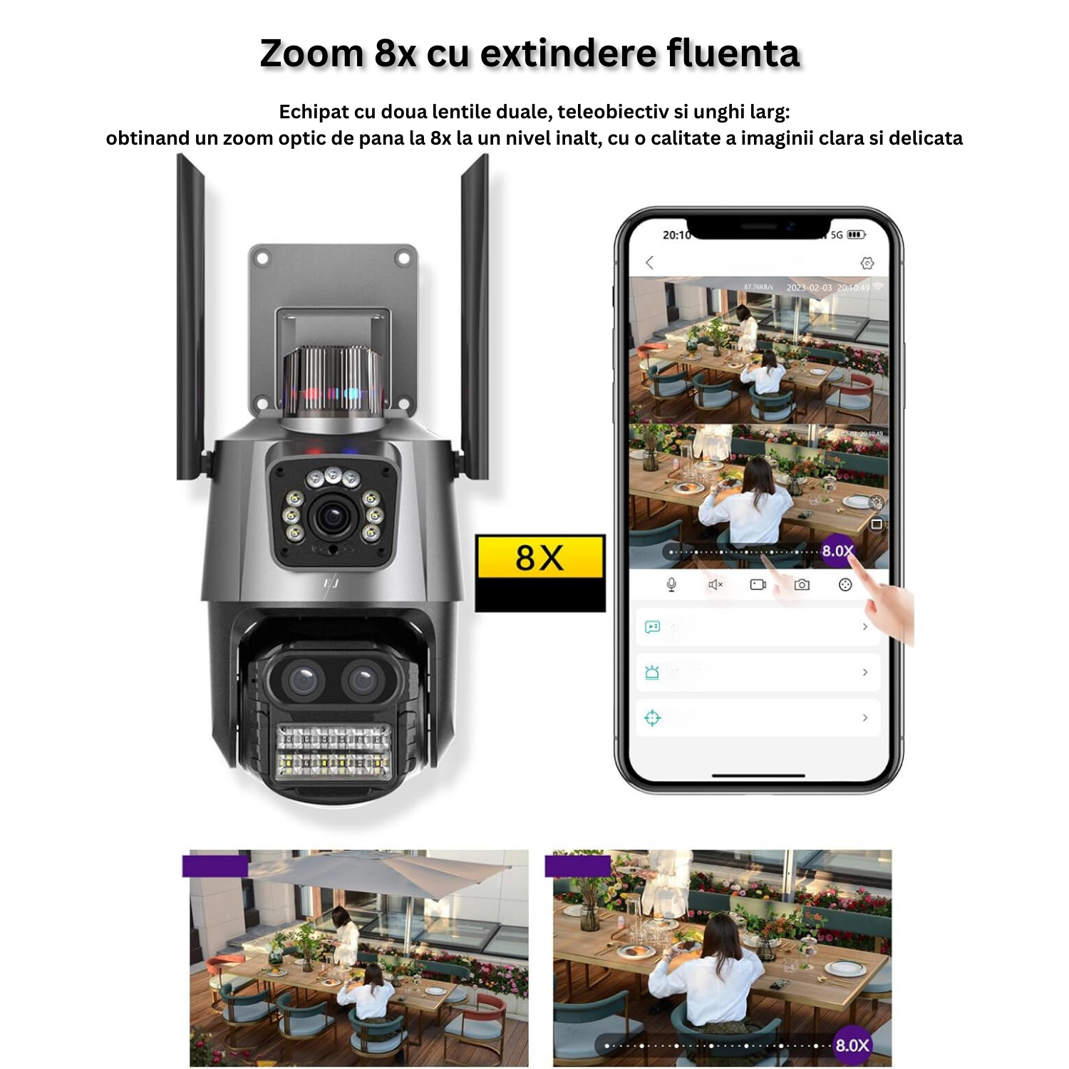 Zoom Optic de 8x: Apropierea sau indepartarea detaliilor nu a fost niciodata mai usoara. Cu functia de zoom optic de 8x, puteti focaliza pe orice aspect specific al curtii sau proprietatii dumneavoastra.