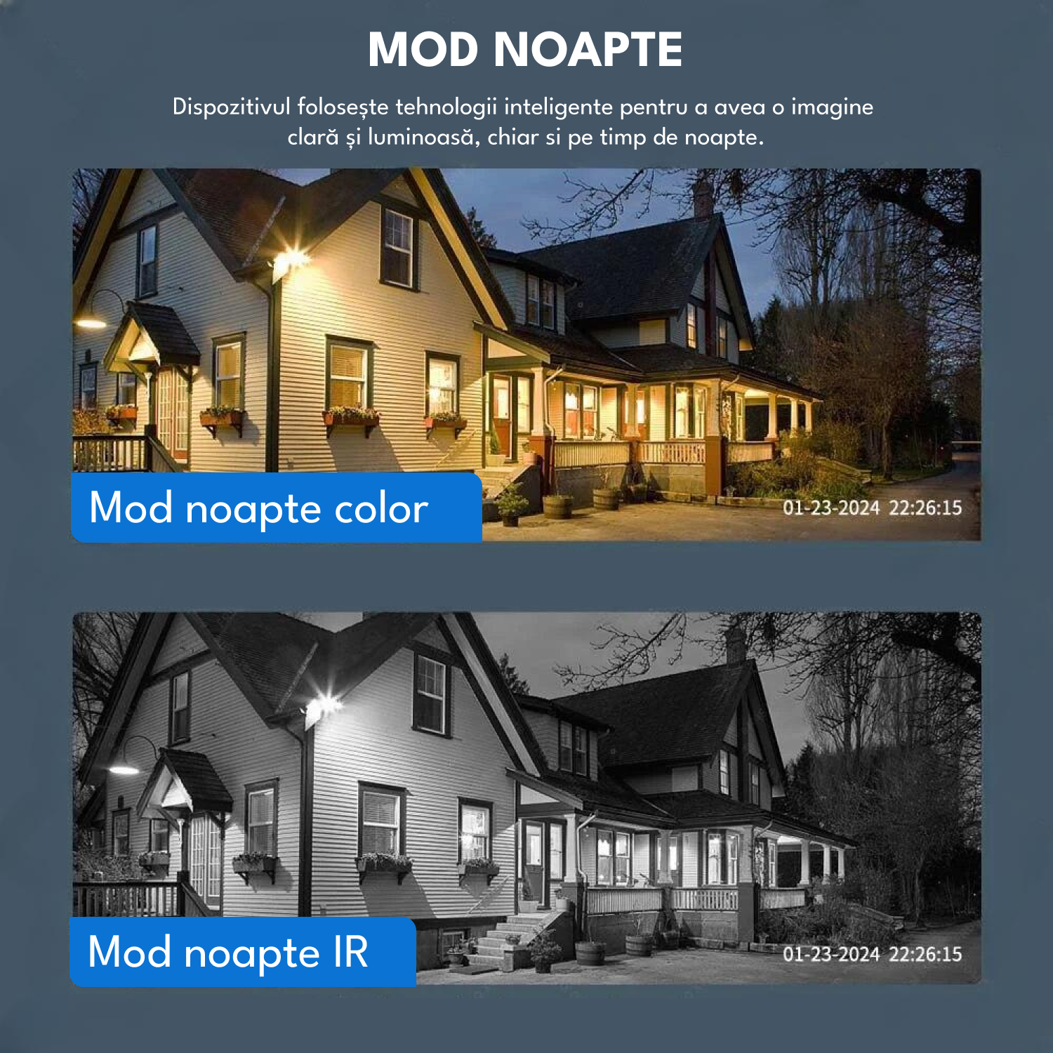 Functie de vedere nocturna: Asigura supravegherea eficienta si in conditii de lumina scazuta sau intuneric complet, pentru protectie continua pe tot parcursul zilei si al noptii.