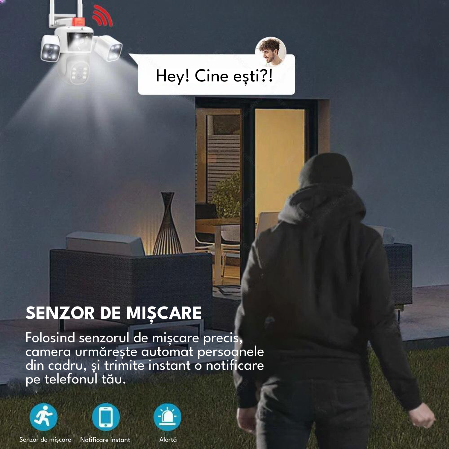 Senzor de miscare: Primesti alerte instantanee atunci cand se detecteaza miscare in zona monitorizata, ceea ce te ajuta sa fii informat in timp real despre activitatile neasteptate sau suspecte.