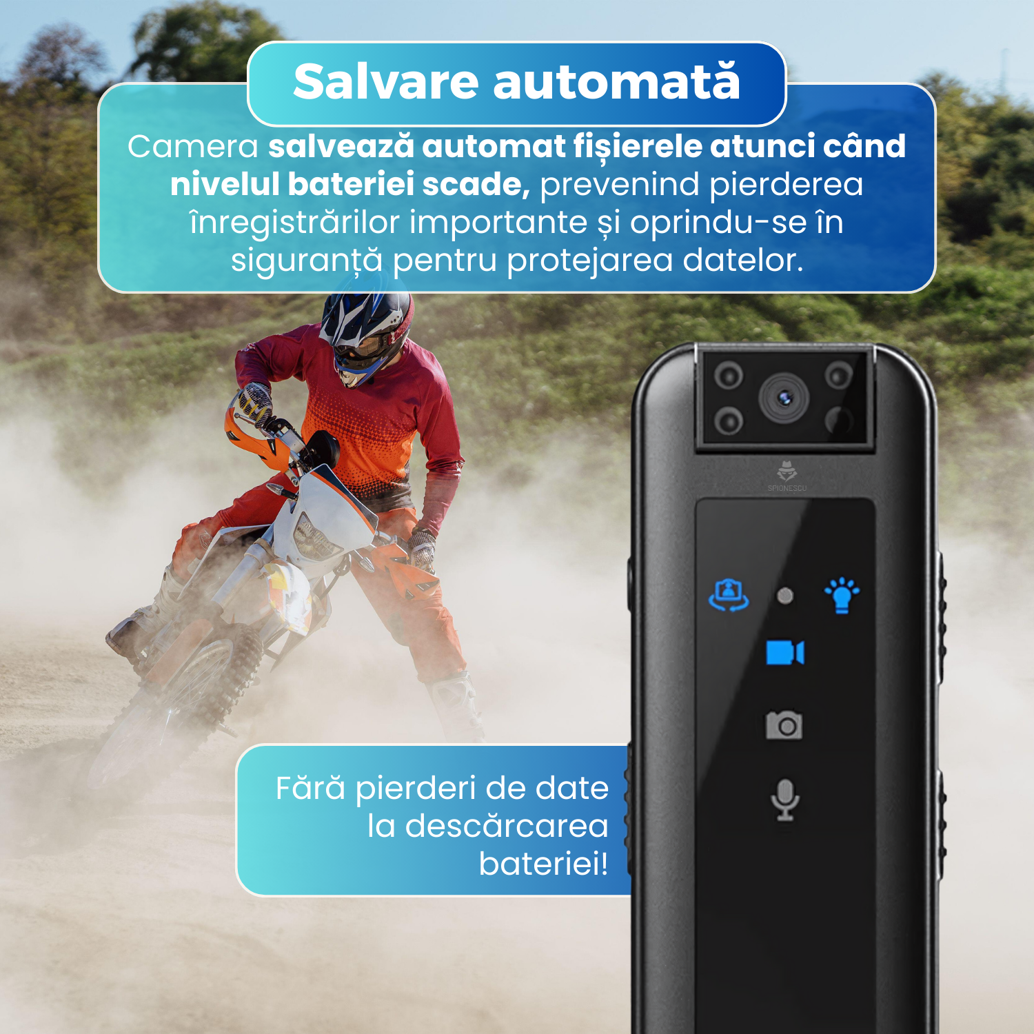 Sistemul inteligent de protectie salveaza automat fisierele atunci cand nivelul bateriei scade, prevenind pierderea inregistrarilor importante si protejand datele stocate.