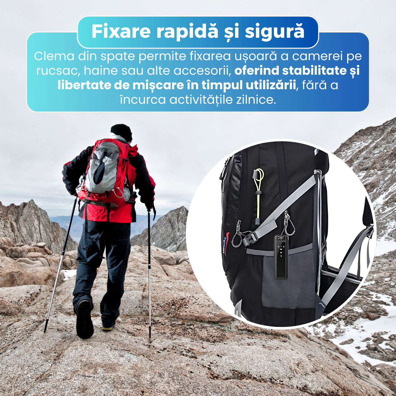 Datorita dimensiunilor reduse si clemei din spate, camera poate fi fixata usor pe haine, curea sau rucsac. Designul ergonomic permite utilizarea fara a ocupa mainile, oferind libertate de miscare si confort sporit.