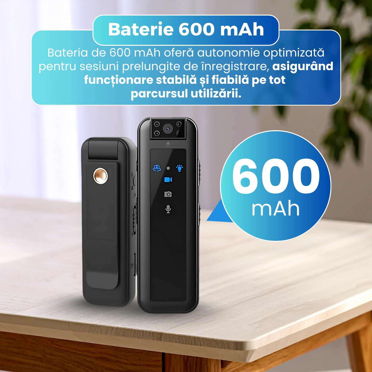 Bateria reincarcabila de 600 mAh asigura pana la 5 ore de inregistrare continua, fiind potrivita pentru sesiuni lungi de filmare. Camera poate fi utilizata fara grija descarcarii rapide, chiar si in deplasare.