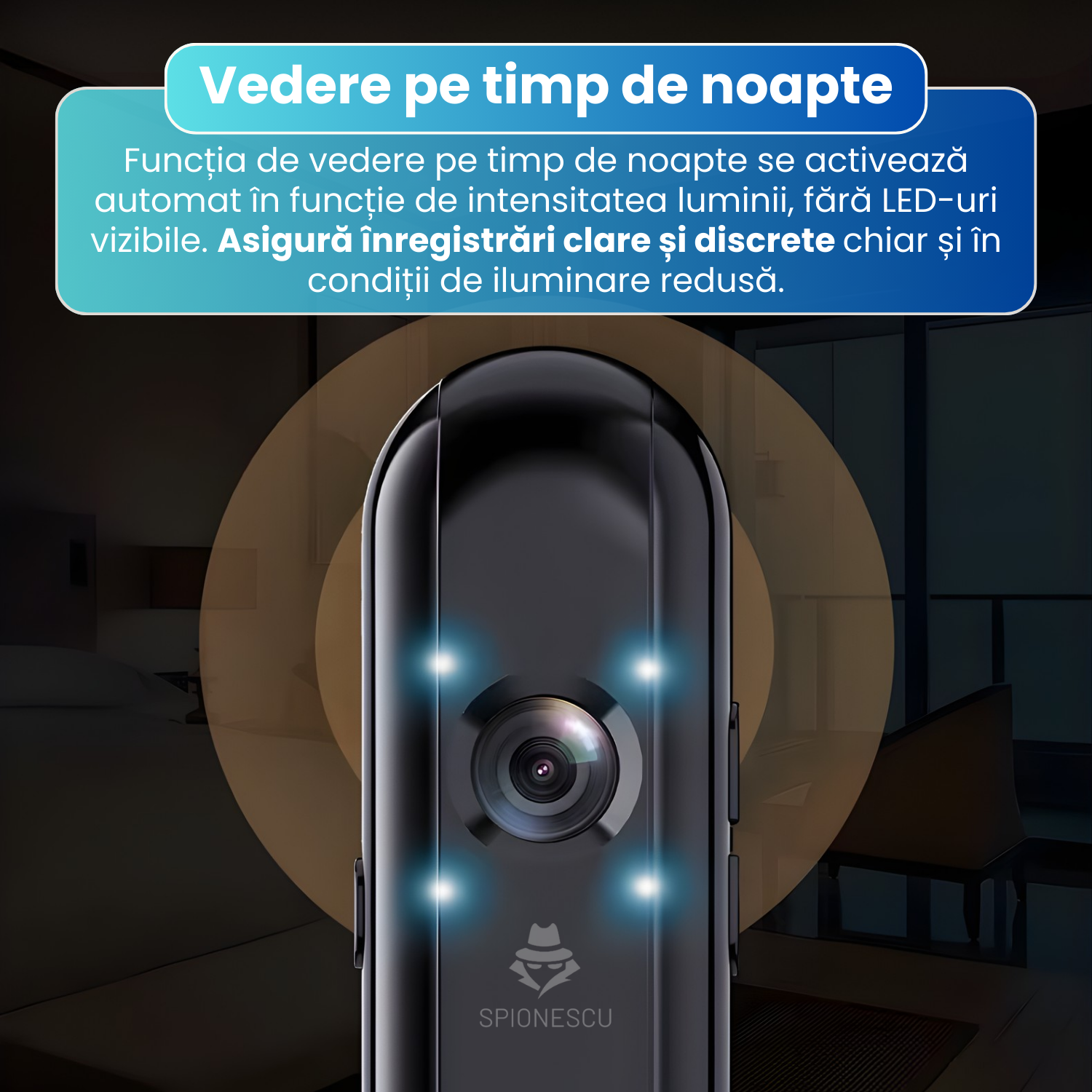 Functia de vedere pe timp de noapte se activeaza automat in functie de intensitatea luminii ambientale. Camera nu utilizeaza LED-uri vizibile, ceea ce permite inregistrari discrete chiar si in conditii de iluminare redusa. Este ideala pentru supraveghere fara a atrage atentia.
