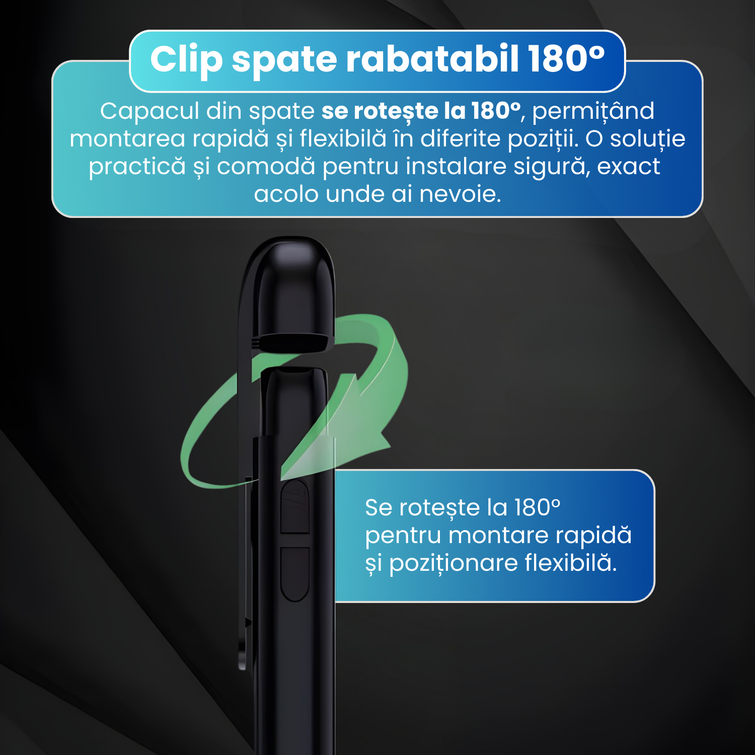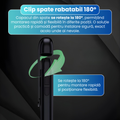 Camera este dotata cu un clip rotativ care permite ajustarea unghiului de filmare si montarea in diferite pozitii. Capacul din spate se poate roti la 180°, oferind libertate maxima in alegerea pozitiei de instalare, fie pe haine, obiecte sau alte suprafete.