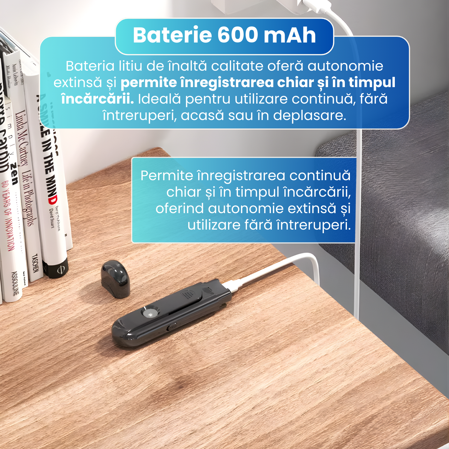 Camera este echipata cu o baterie litiu de 600mAh, care ofera pana la 2 ore de inregistrare continua. In plus, permite inregistrarea chiar si in timpul incarcarii, fiind ideala pentru utilizare indelungata sau supraveghere continua.