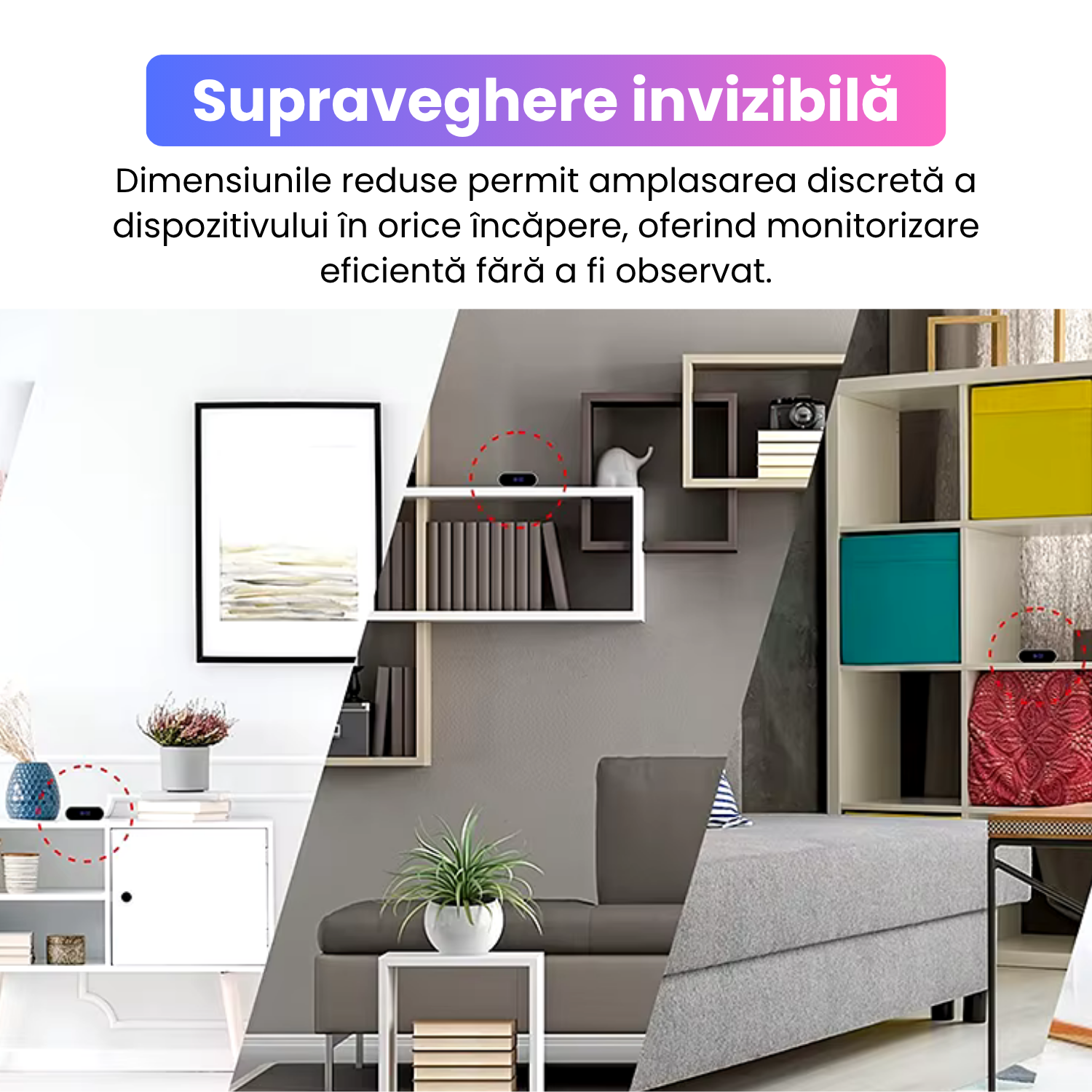 Versatilitate in orice mediu: Acest dispozitiv se integreaza perfect in orice decor, fie ca este folosit acasa, la birou sau in alte locatii, oferindu-ti o solutie eleganta si discreta de supraveghere.