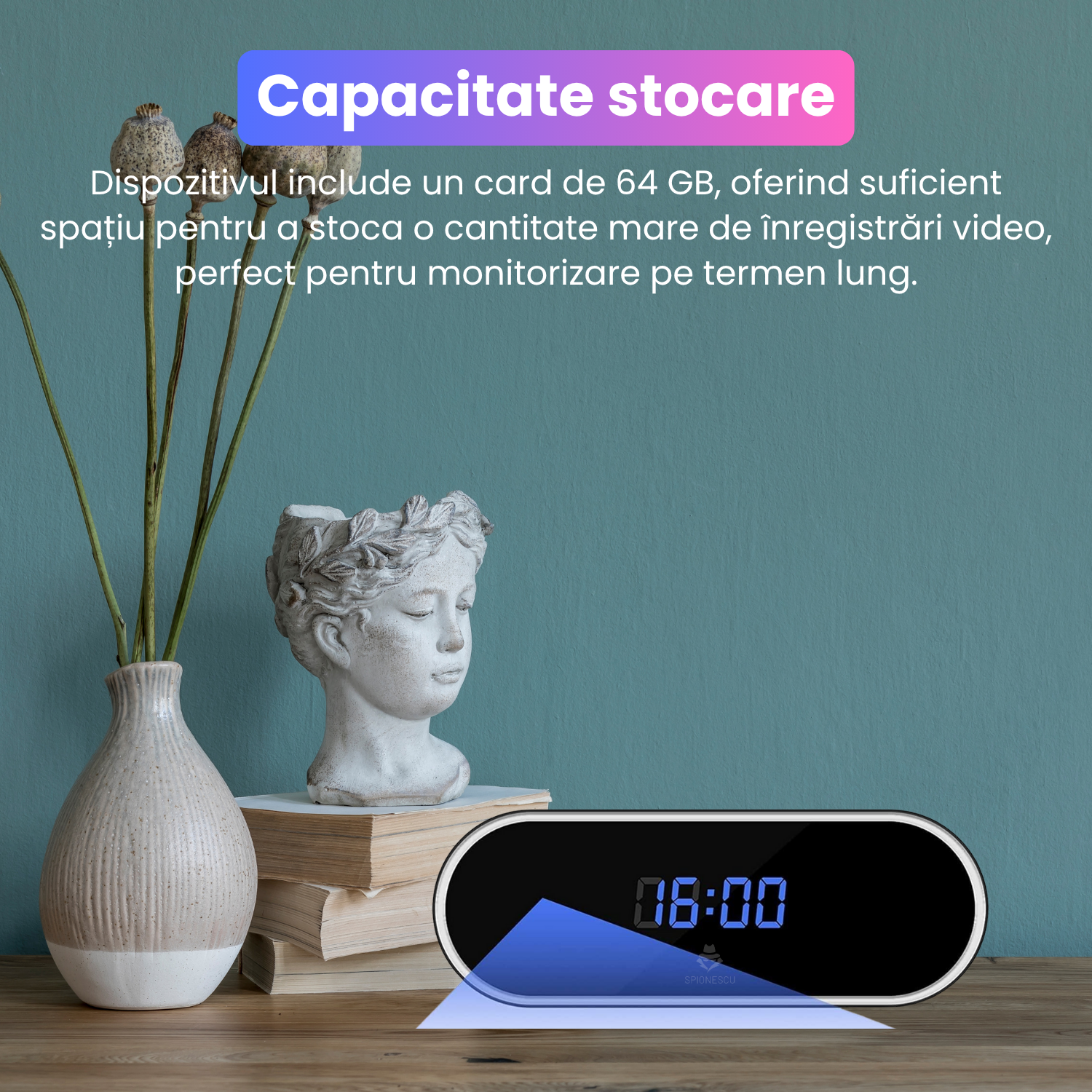 Discretie totala: Camera este perfect camuflata intr-un ceas desteptator functional, ceea ce il face imposibil de detectat. Nimeni nu va suspecta ca acest ceas ascunde un dispozitiv de supraveghere.
