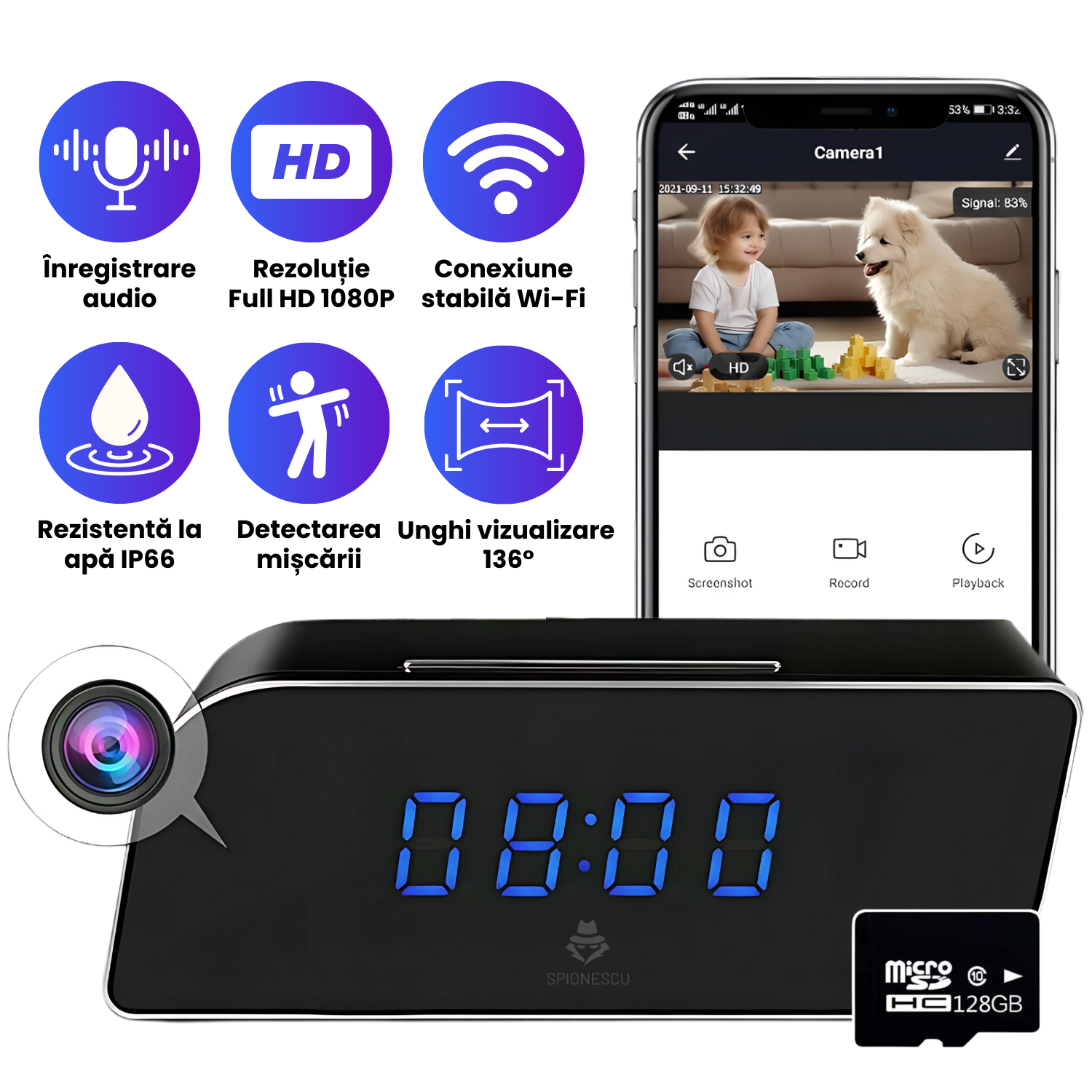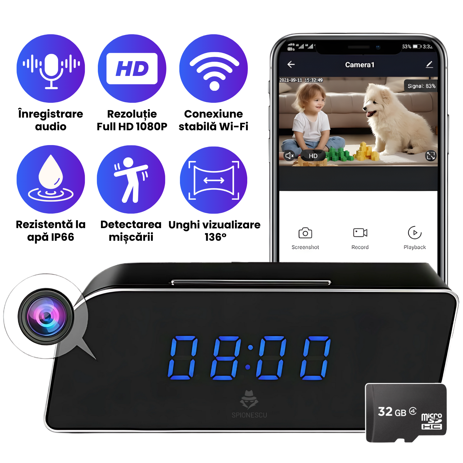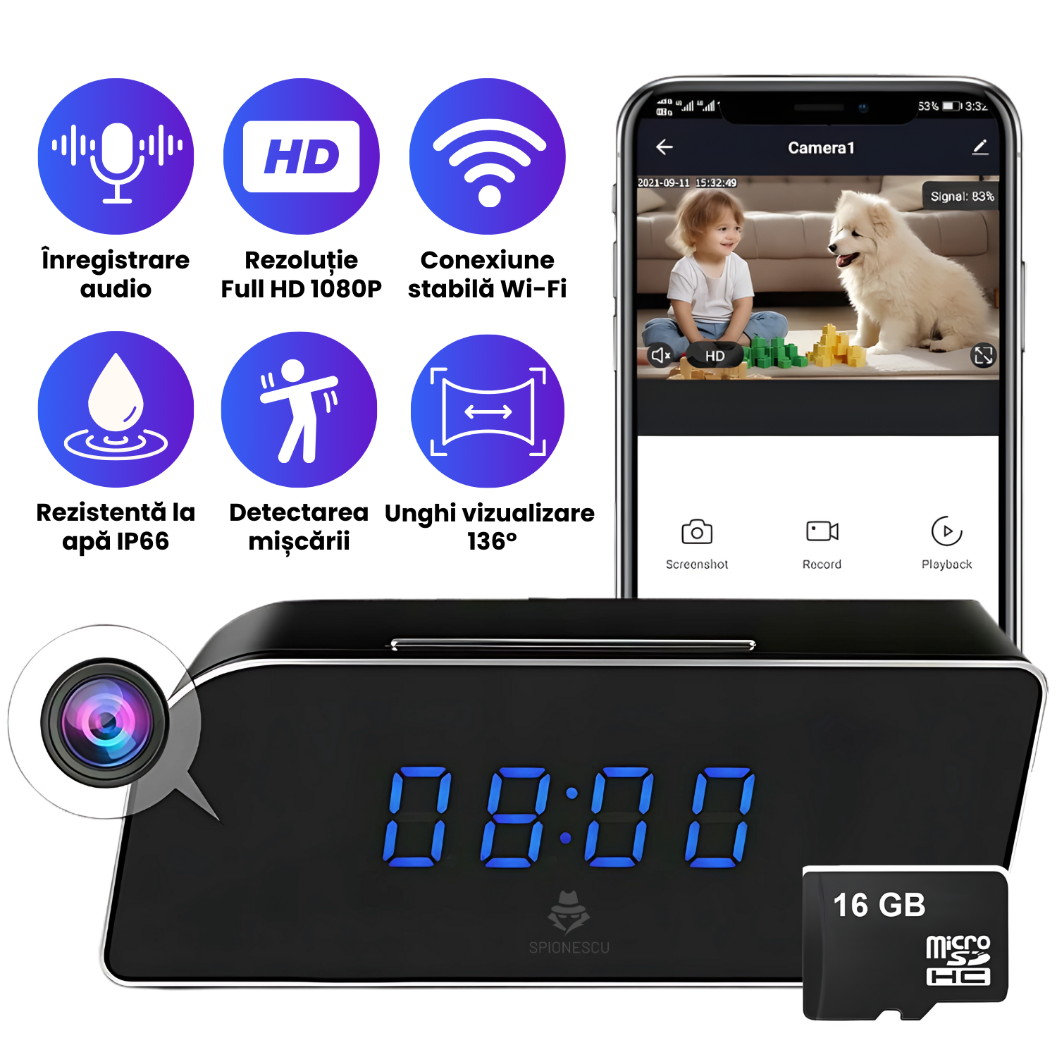 Aceasta functionalitate autentica mascheaza complet scopul real al produsului – un dispozitiv de supraveghere avansat. Ceasul ascunde o camera spy de inalta calitate, dar pentru oricine altcineva, ramane un simplu ceas de birou cu alarma si calendar.
