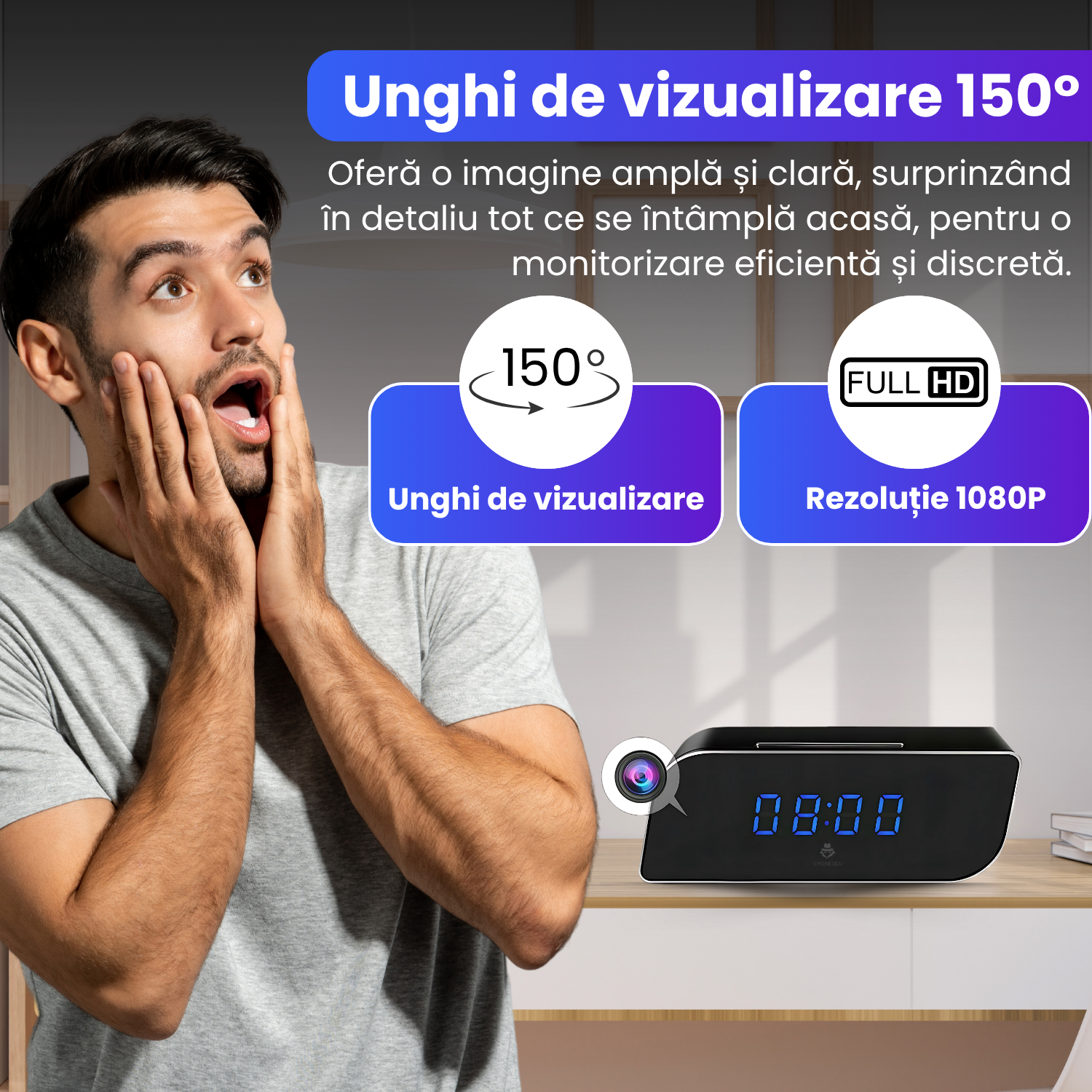 Discretie completa: Integrata perfect intr-un ceas desteptator, camera este imposibil de detectat, oferindu-va supraveghere fara a atrage atentia asupra ei. Este ideala pentru monitorizare discreta atat acasa, cat si la birou.