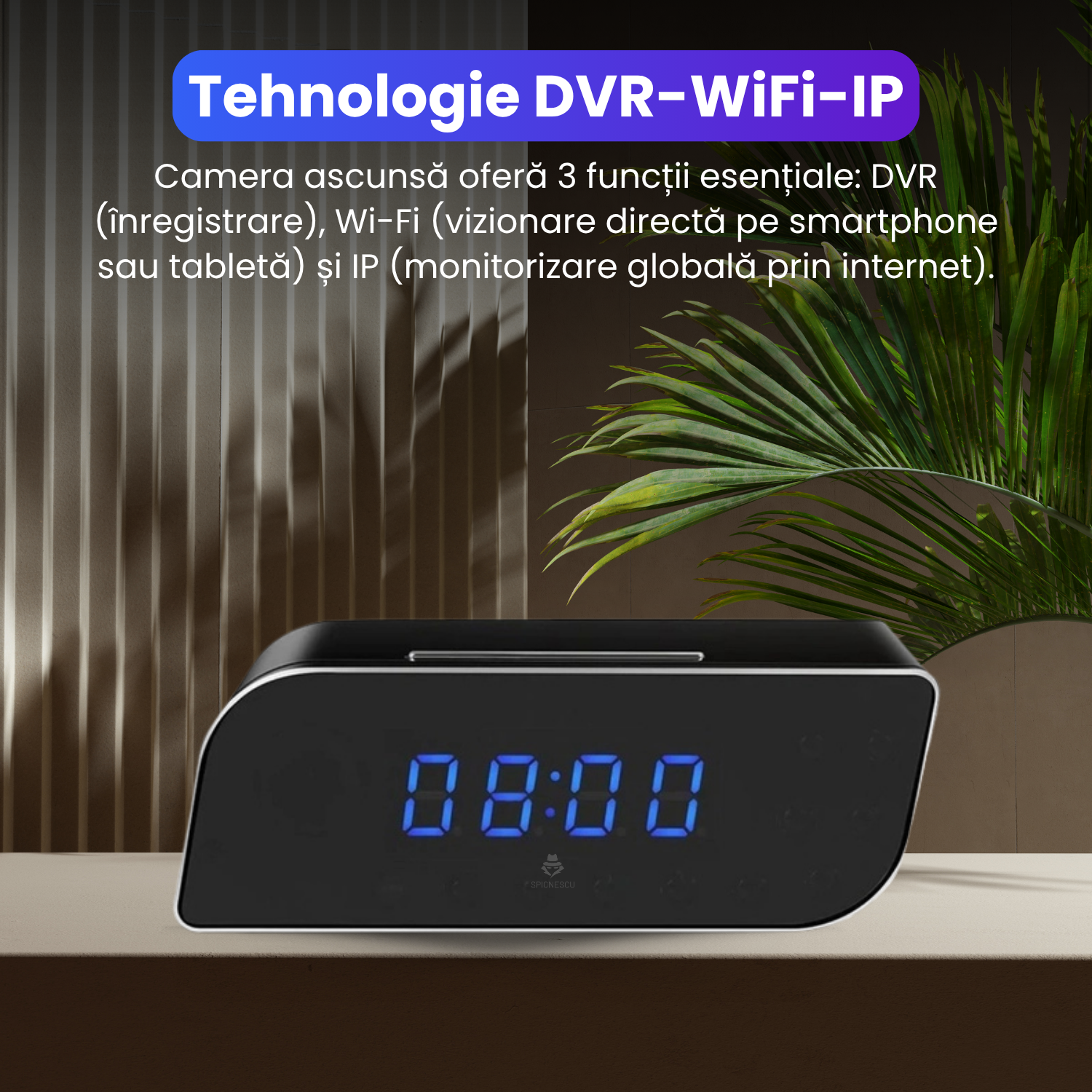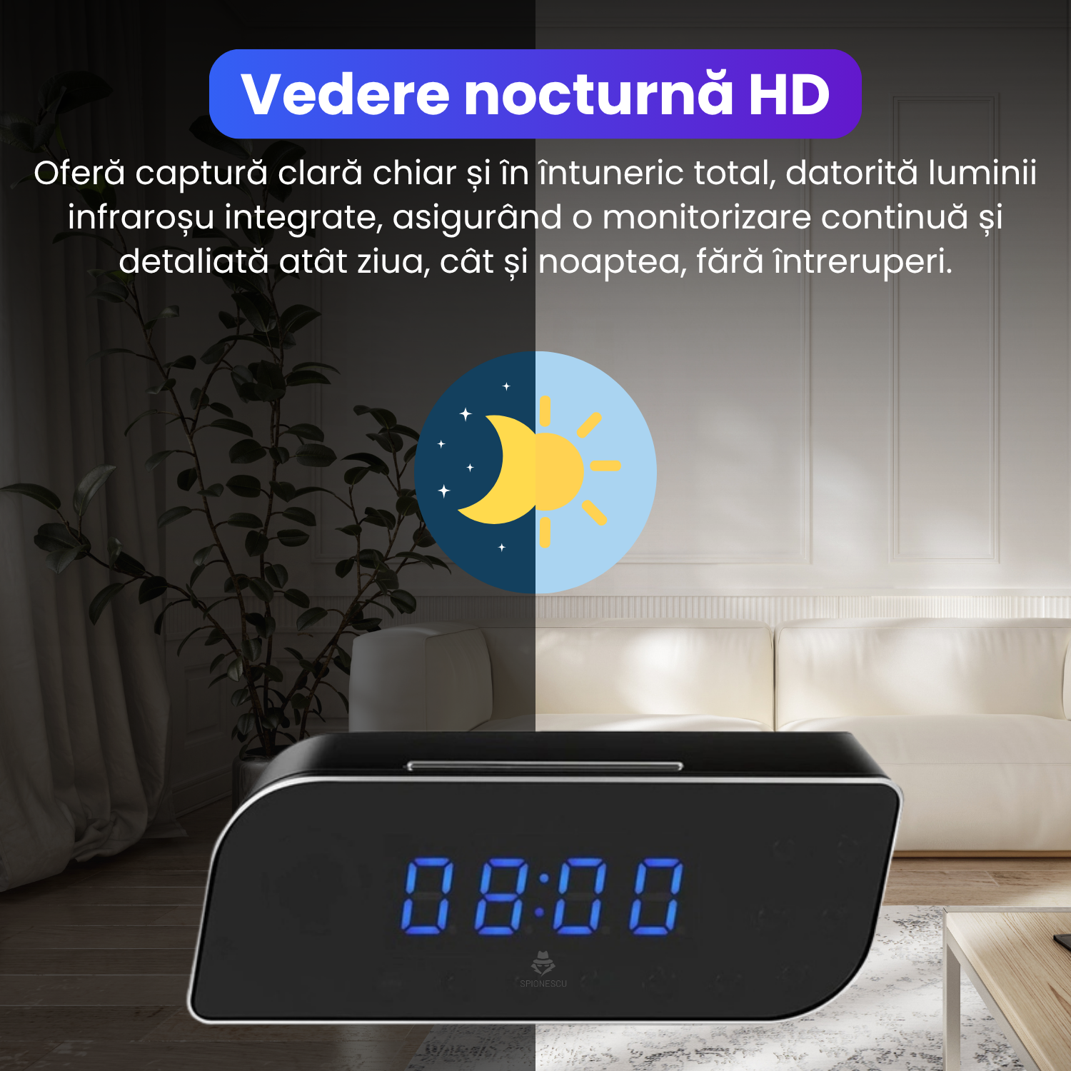 Aceasta functionalitate autentica mascheaza complet scopul real al produsului – un dispozitiv de supraveghere avansat. Ceasul ascunde o camera spy de inalta calitate, dar pentru oricine altcineva, ramane un simplu ceas de birou cu alarma si calendar.