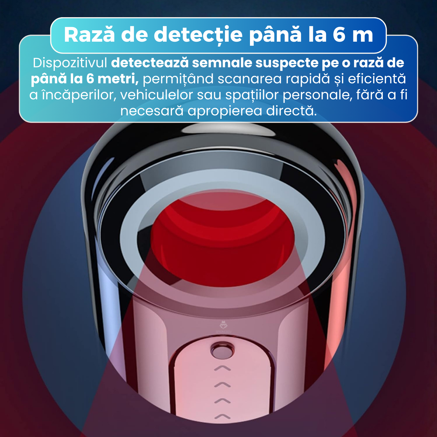 Cu o raza de detectie extinsa, dispozitivul permite scanarea rapida a incaperilor si vehiculelor fara a fi necesara apropierea directa de sursa. Aceasta caracteristica face verificarea mai eficienta si mai discreta.